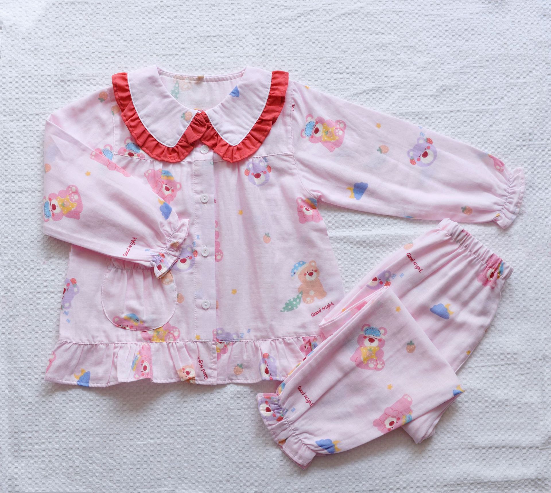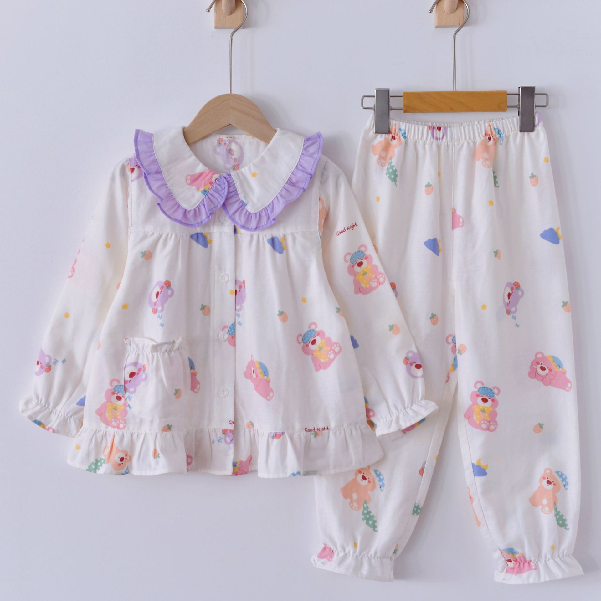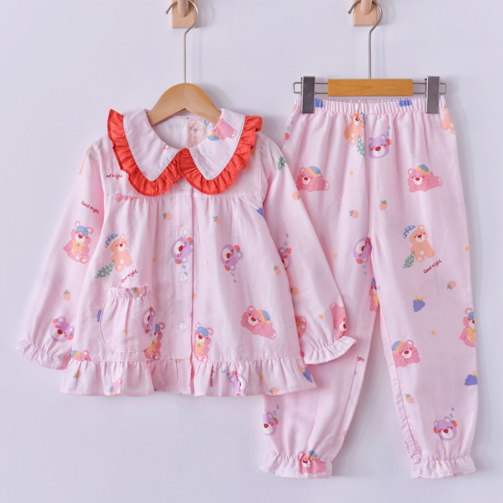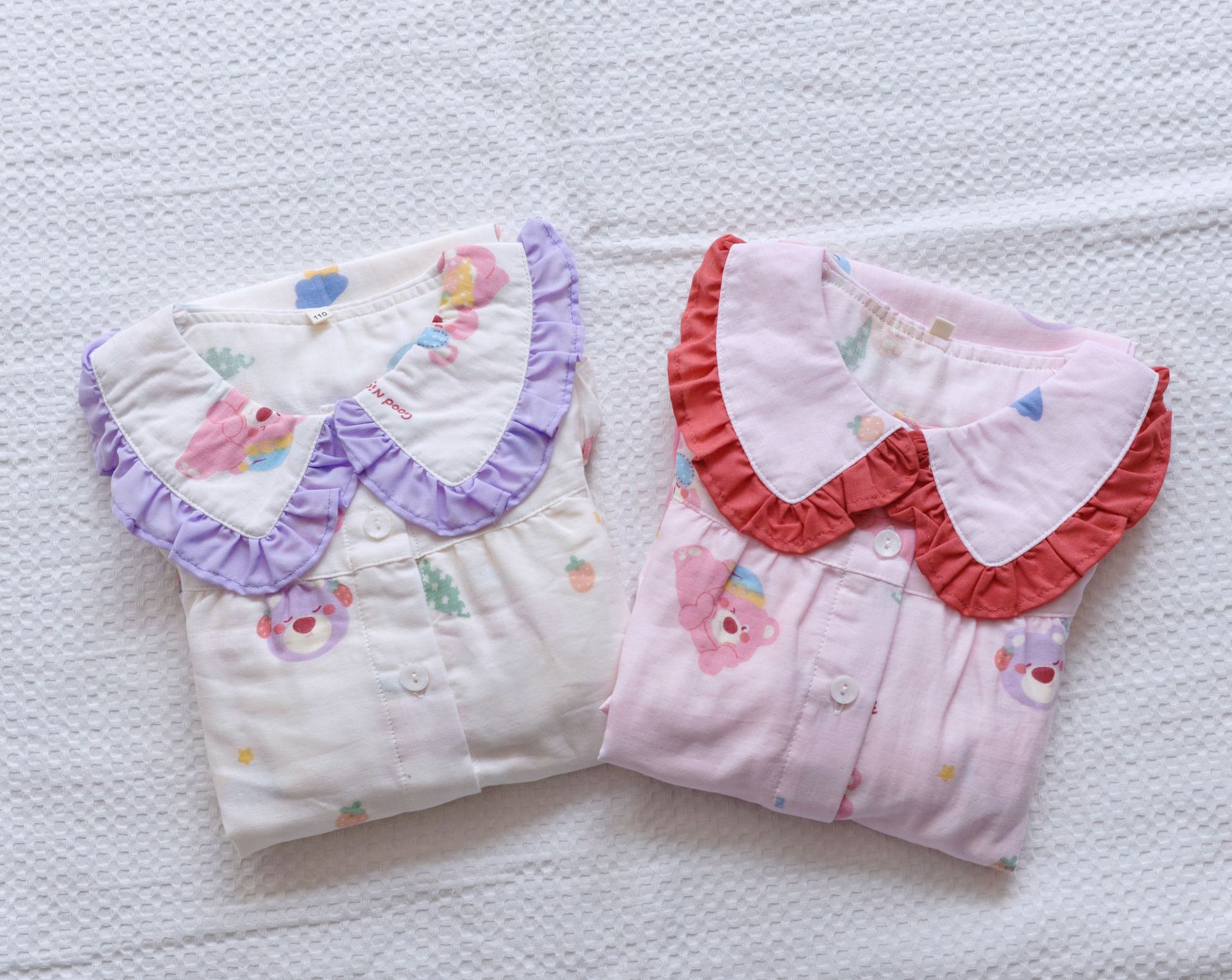 봄과 가을 새로운 면 소녀 인형 칼라 옷깃 긴 소매 면 거즈 만화 딸기 아기 집 옷 세트스토어 가기
