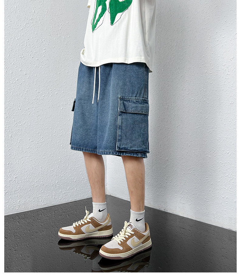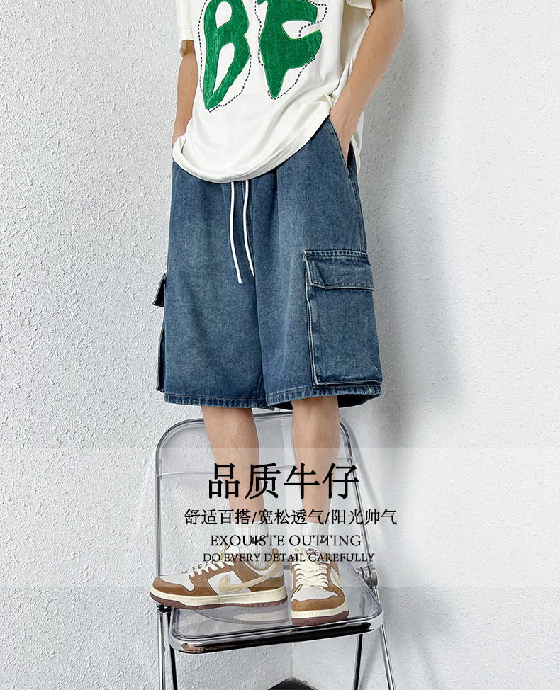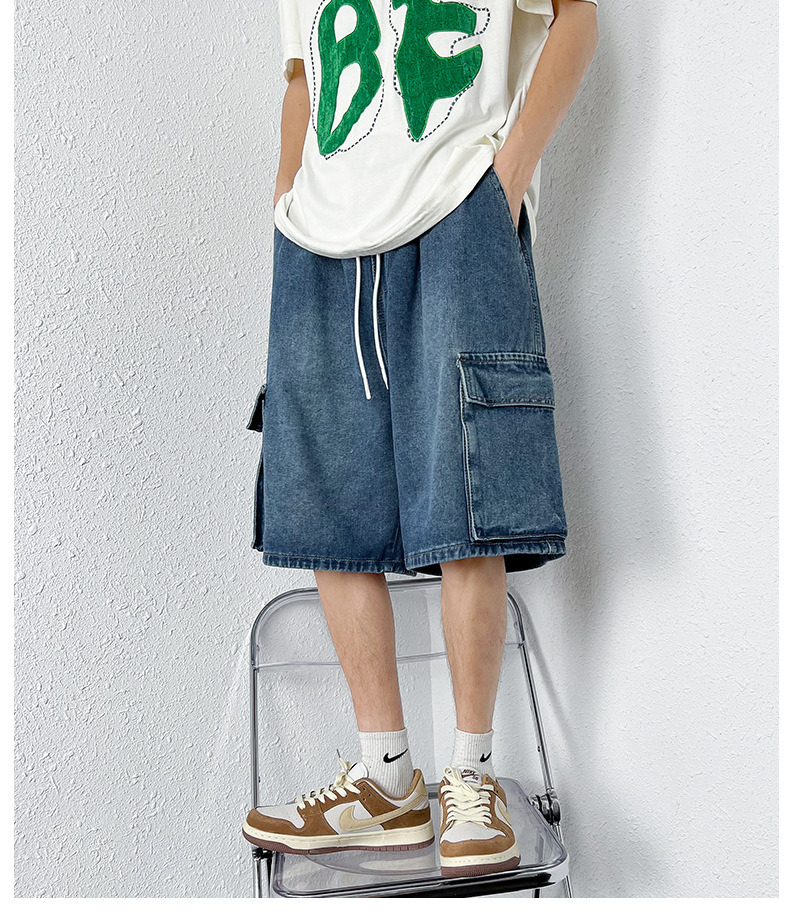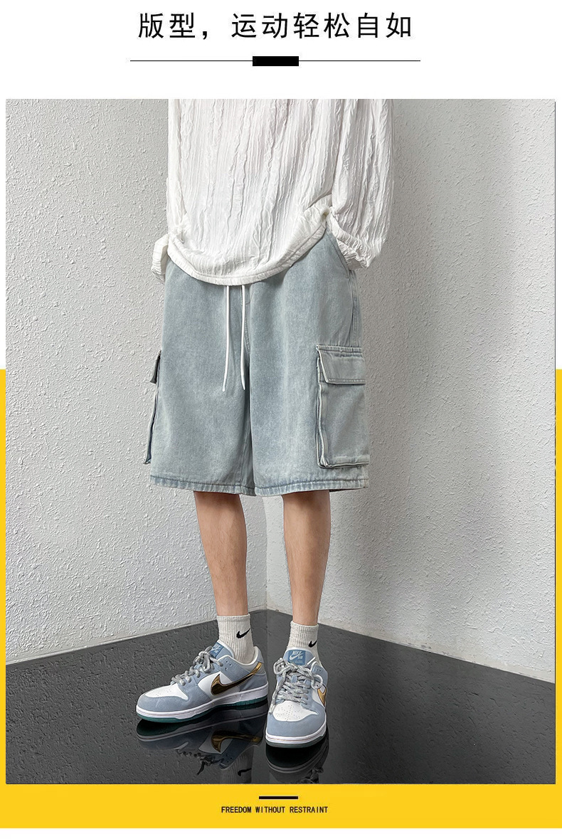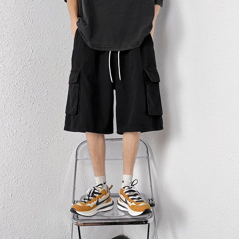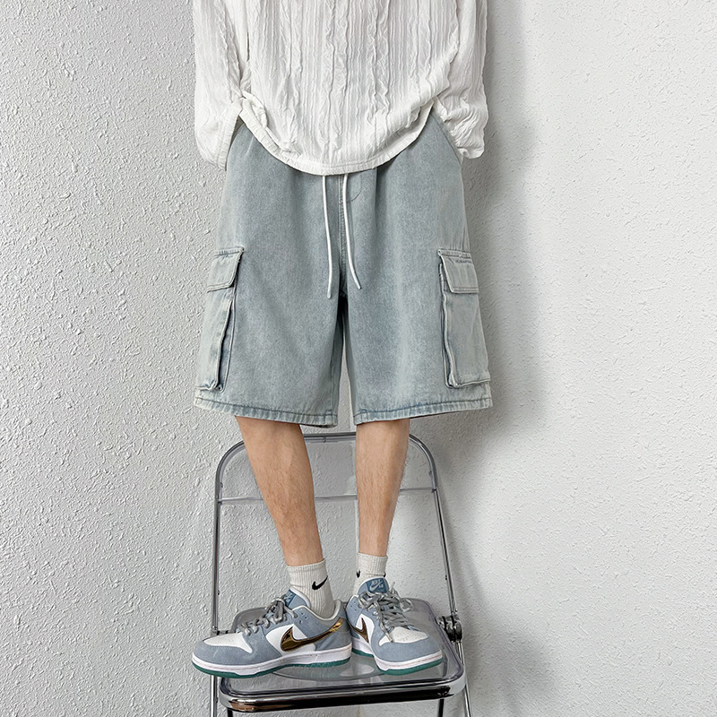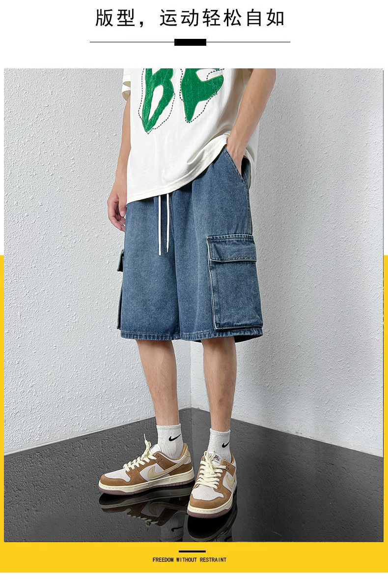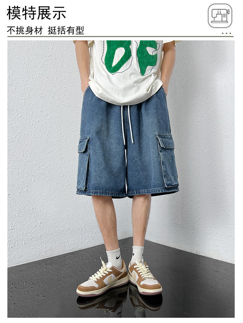 홍콩 스타일 BF 데님 반바지 남성 여름 유행 브랜드 스트레이트 캐주얼 작업복 중간 길이 바지 멀티 포켓 와이드 레그 하프 길이 바지스토어 가기