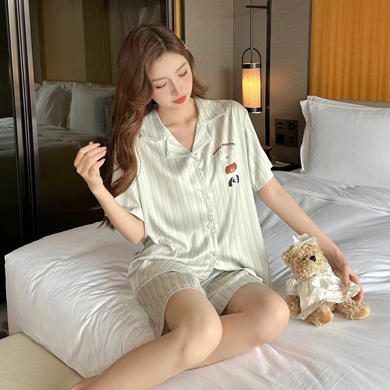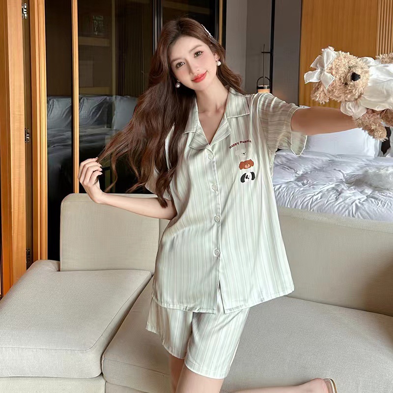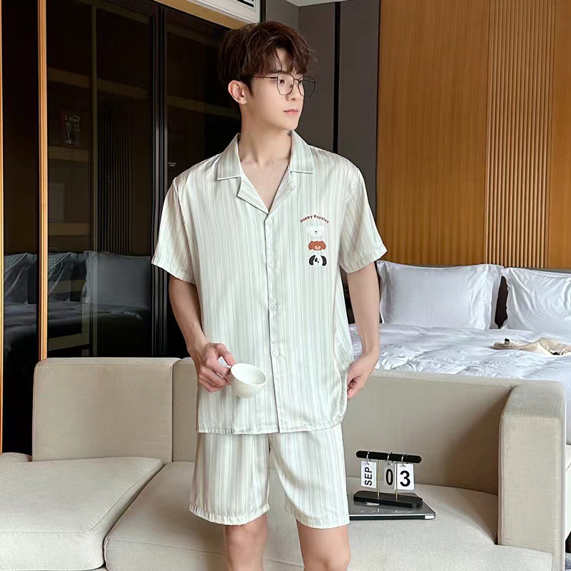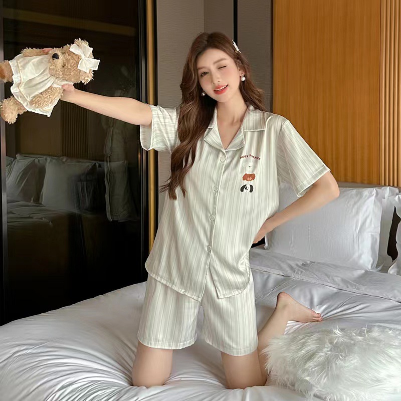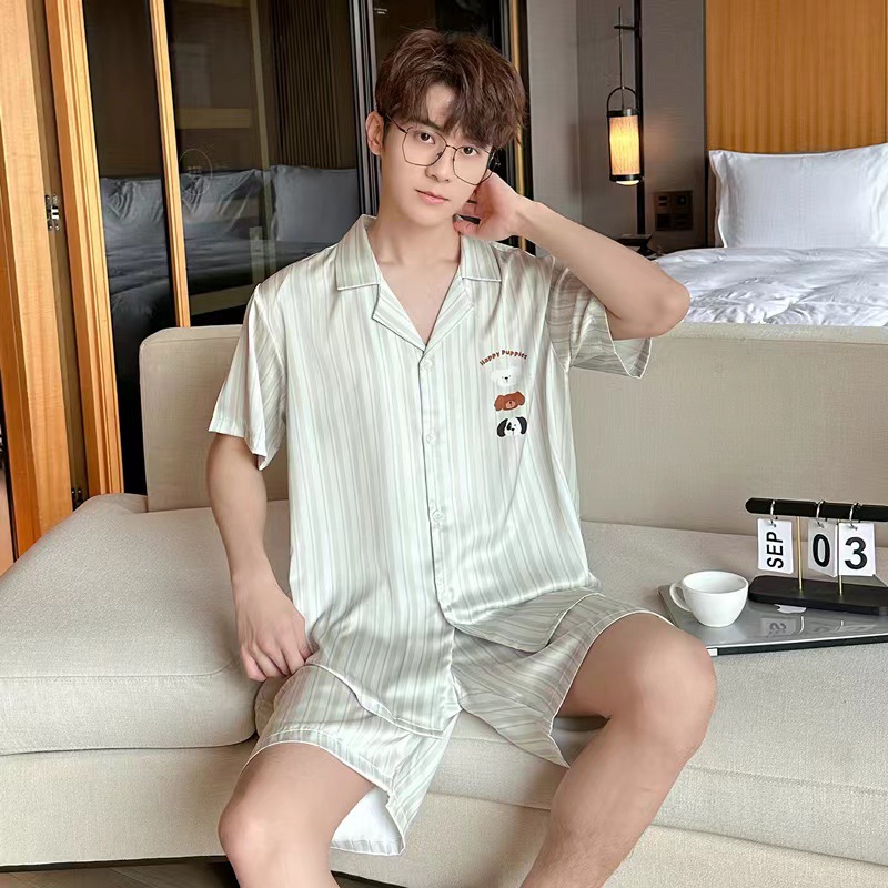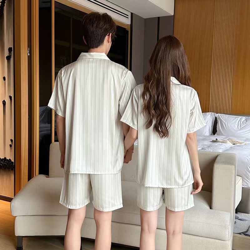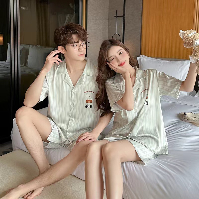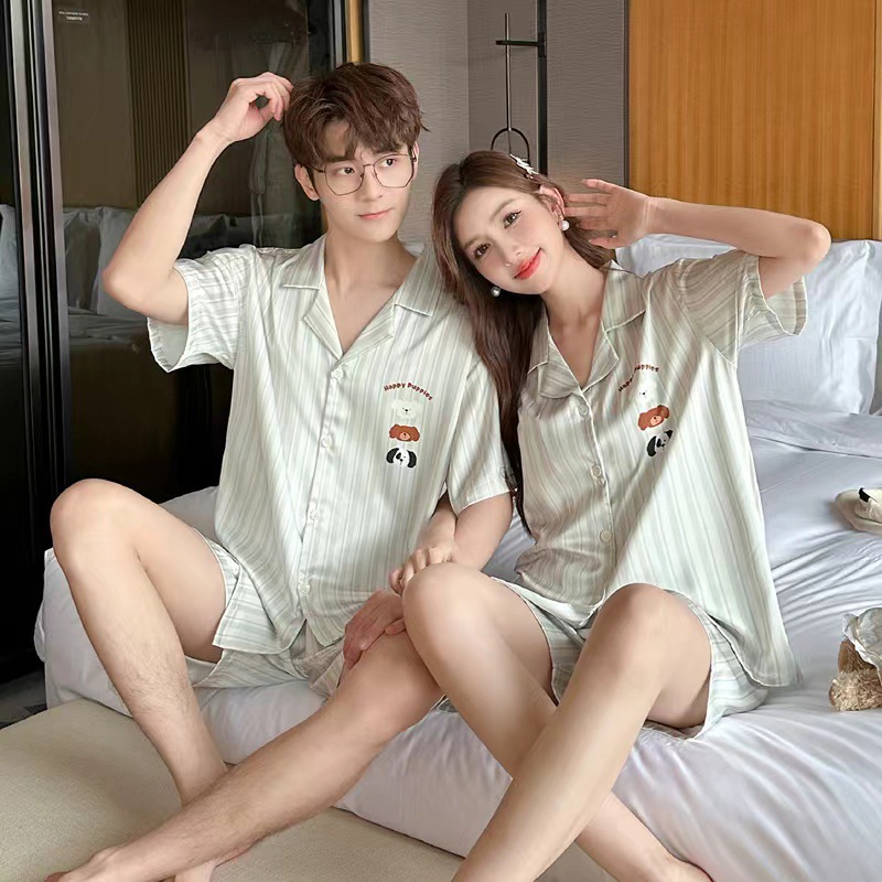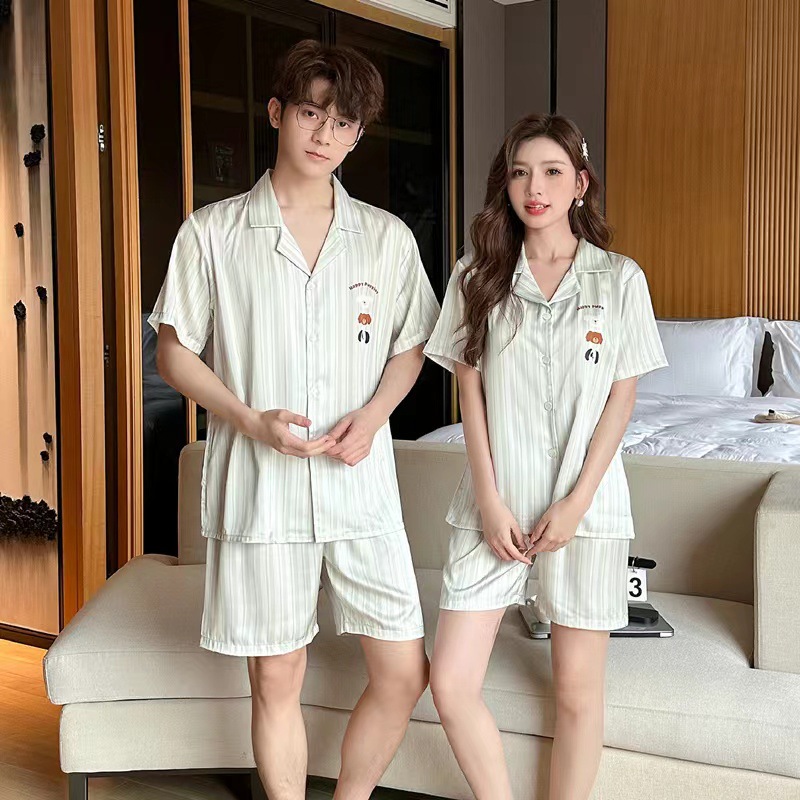 2024 여름 커플 잠옷 여성용 아이스 실크 귀여운 달콤한 반팔 바지 홈 옷 소년 느슨한 캐주얼스토어 가기