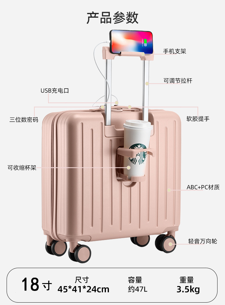 18인치 탑승용 캐리어 가방, 학생용 20inch 여행용 캐리어, 앞면 개방형 비밀번호 잠금 여행 가방