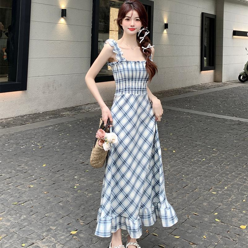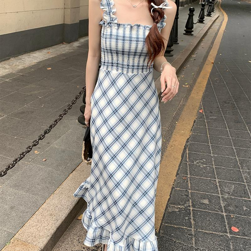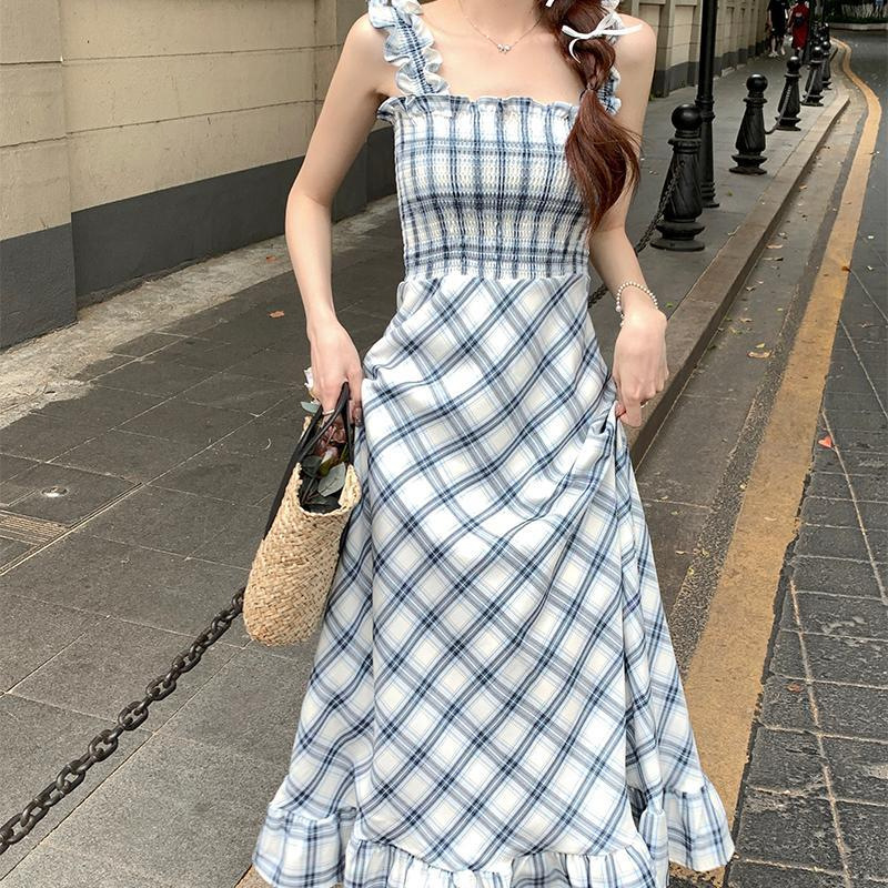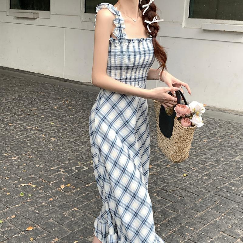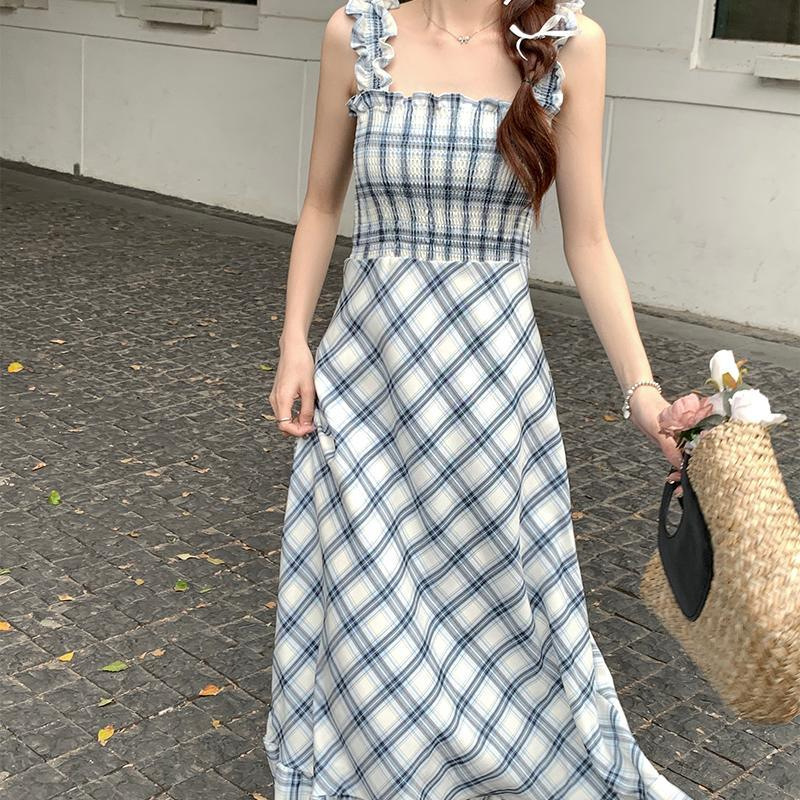 봄과 가을 새로운 통근 광장 칼라 높은 허리 슬림 긴 원피스 민소매 격자 무늬 슬립 원피스스토어 가기