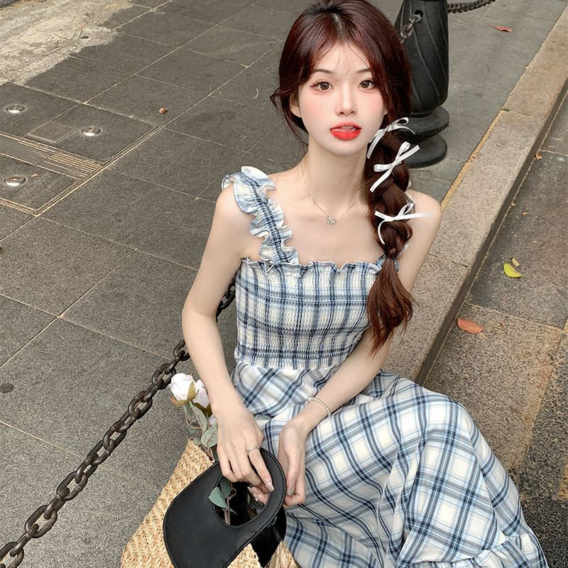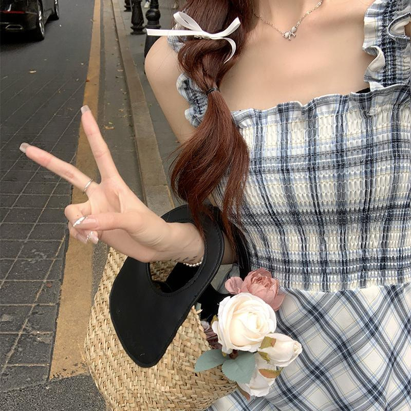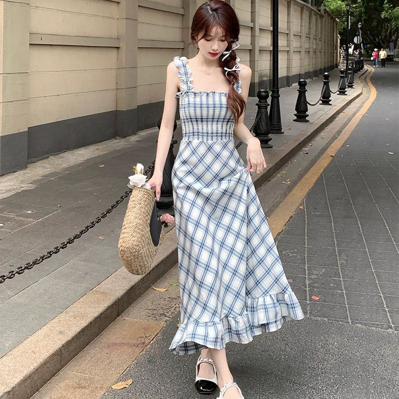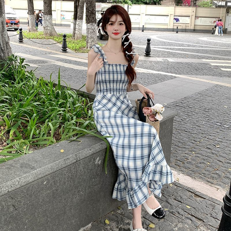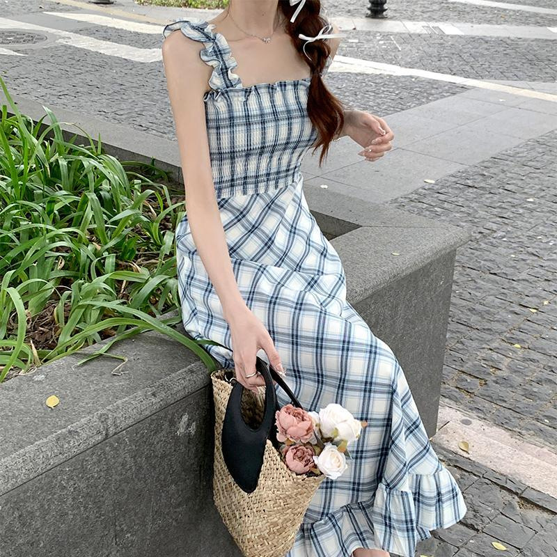 봄과 가을 새로운 통근 광장 칼라 높은 허리 슬림 긴 원피스 민소매 격자 무늬 슬립 원피스스토어 가기