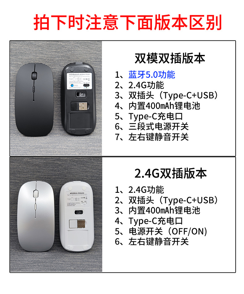 재고 도매 듀얼 플러그 듀얼 모드 2.4G 충전식 마우스 Type-C A 포트 BT5.0 블루투스 무선 마우스스토어 가기