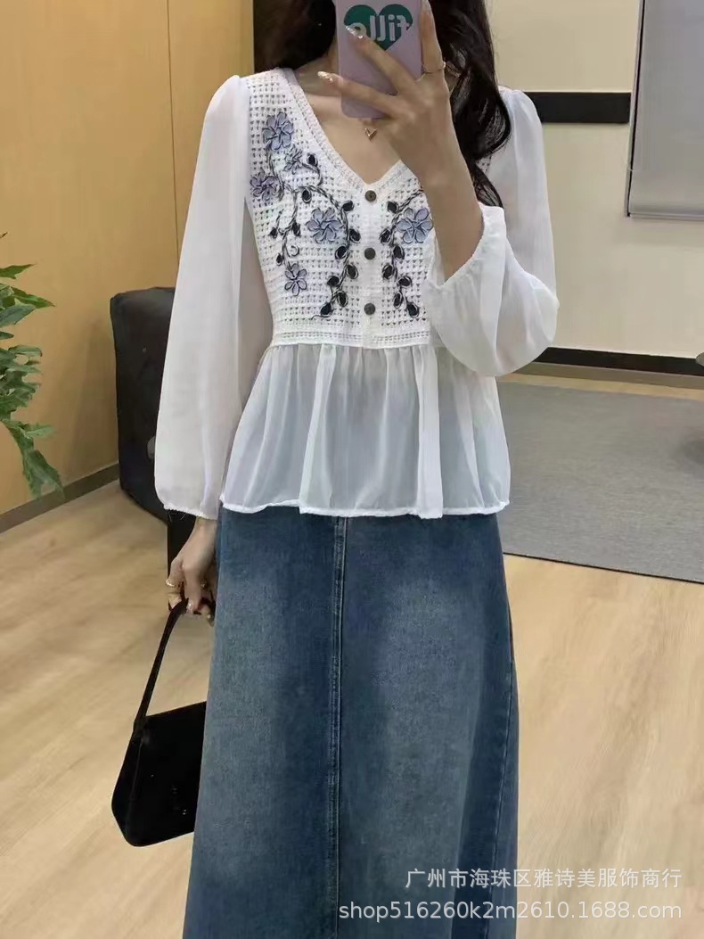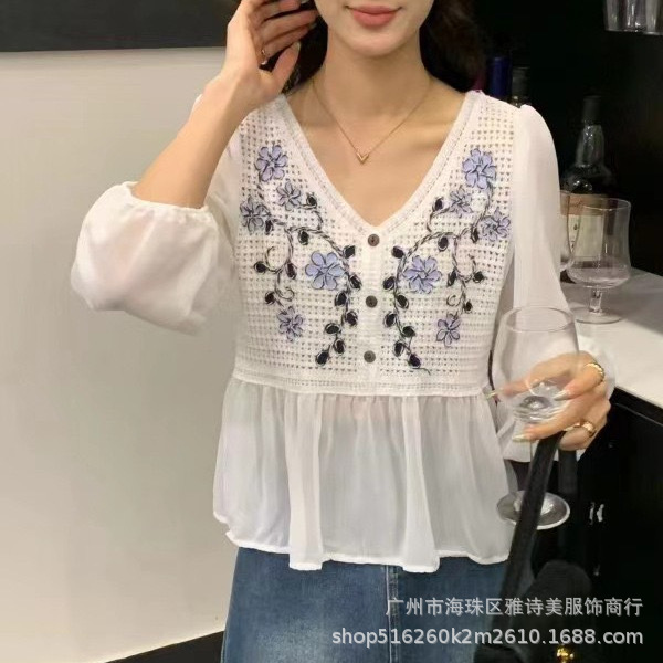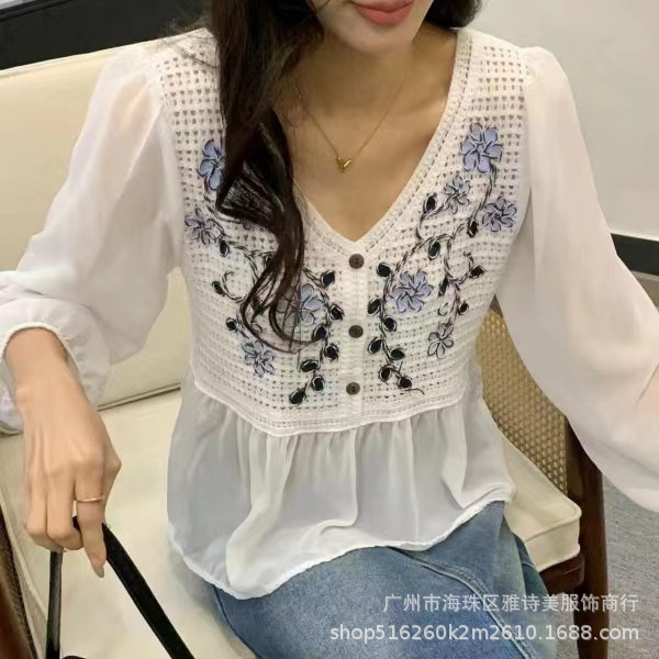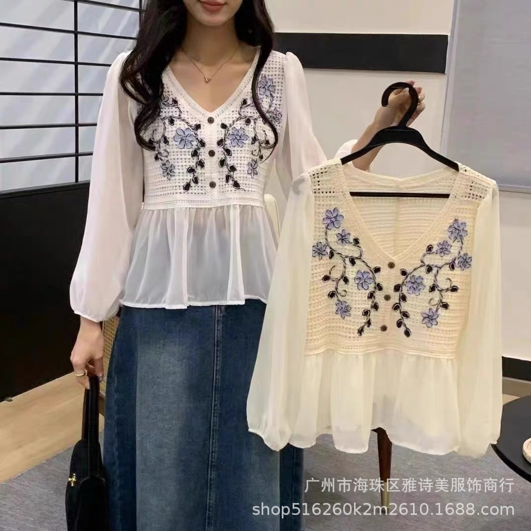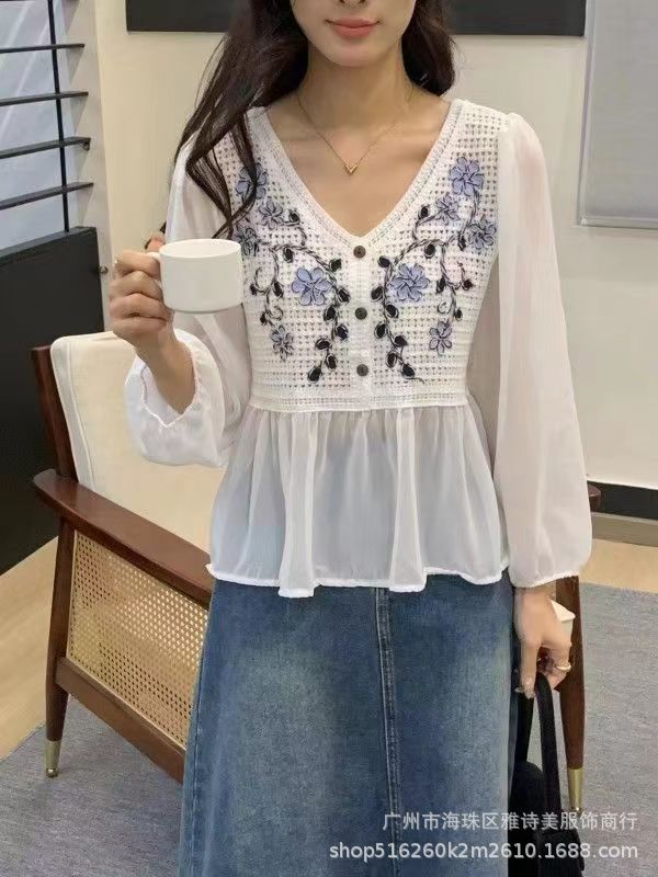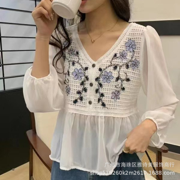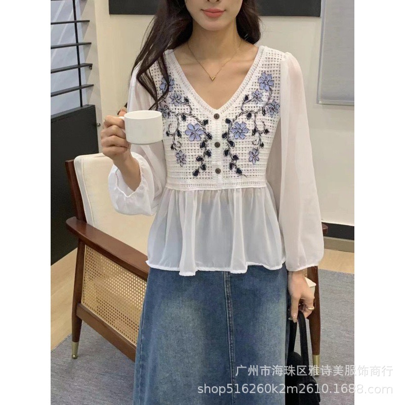 한국식 하이 엔드 센스 패션 바느질 얇은 퍼프 슬리브 쉬폰 셔츠 여성의 프랑스 달콤한 세련된 외국 스타일 탑스토어 가기