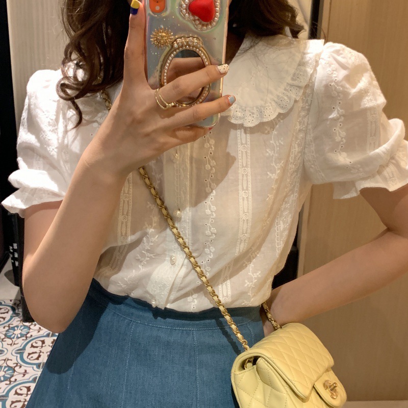 2025 여름 새 스타일 프랑스 인형 칼라 레이스 반팔 셔츠 여성 수 놓은 느슨한 복고풍 화이트 탑 유행스토어 가기