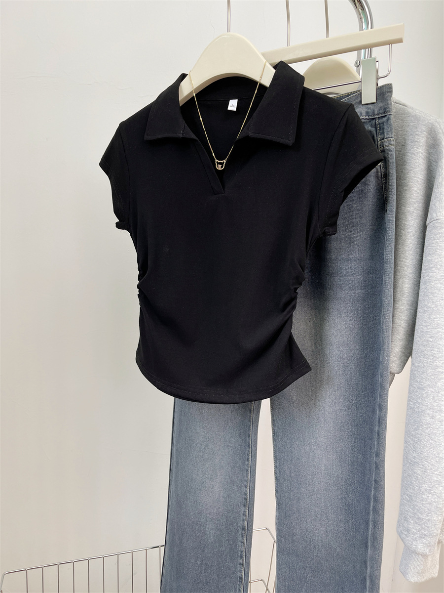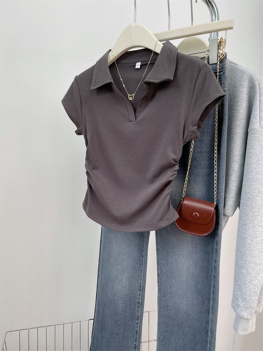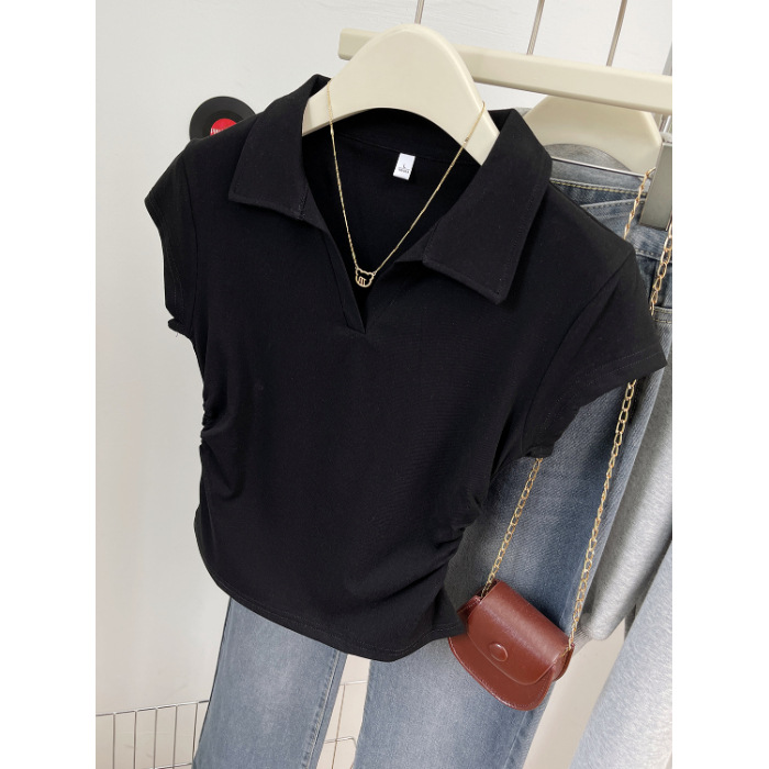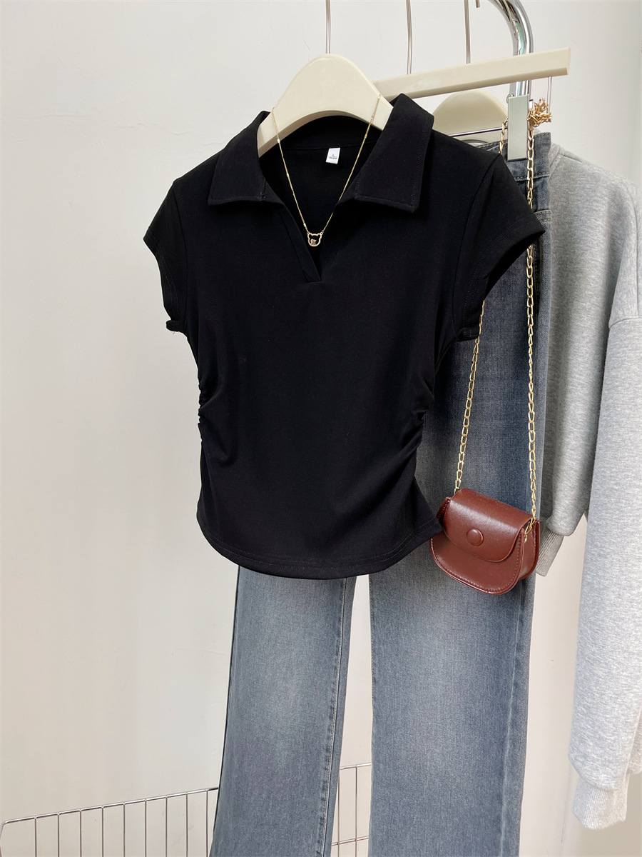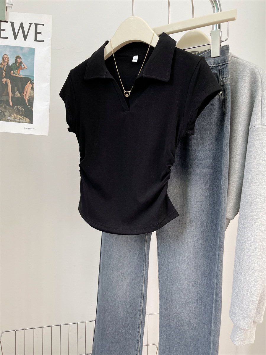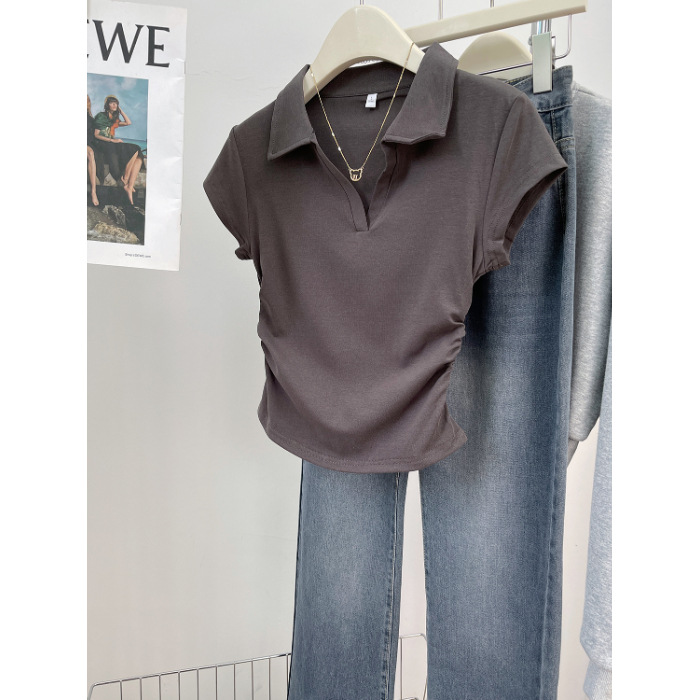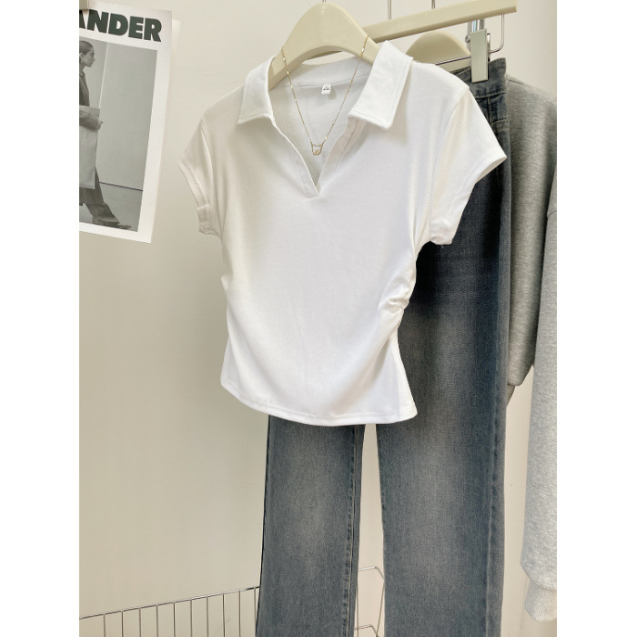 아메리칸 스타일 짧은 폴로 칼라 어깨 티셔츠 여성용 짧은 소매 여름 Pleated 허리 타이트 핫 소녀 탑 트렌디베이스 셔츠