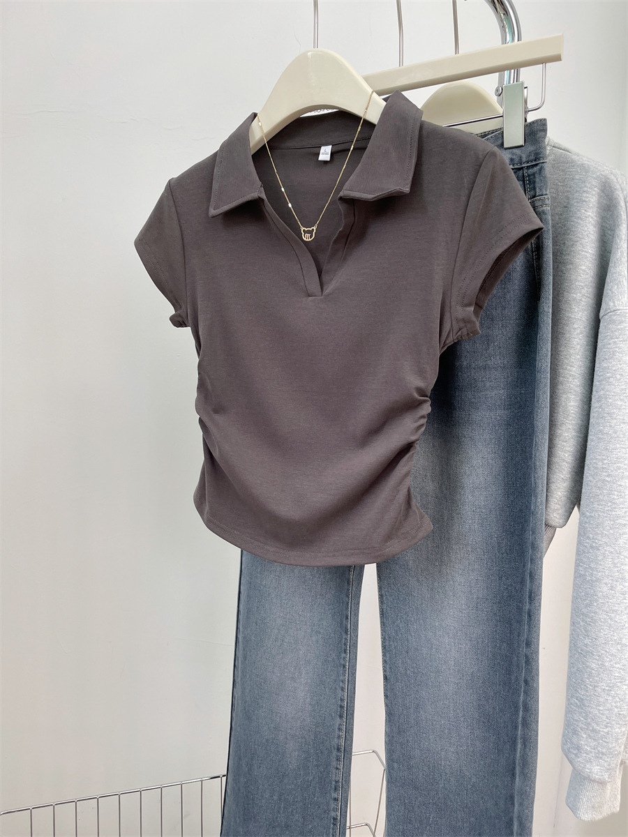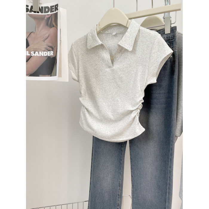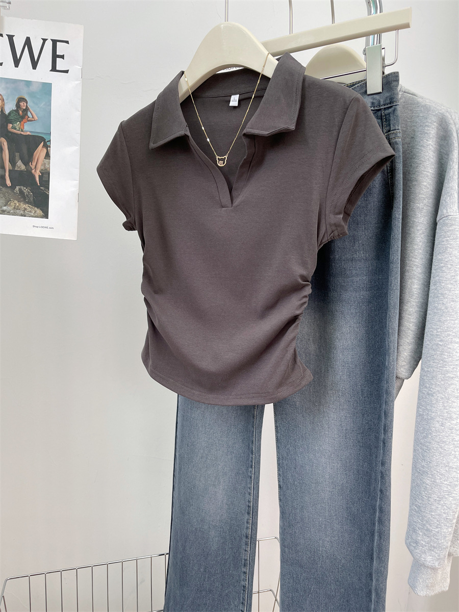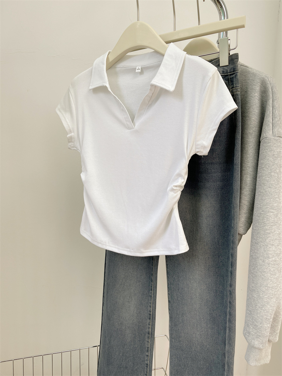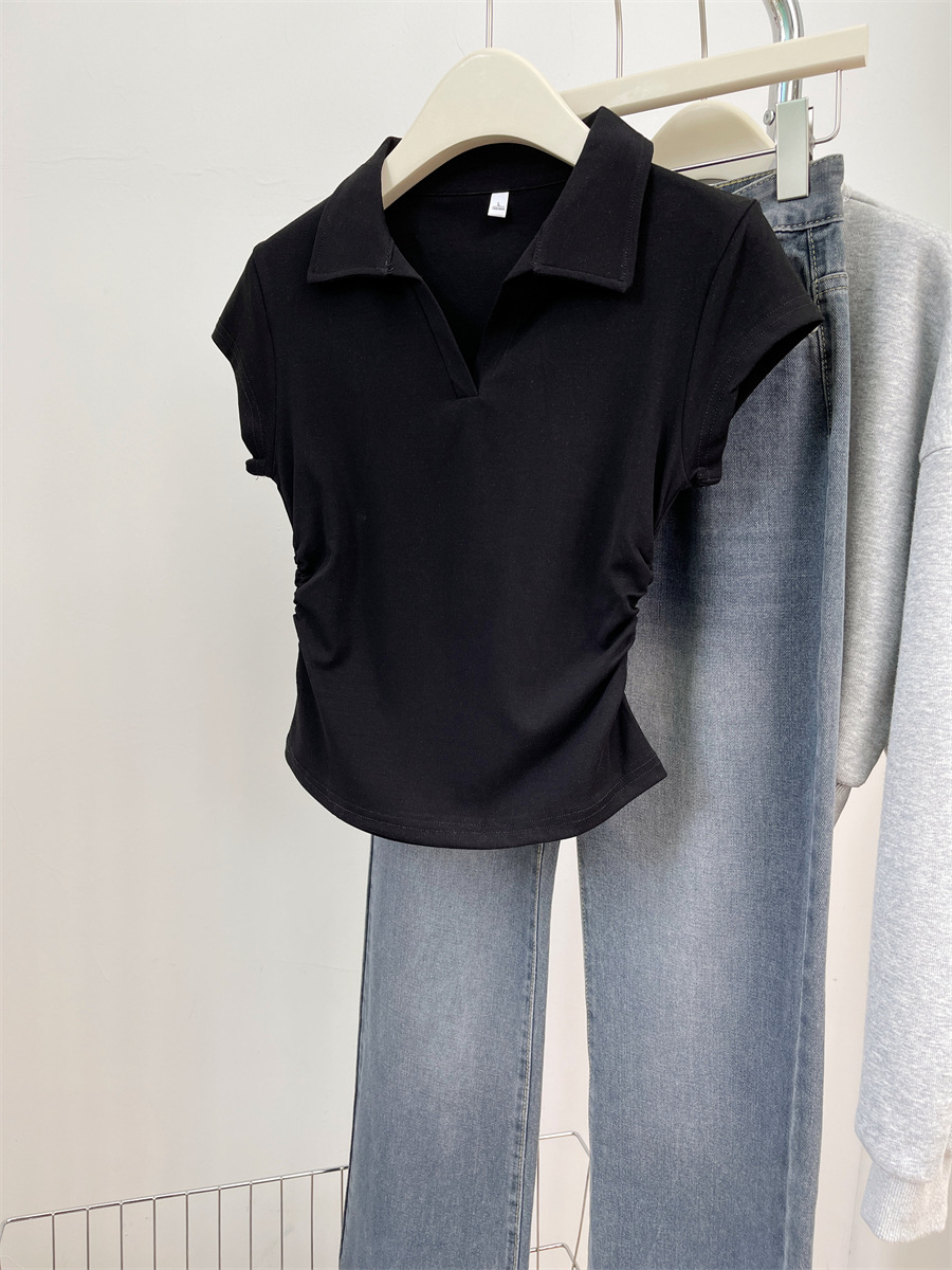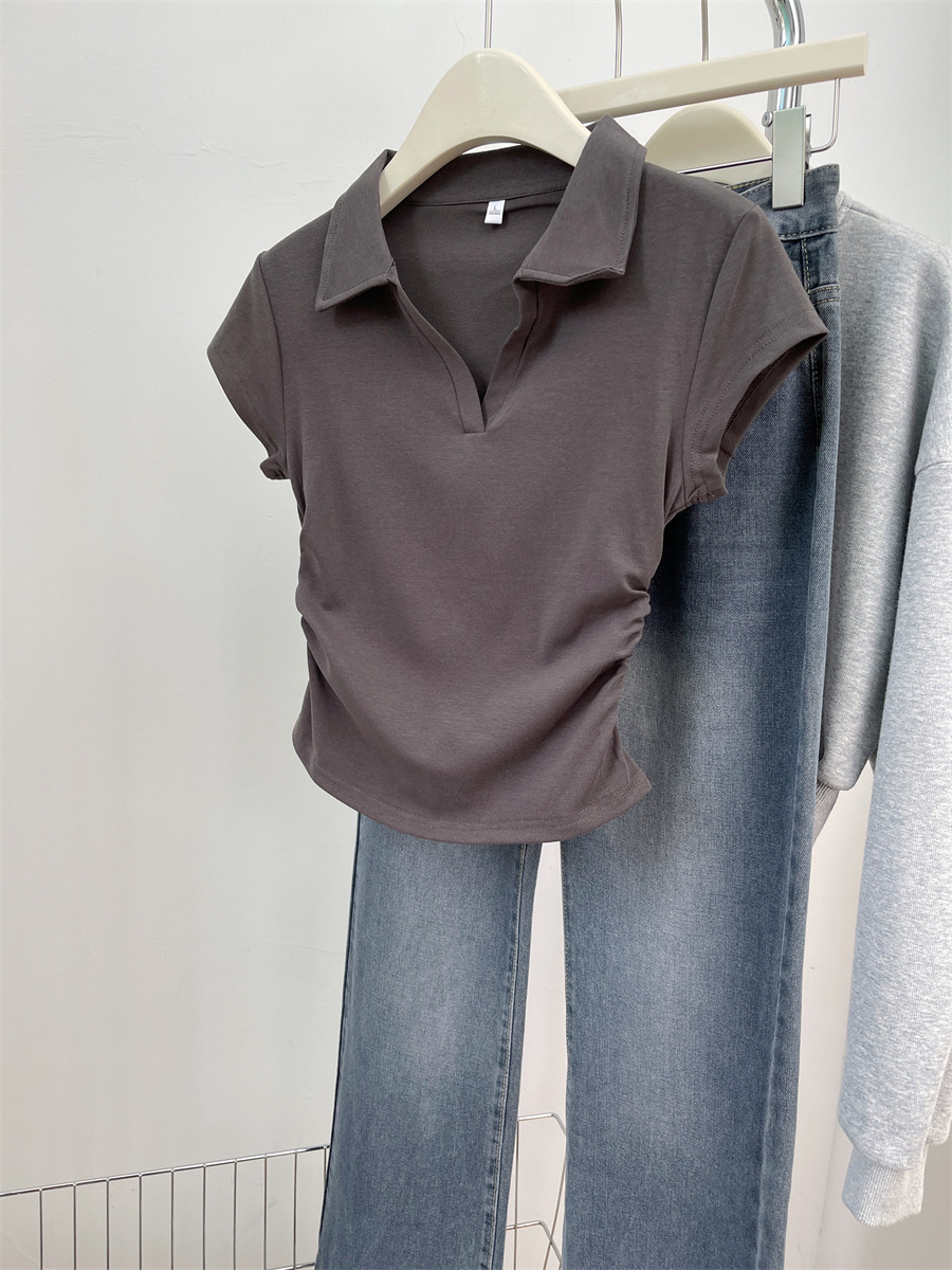 아메리칸 스타일 짧은 폴로 칼라 어깨 티셔츠 여성용 짧은 소매 여름 Pleated 허리 타이트 핫 소녀 탑 트렌디베이스 셔츠