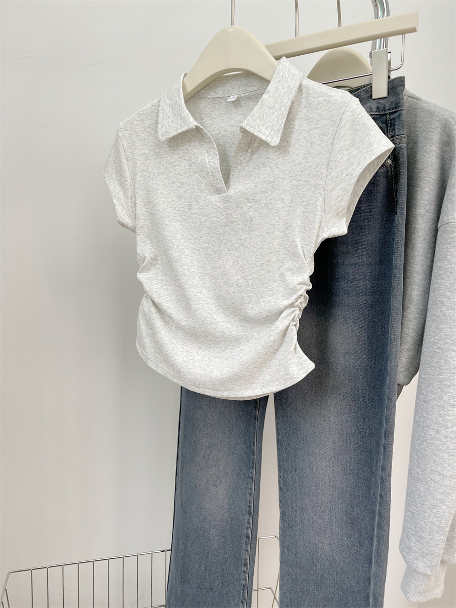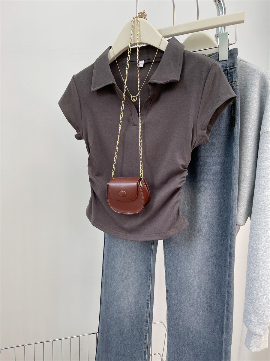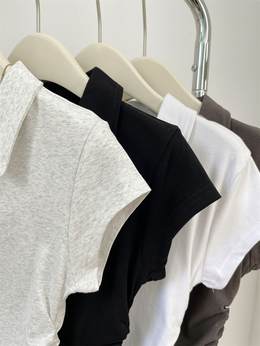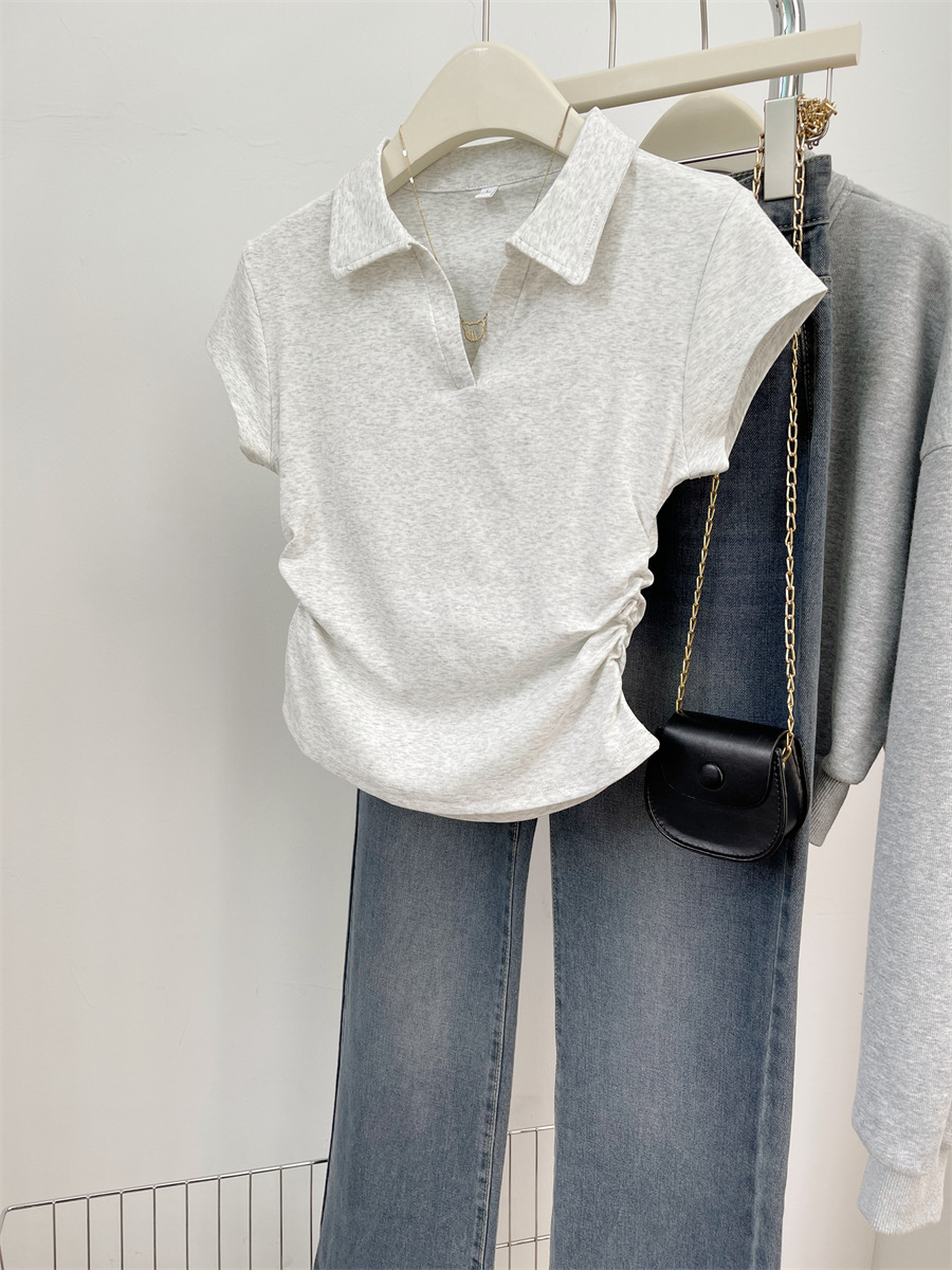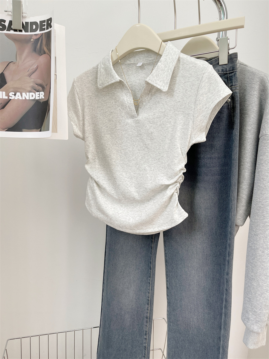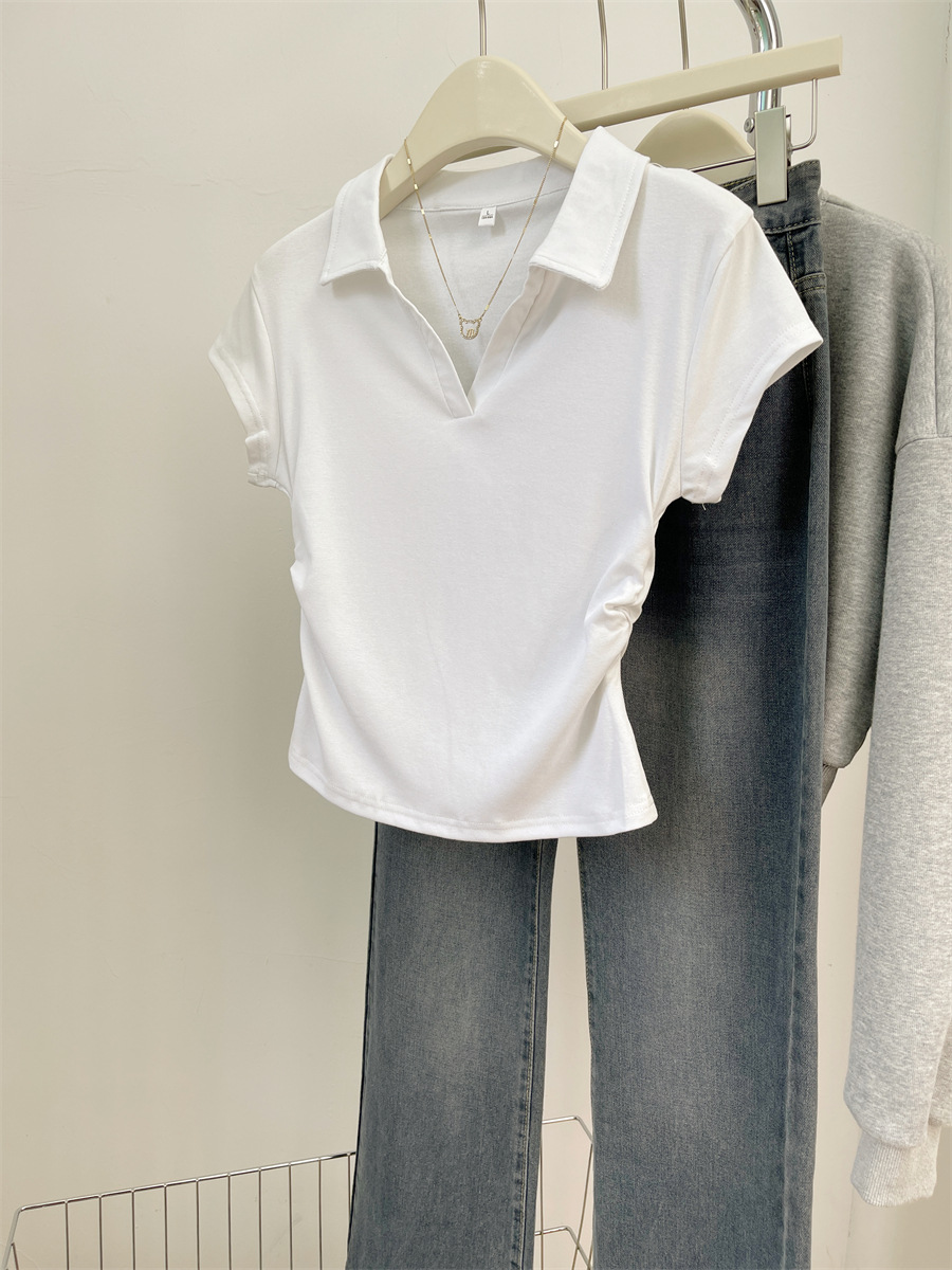 아메리칸 스타일 짧은 폴로 칼라 어깨 티셔츠 여성용 짧은 소매 여름 Pleated 허리 타이트 핫 소녀 탑 트렌디베이스 셔츠