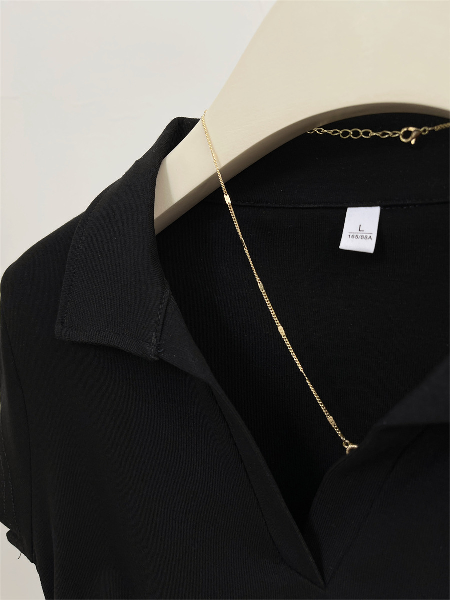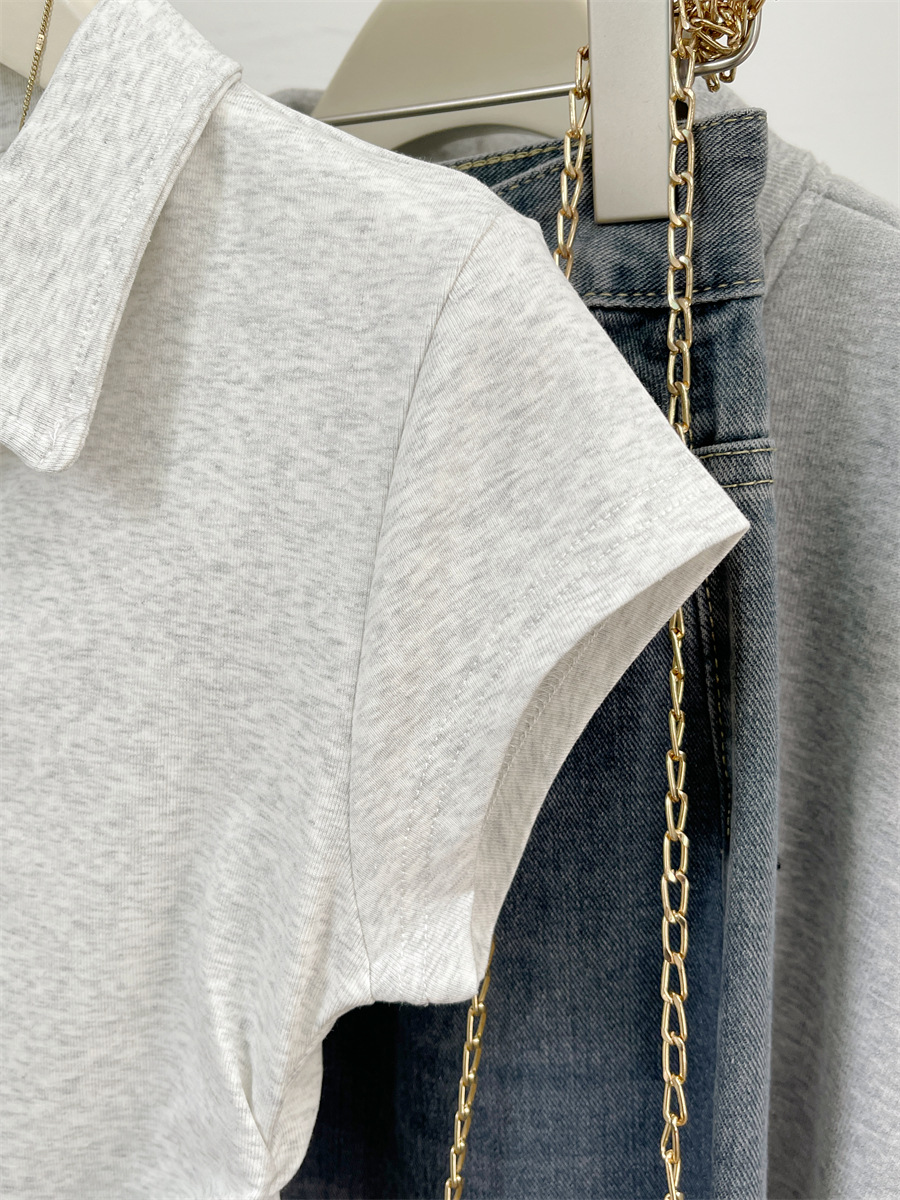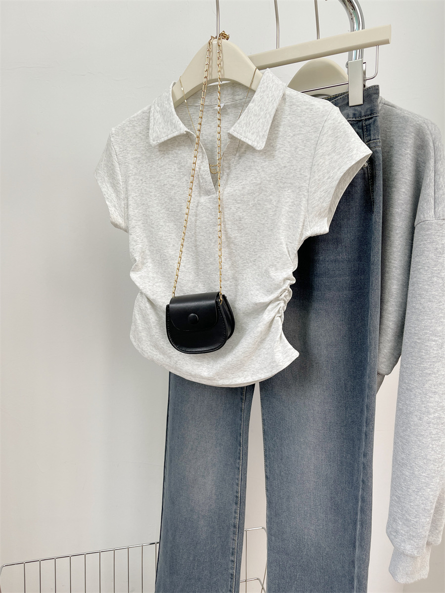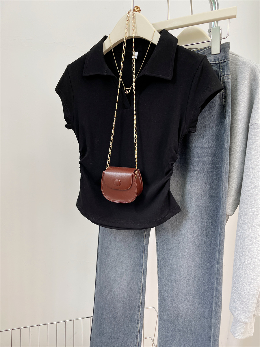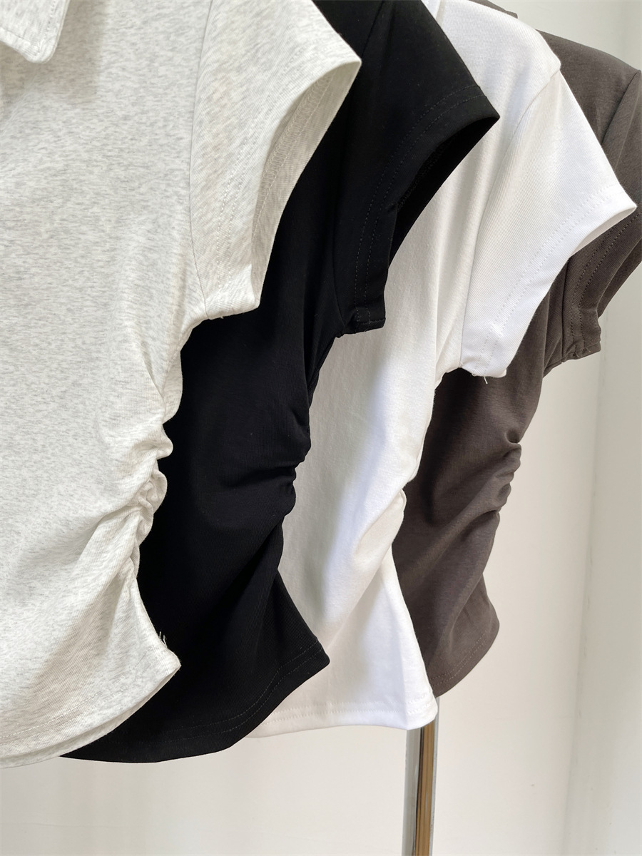아메리칸 스타일 짧은 폴로 칼라 어깨 티셔츠 여성용 짧은 소매 여름 Pleated 허리 타이트 핫 소녀 탑 트렌디베이스 셔츠