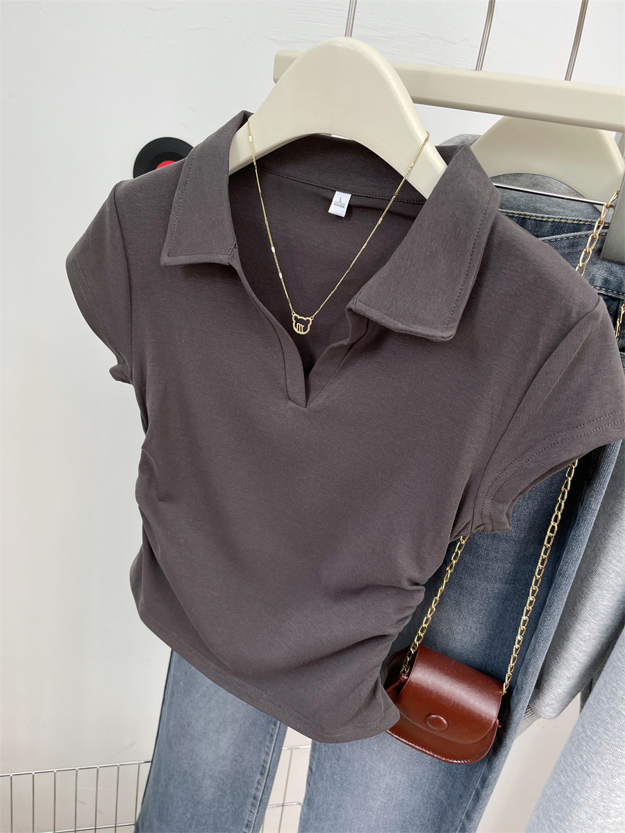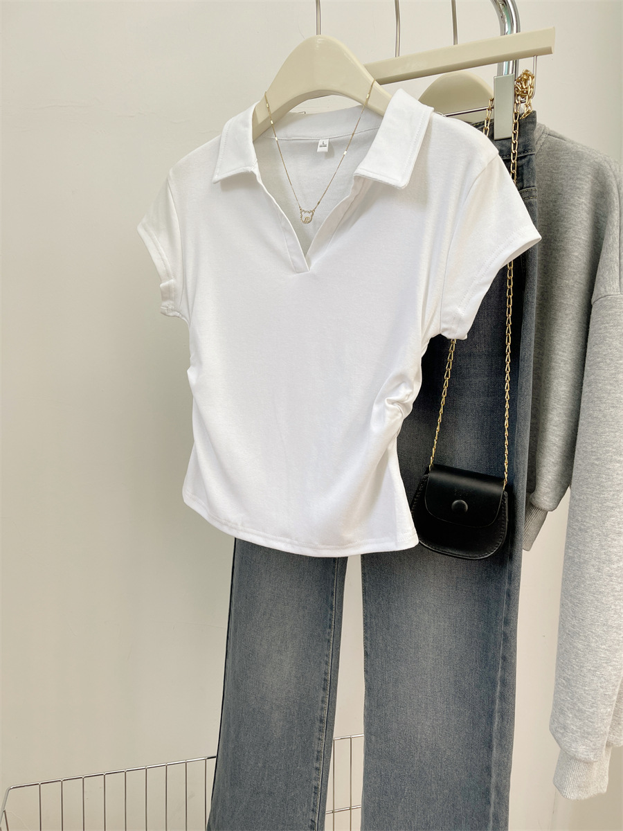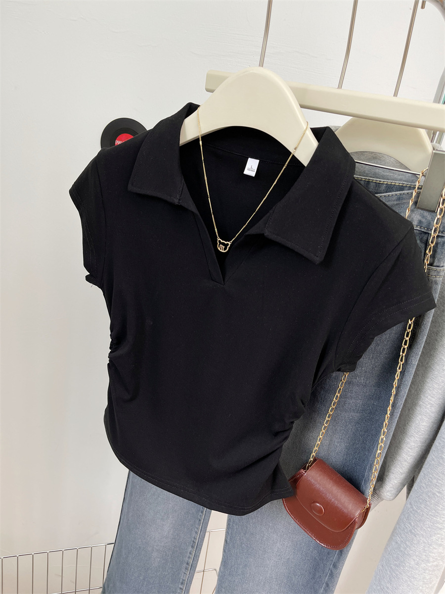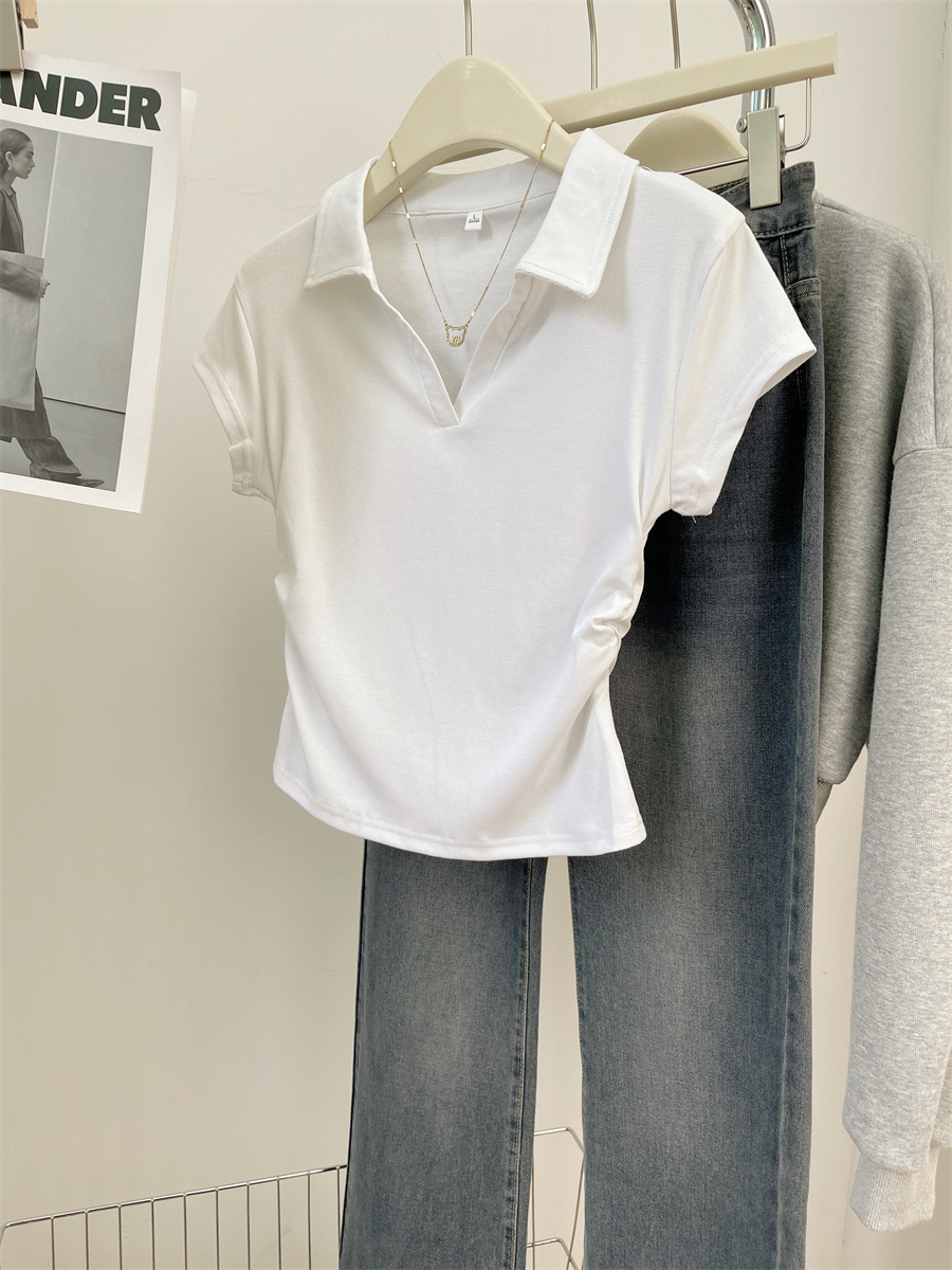 아메리칸 스타일 짧은 폴로 칼라 어깨 티셔츠 여성용 짧은 소매 여름 Pleated 허리 타이트 핫 소녀 탑 트렌디베이스 셔츠스토어 가기