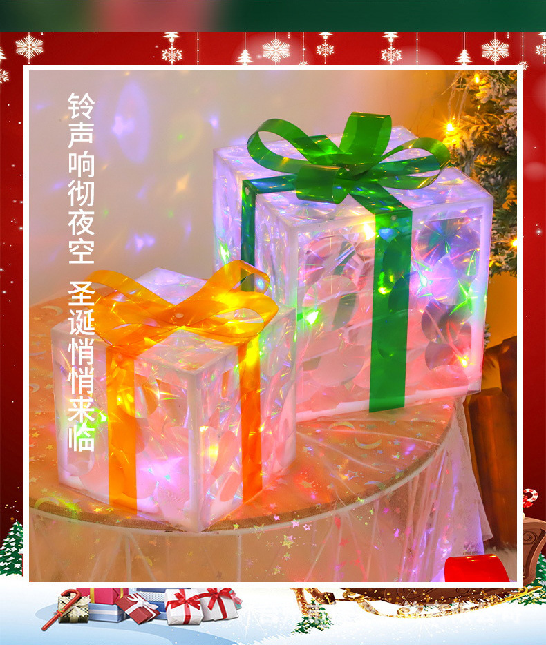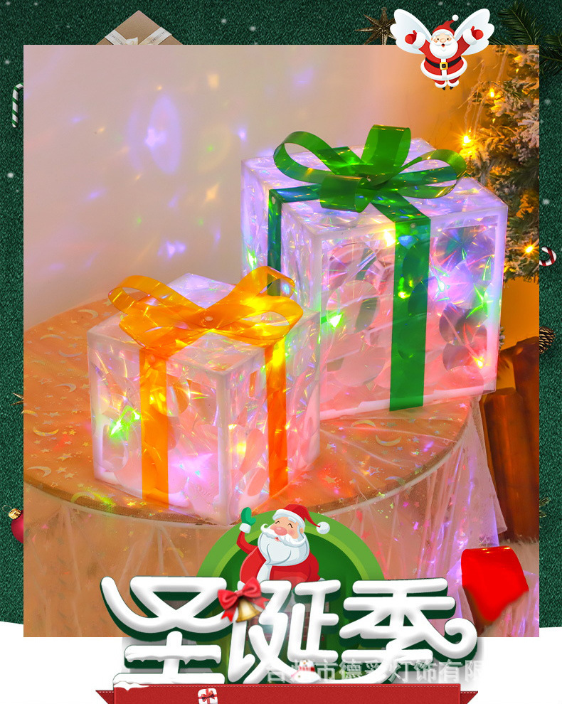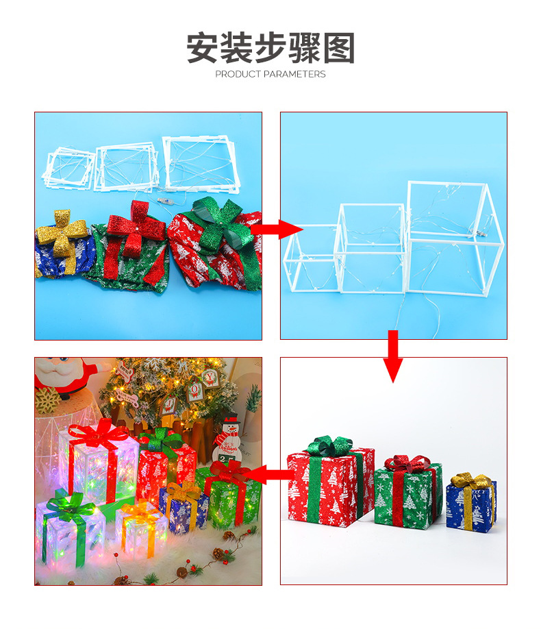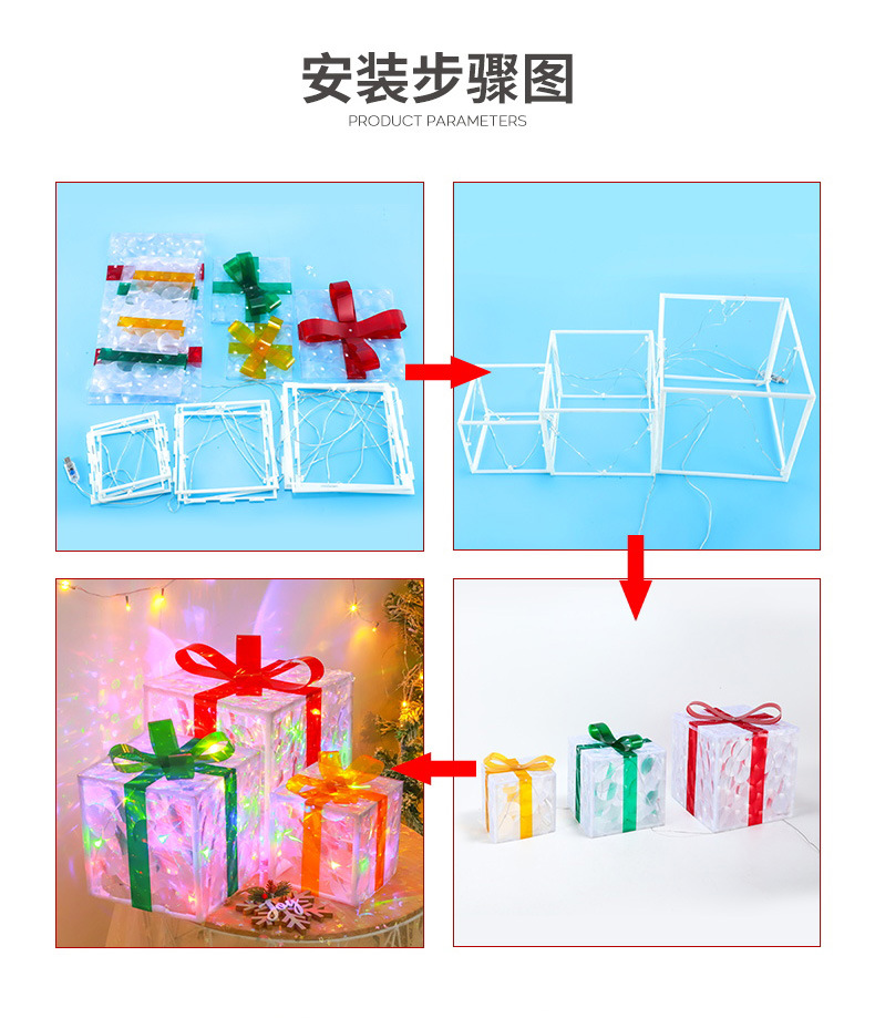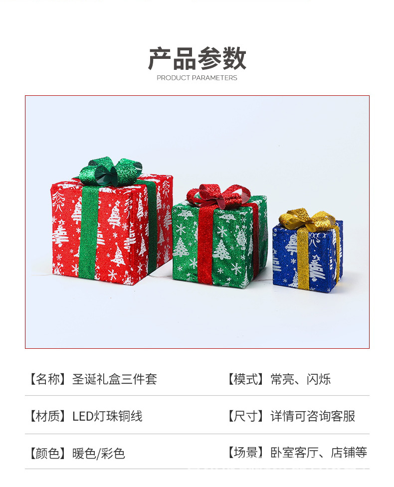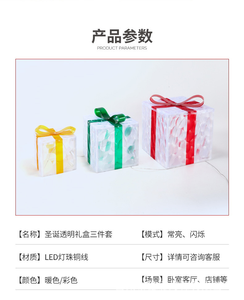 透明礼物盒、布艺雪花礼物盒:电池盒8功能,展开尺寸25*25*25,20*20*20,15*15*15cm, 蝴蝶结高度5cm左右, 礼物盒间距40cm,电源线50cm,皮线灯48灯。内包装尺寸26*26*7cm,0.8kg,20套一箱,外箱54x54x38cm, 17kg.