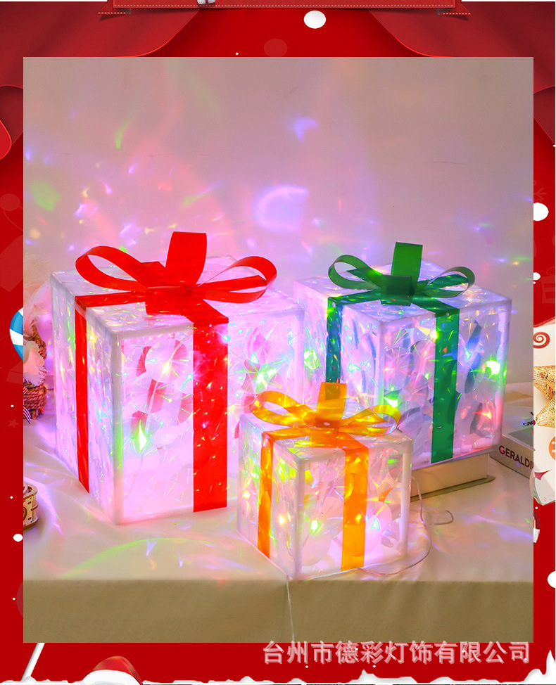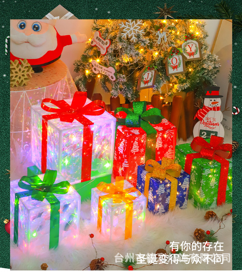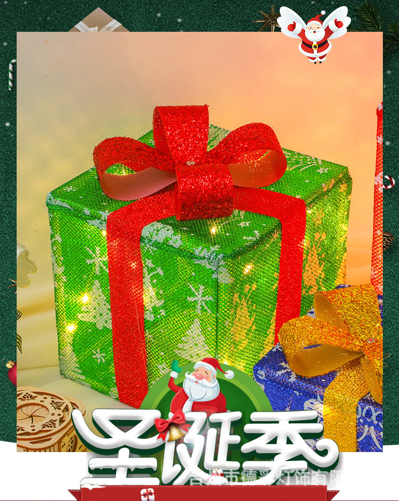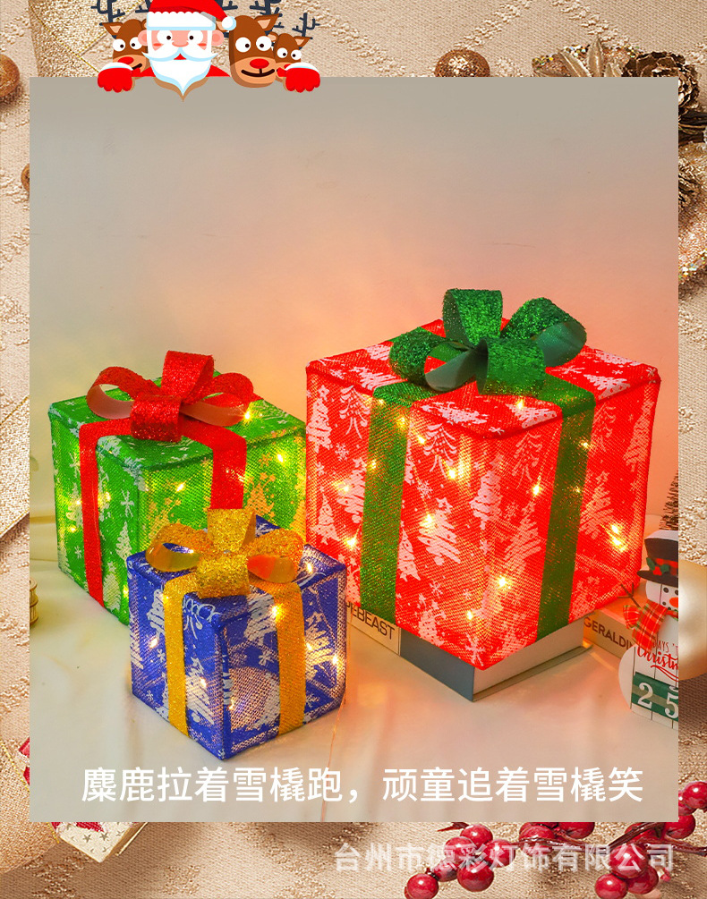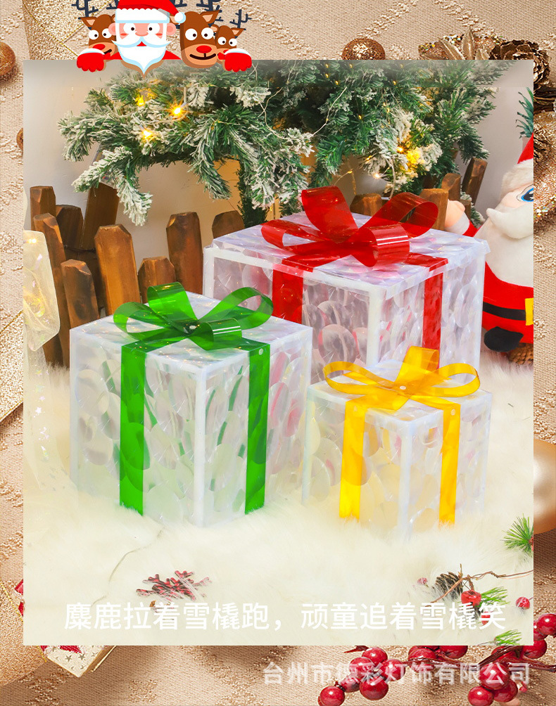 透明礼物盒、布艺雪花礼物盒:电池盒8功能,展开尺寸25*25*25,20*20*20,15*15*15cm, 蝴蝶结高度5cm左右, 礼物盒间距40cm,电源线50cm,皮线灯48灯。内包装尺寸26*26*7cm,0.8kg,20套一箱,外箱54x54x38cm, 17kg.