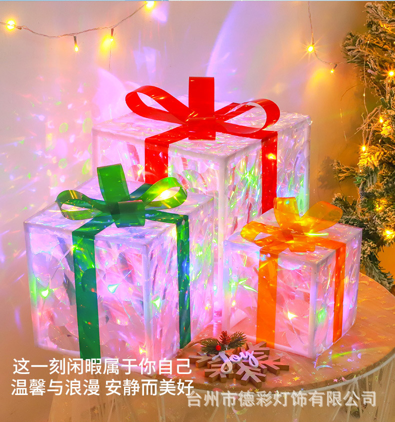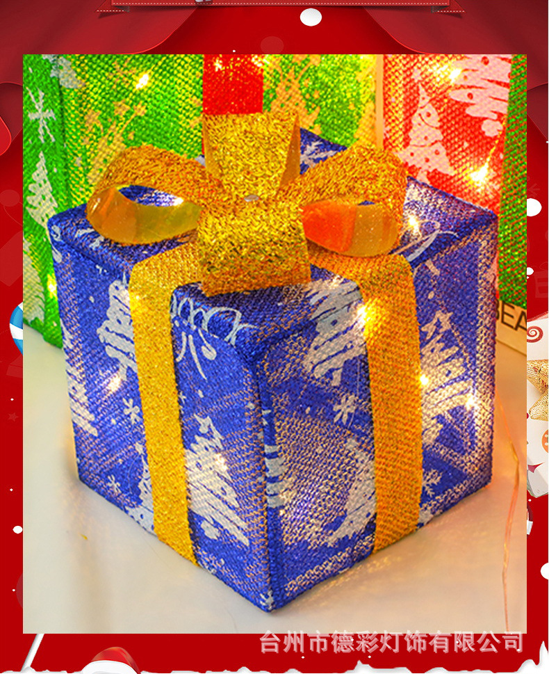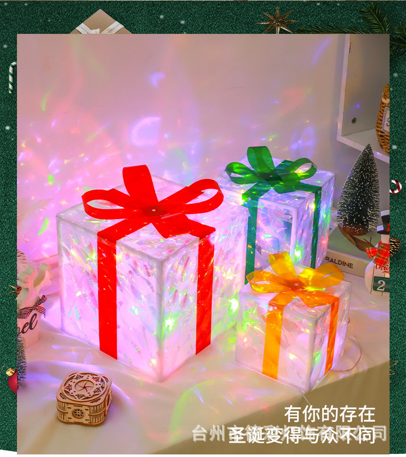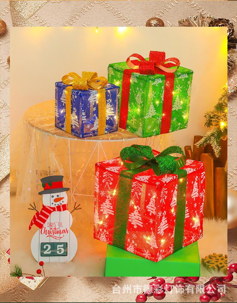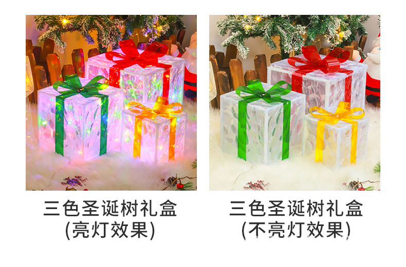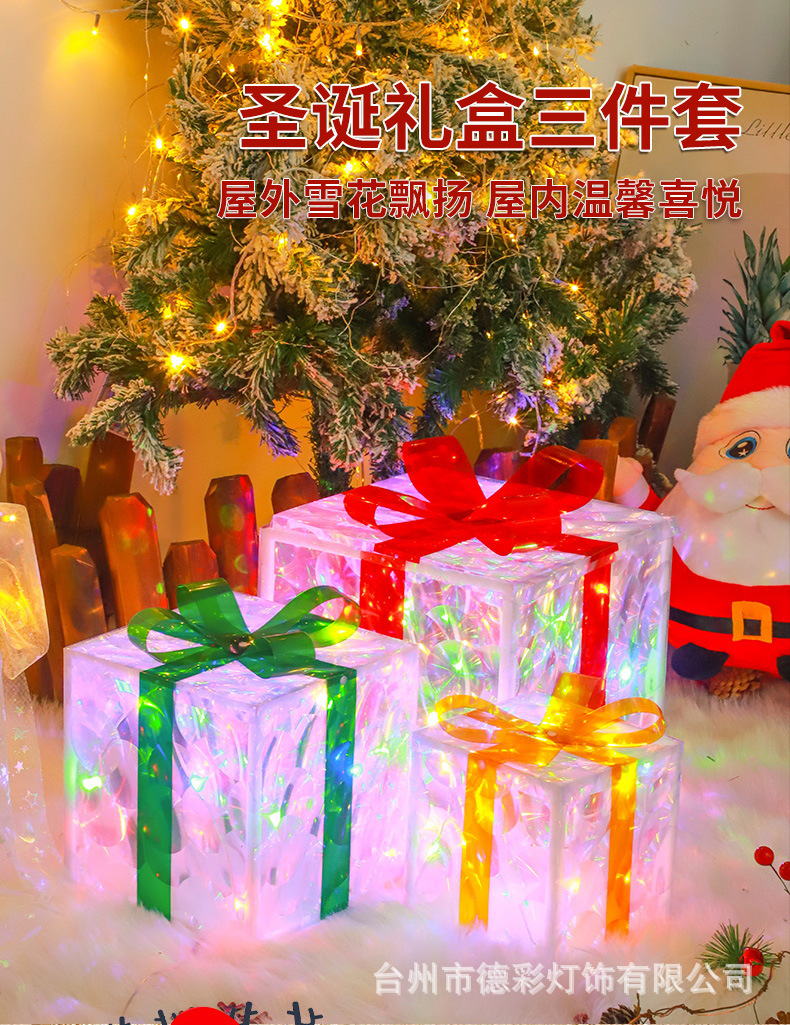 透明礼物盒、布艺雪花礼物盒:电池盒8功能,展开尺寸25*25*25,20*20*20,15*15*15cm, 蝴蝶结高度5cm左右, 礼物盒间距40cm,电源线50cm,皮线灯48灯。内包装尺寸26*26*7cm,0.8kg,20套一箱,外箱54x54x38cm, 17kg.