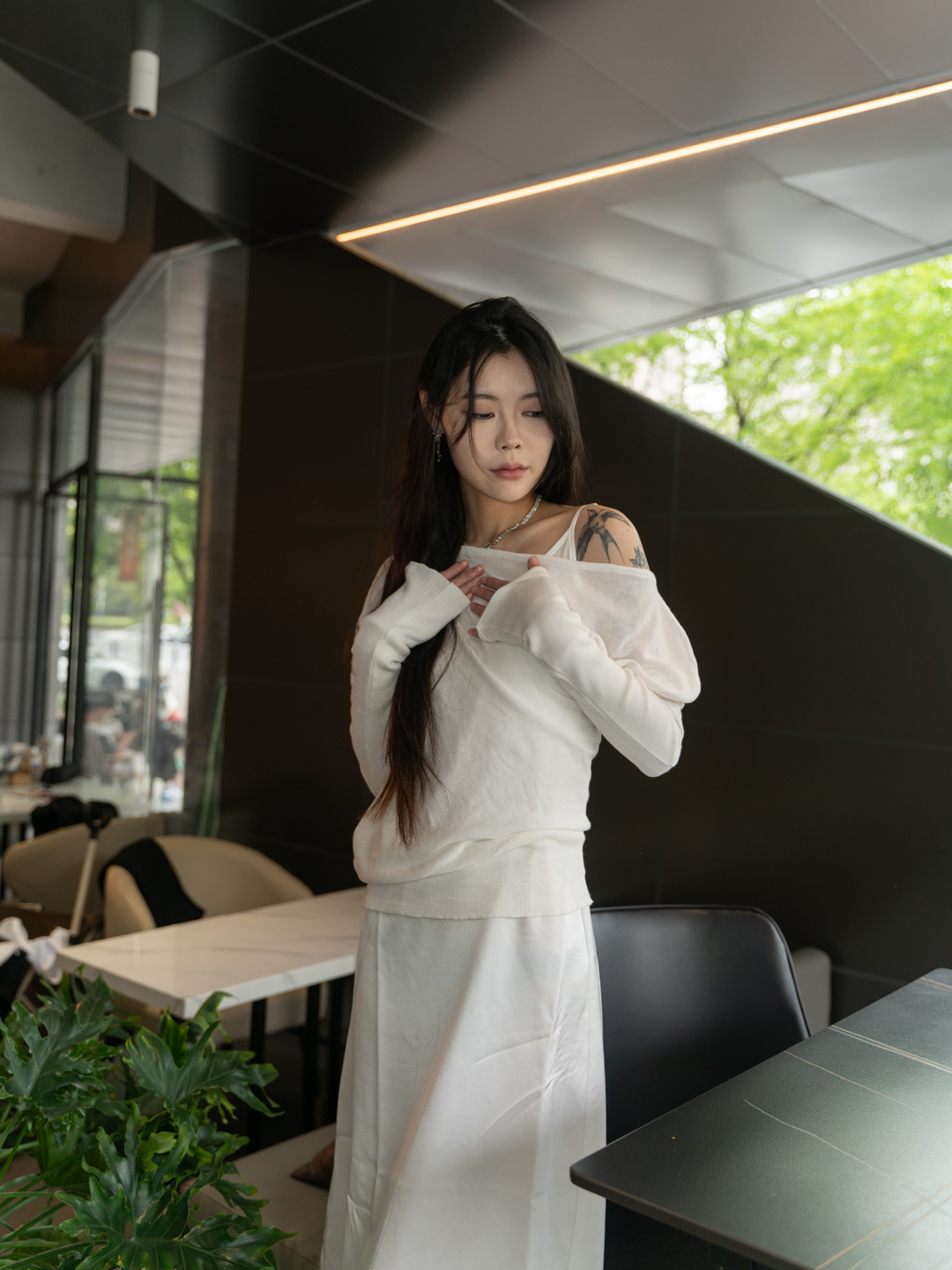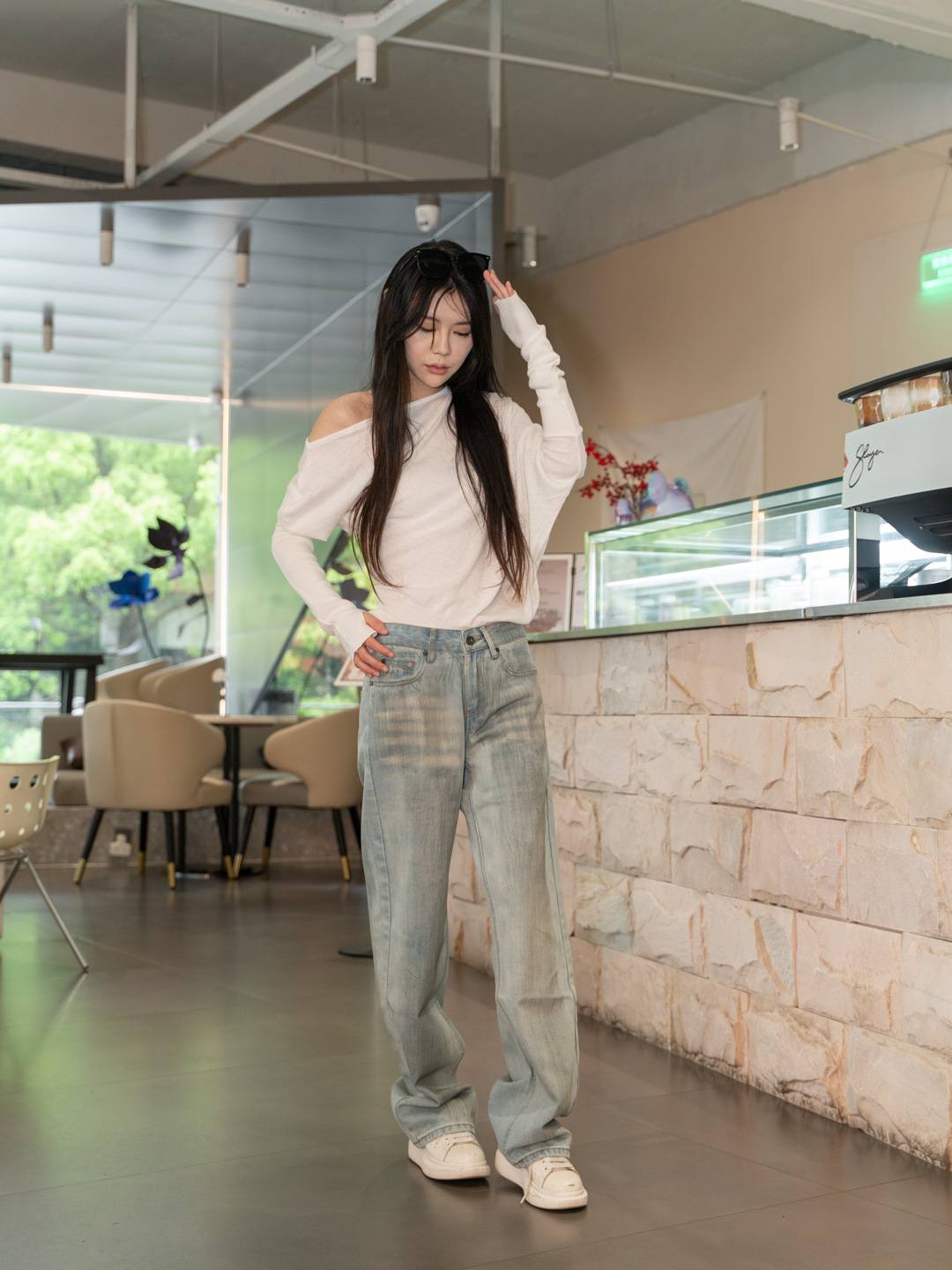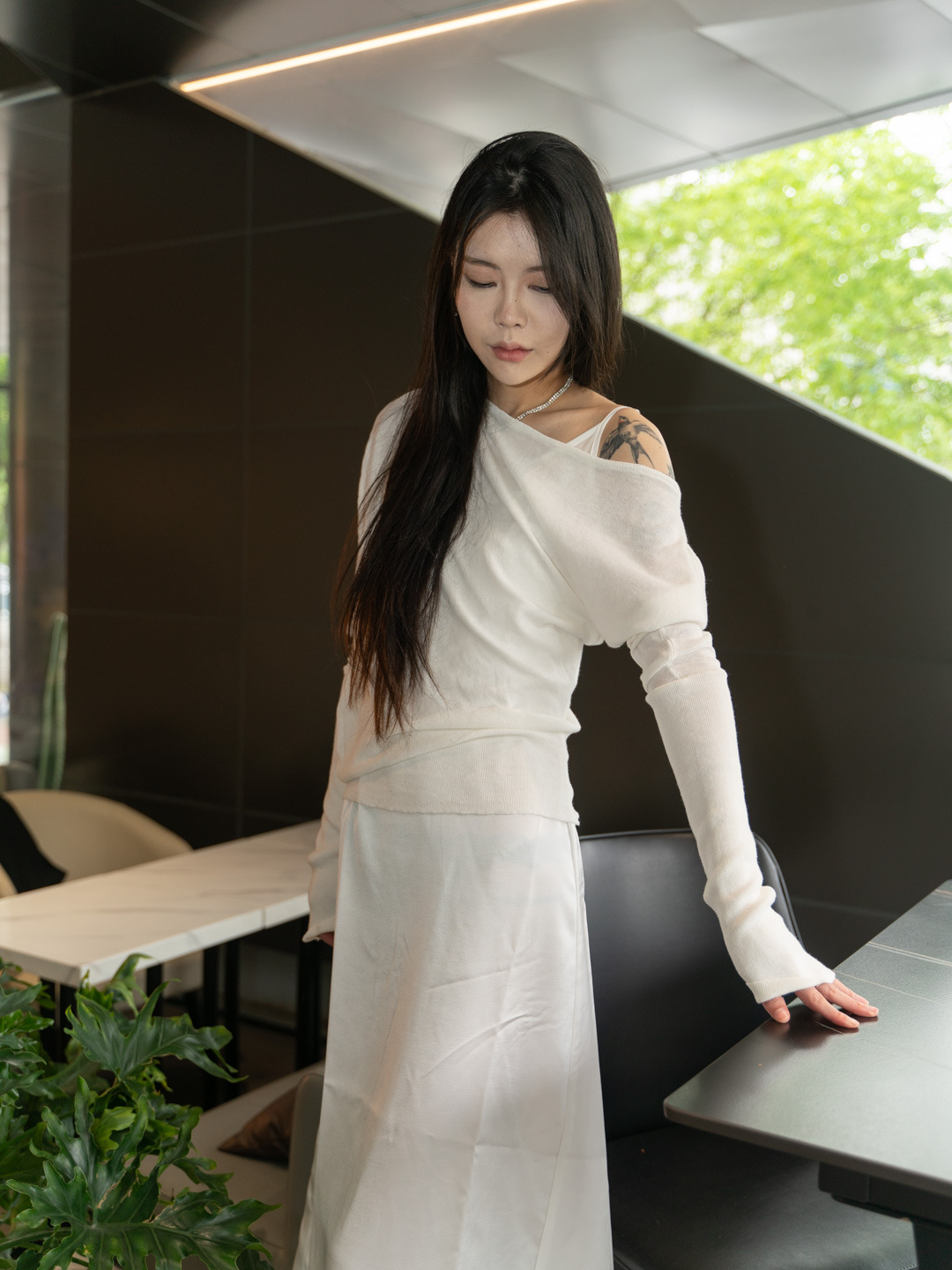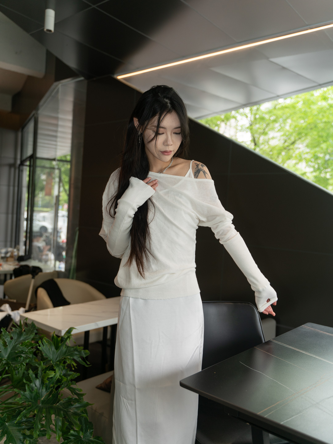순수 경사 어깨 오픈 어깨 느슨한 슬리밍 불규칙한 니트 긴팔 에어컨 셔츠 선스크린 여성용 3133 탑스토어 가기