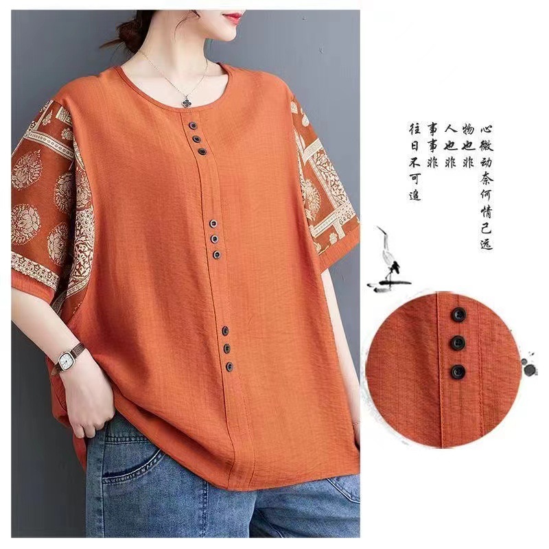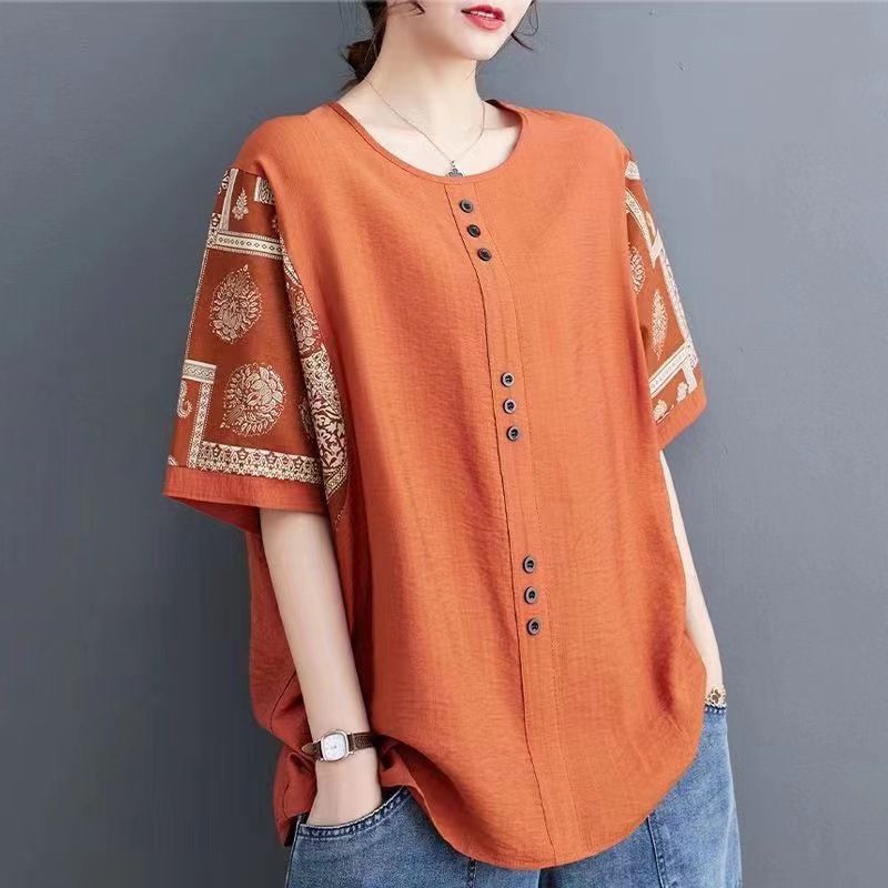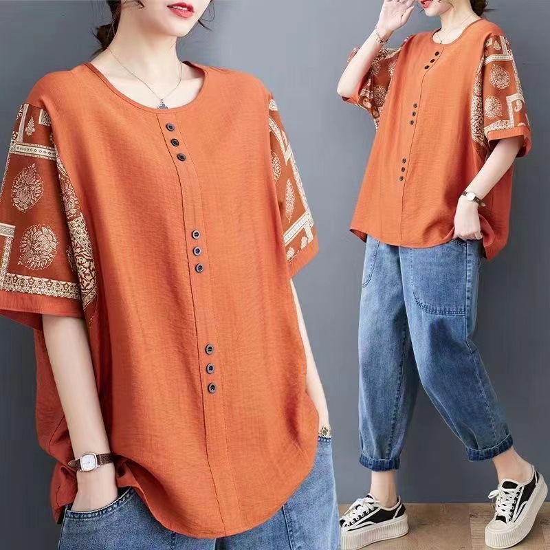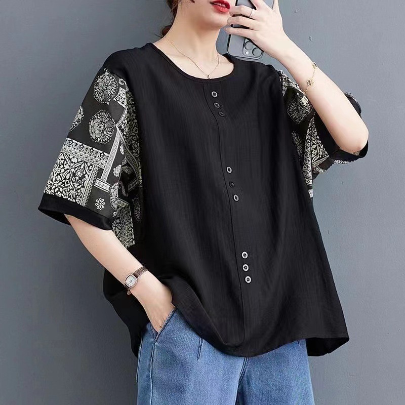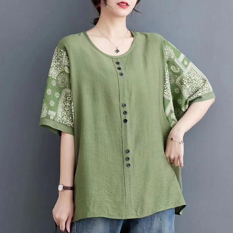 코튼 리넨 반팔 티셔츠 여름 느슨한 대형 통통 여성 인쇄 반소매 탑