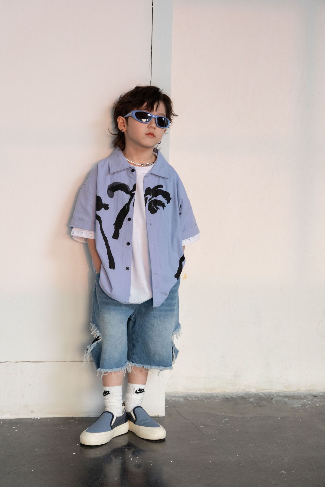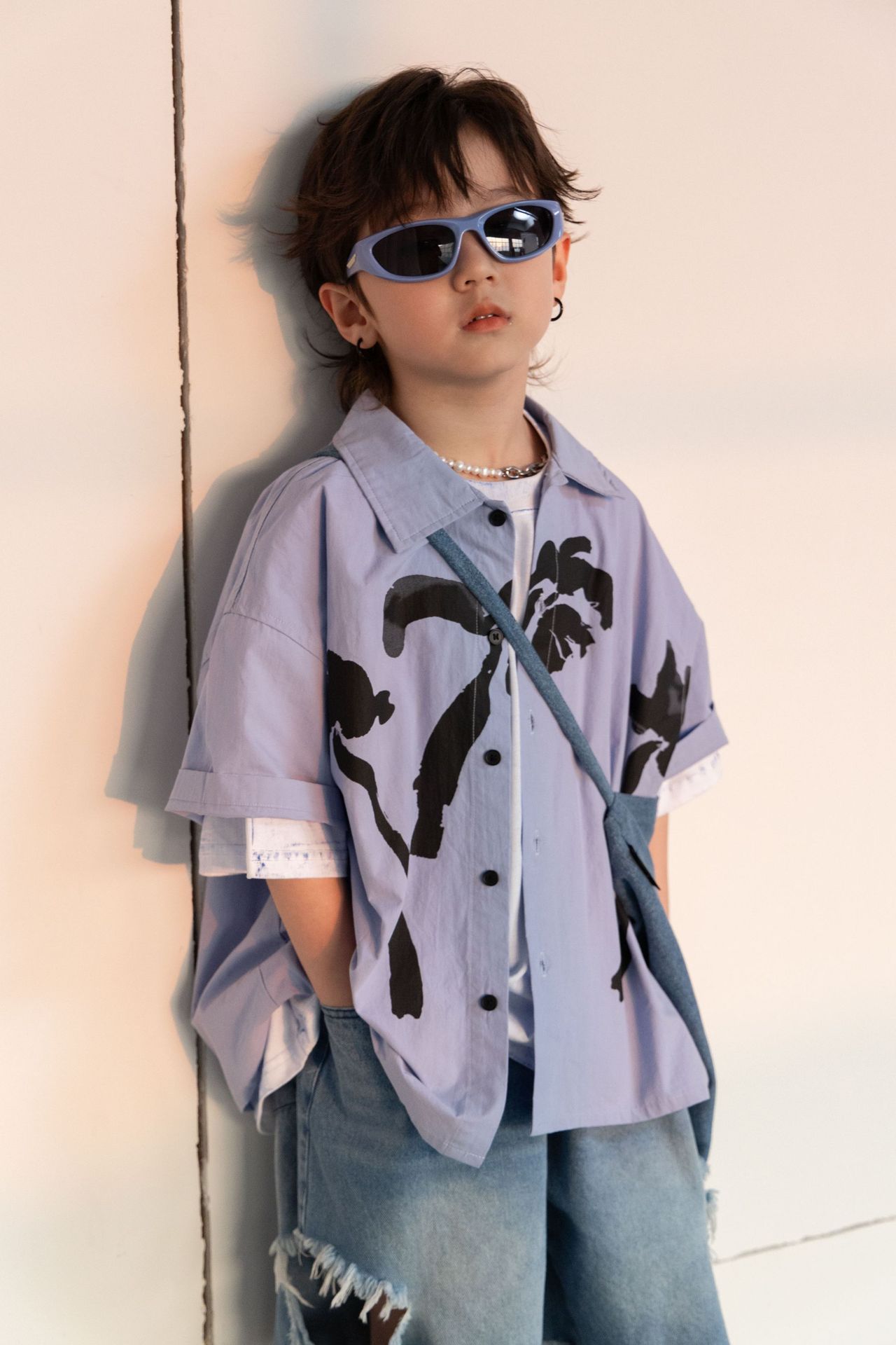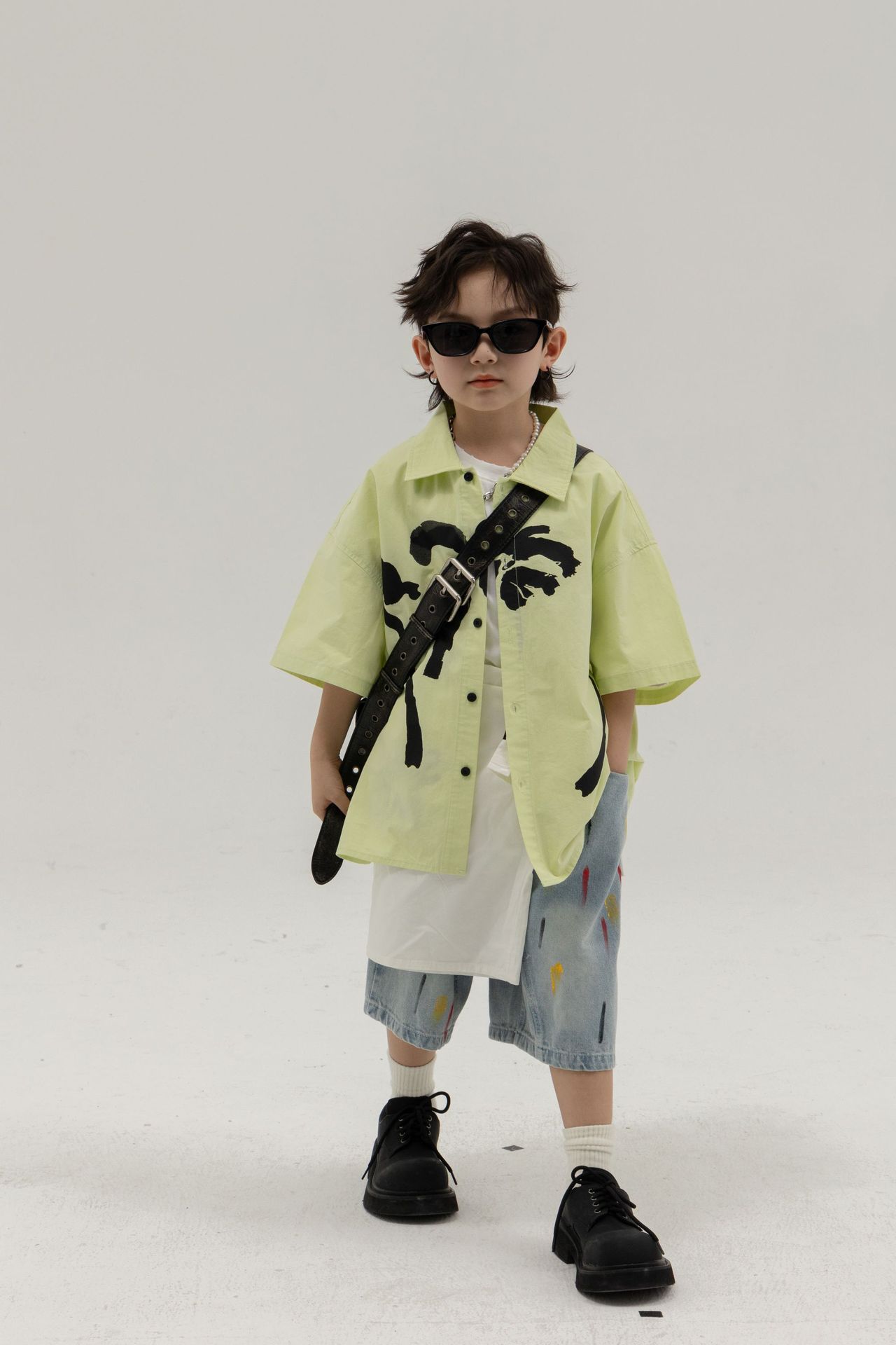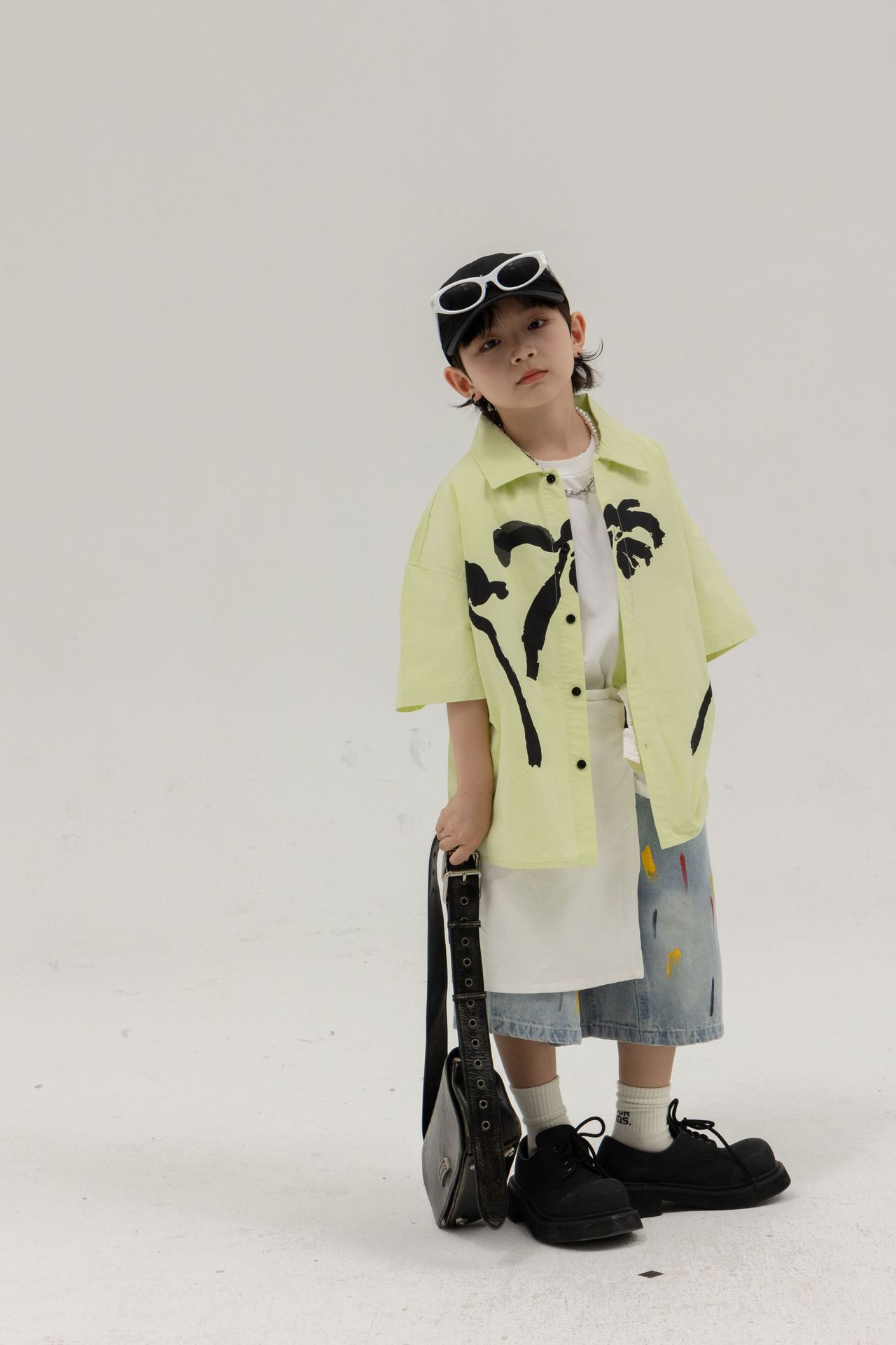 Chuyi 의류 아동용 반팔 셔츠 2024 여름 새 스타일 소년 한국 스타일 아동 의류 코코넛 나무 얇은 셔츠스토어 가기