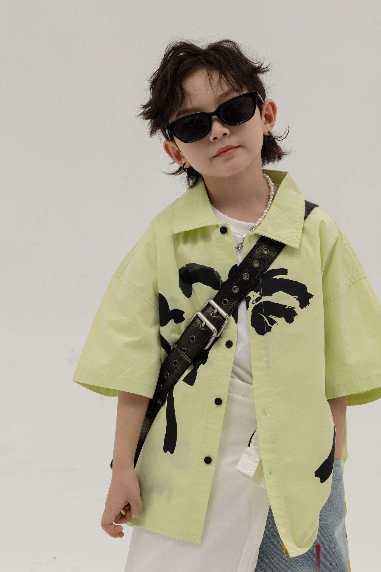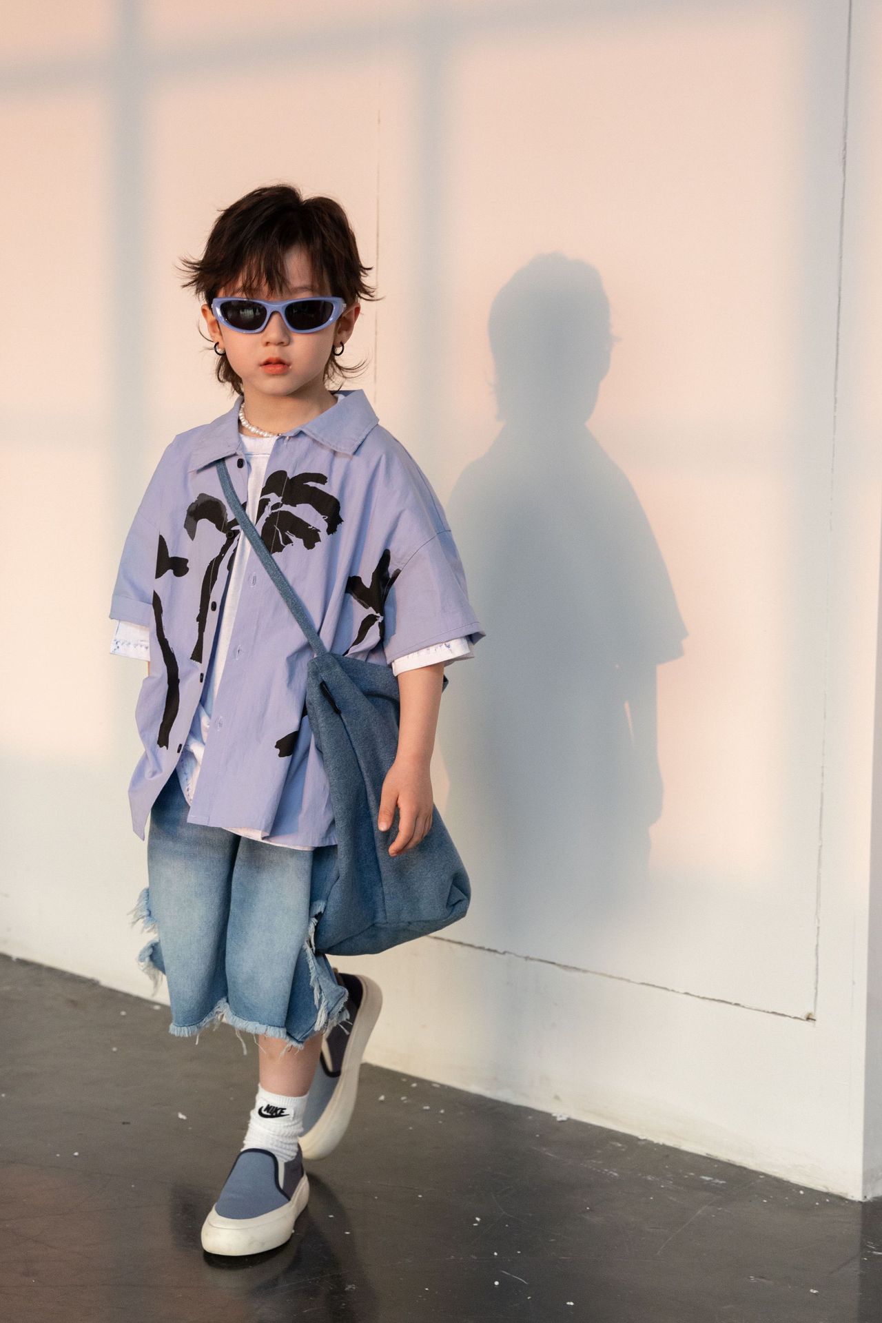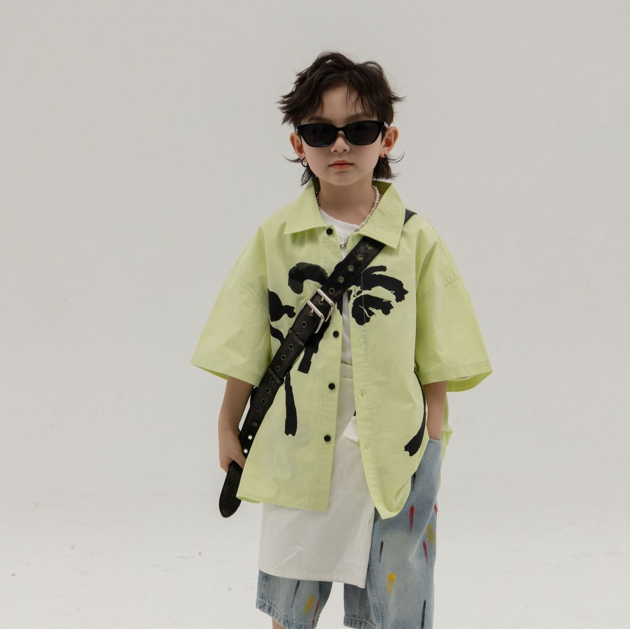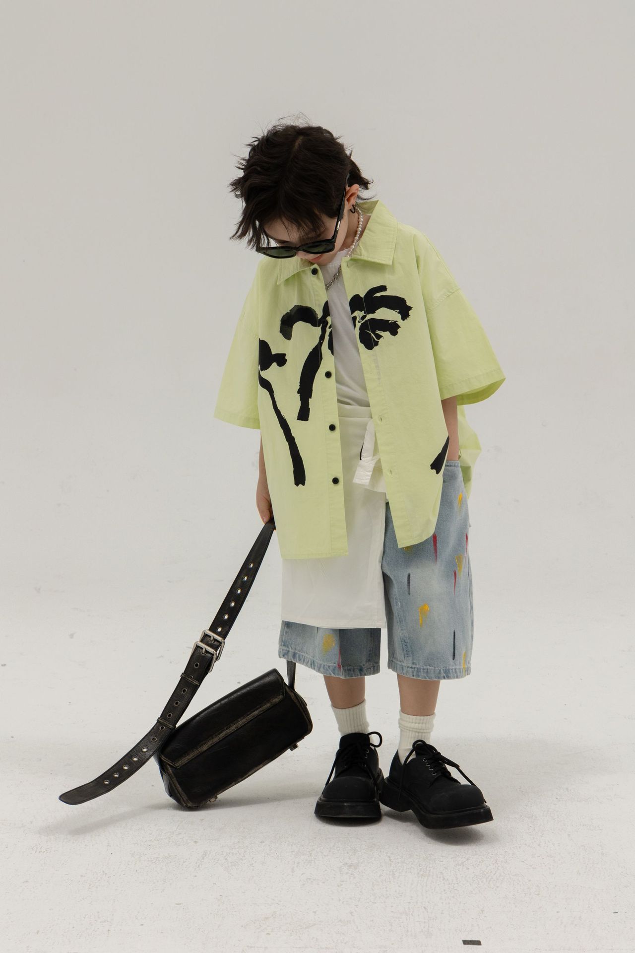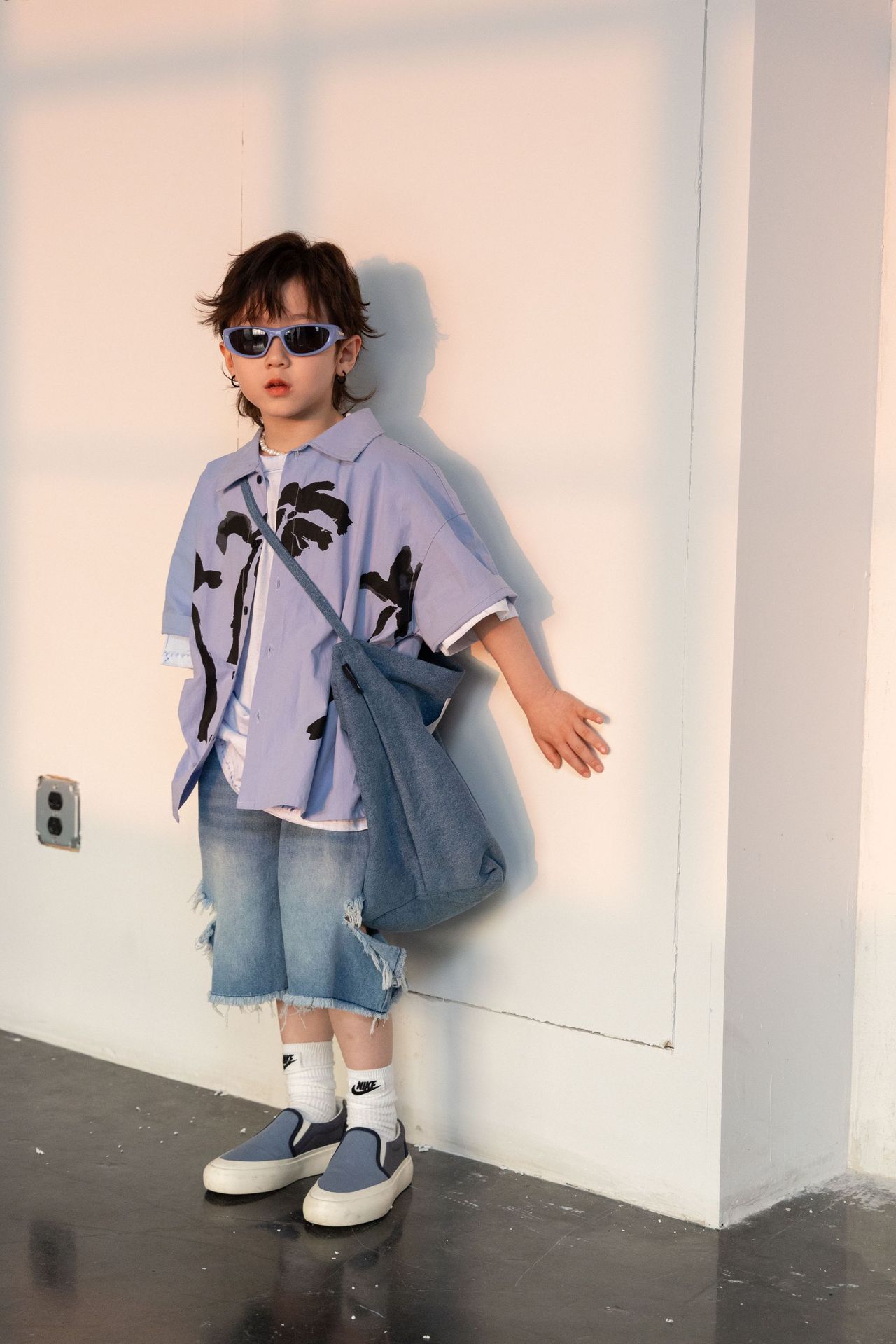 Chuyi 의류 아동용 반팔 셔츠 2024 여름 새 스타일 소년 한국 스타일 아동 의류 코코넛 나무 얇은 셔츠스토어 가기