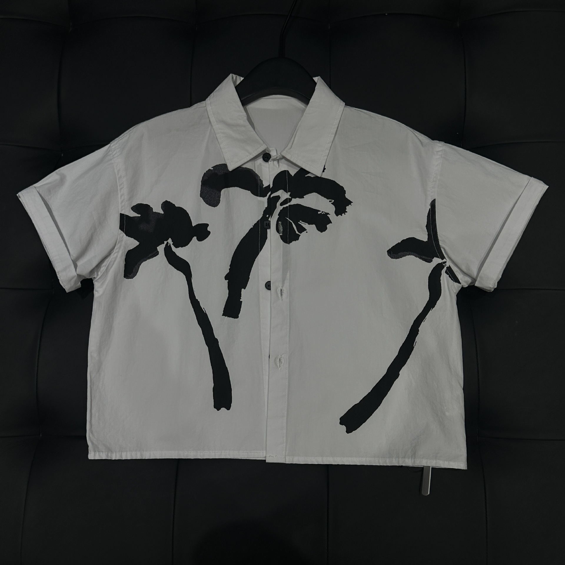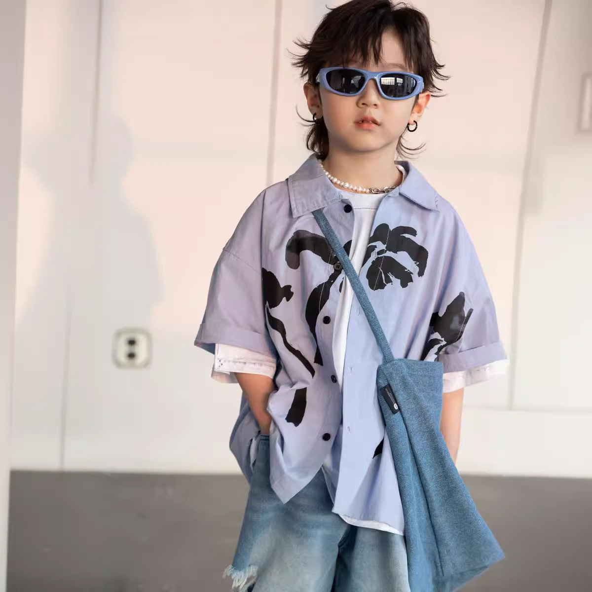 Chuyi 의류 아동용 반팔 셔츠 2024 여름 새 스타일 소년 한국 스타일 아동 의류 코코넛 나무 얇은 셔츠
