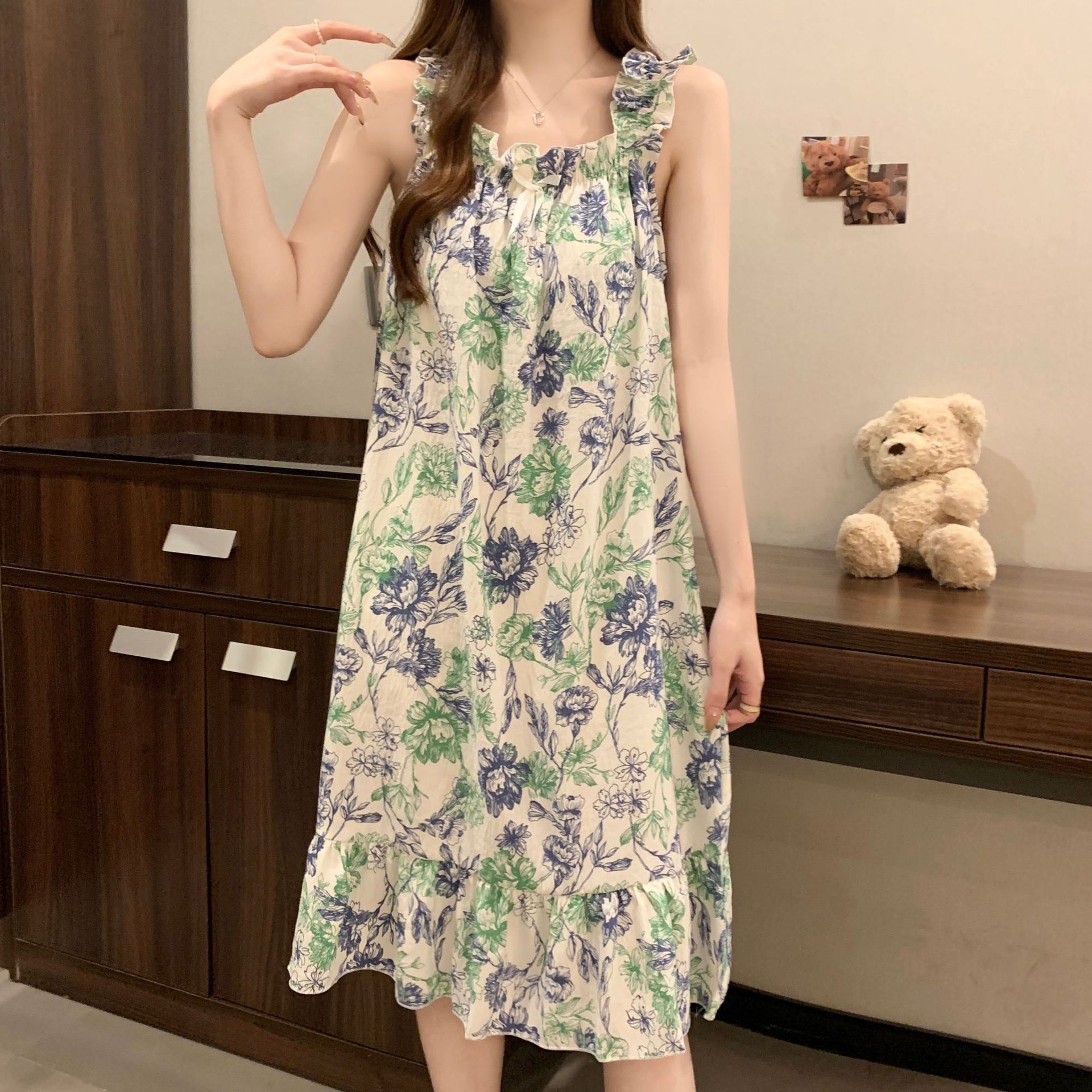 새로운 중국 목가적 인 스타일 슬링 파자마 여성 여름 새 스타일 가슴 패드 꽃 달콤한 느슨한 외부 착용 홈 옷스토어 가기