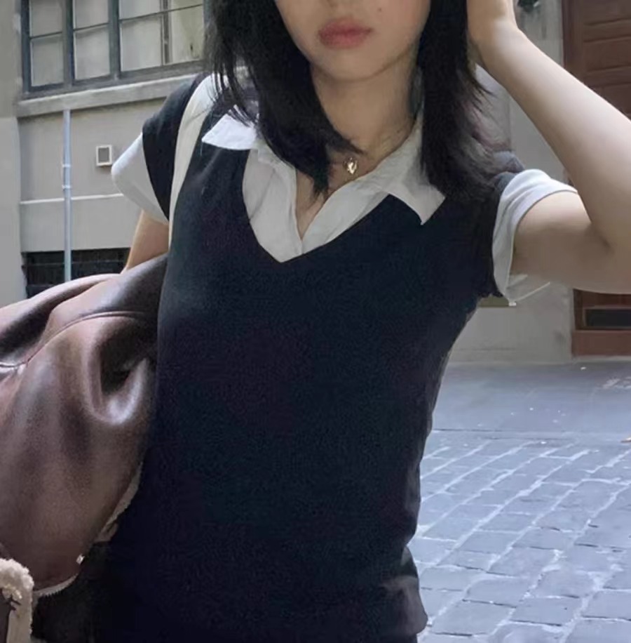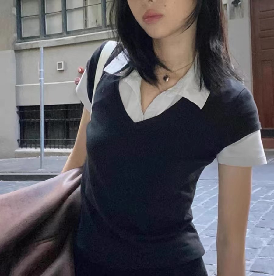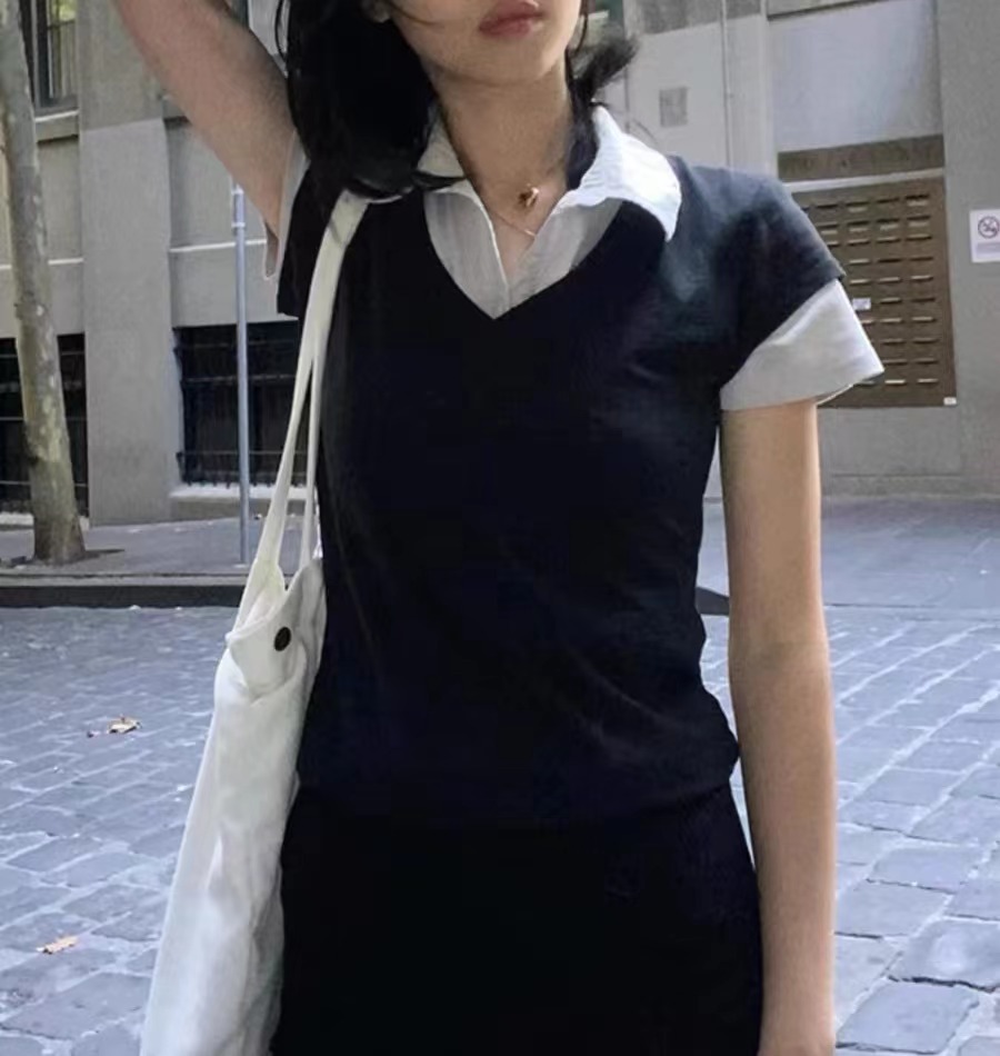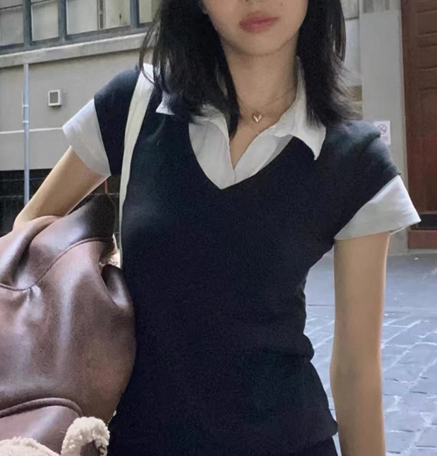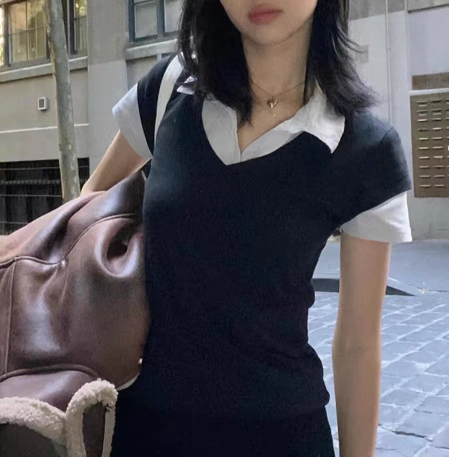 Gogaapt 한국 스타일 대학 스타일 POLO 칼라 스티칭 가짜 투피스 반팔 티셔츠 여성용 슬림 핏 슬리밍 쇼트 탑스토어 가기