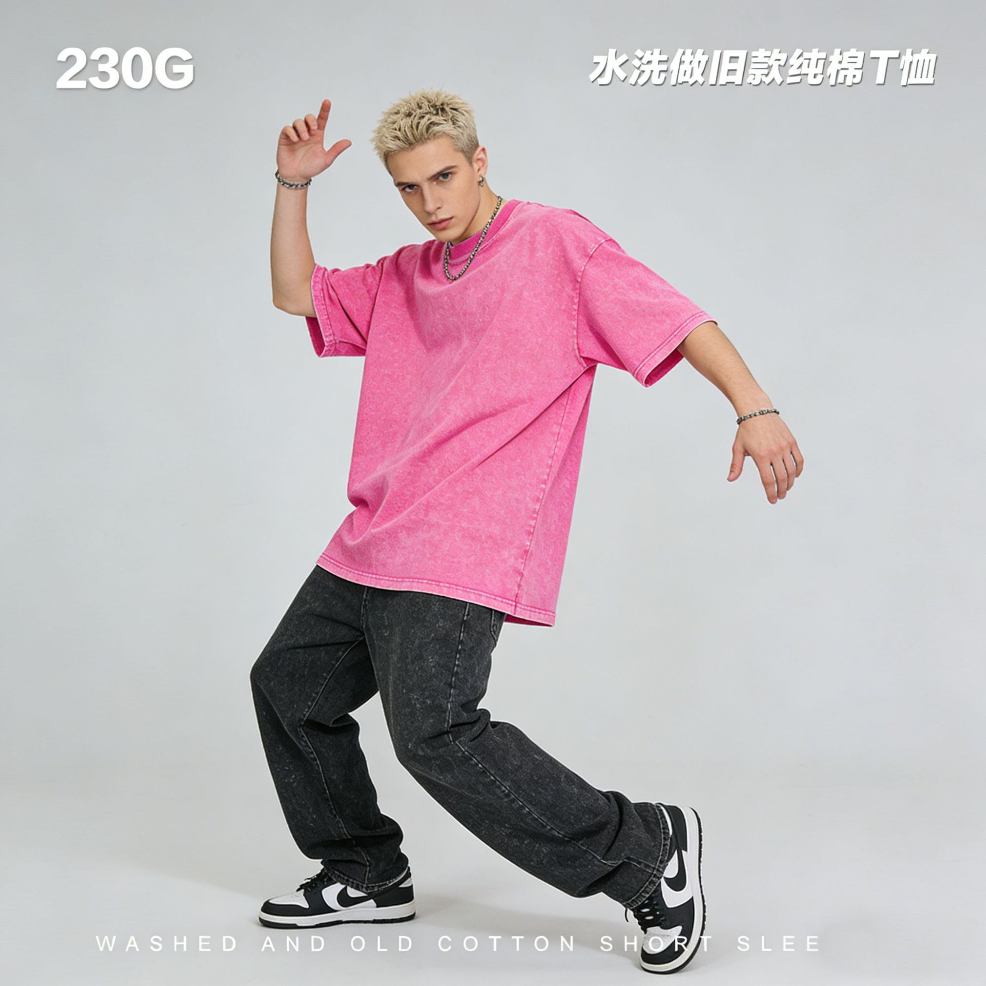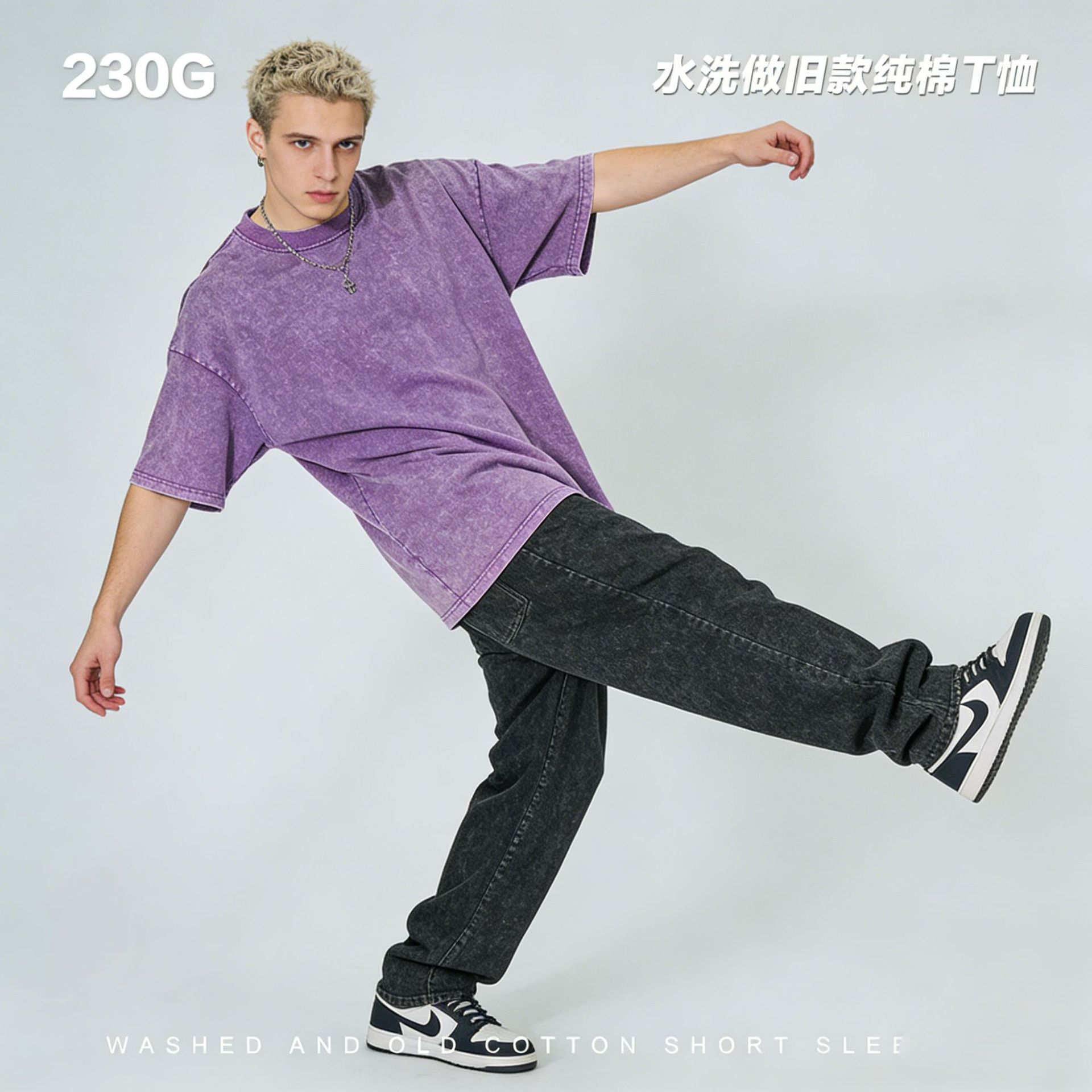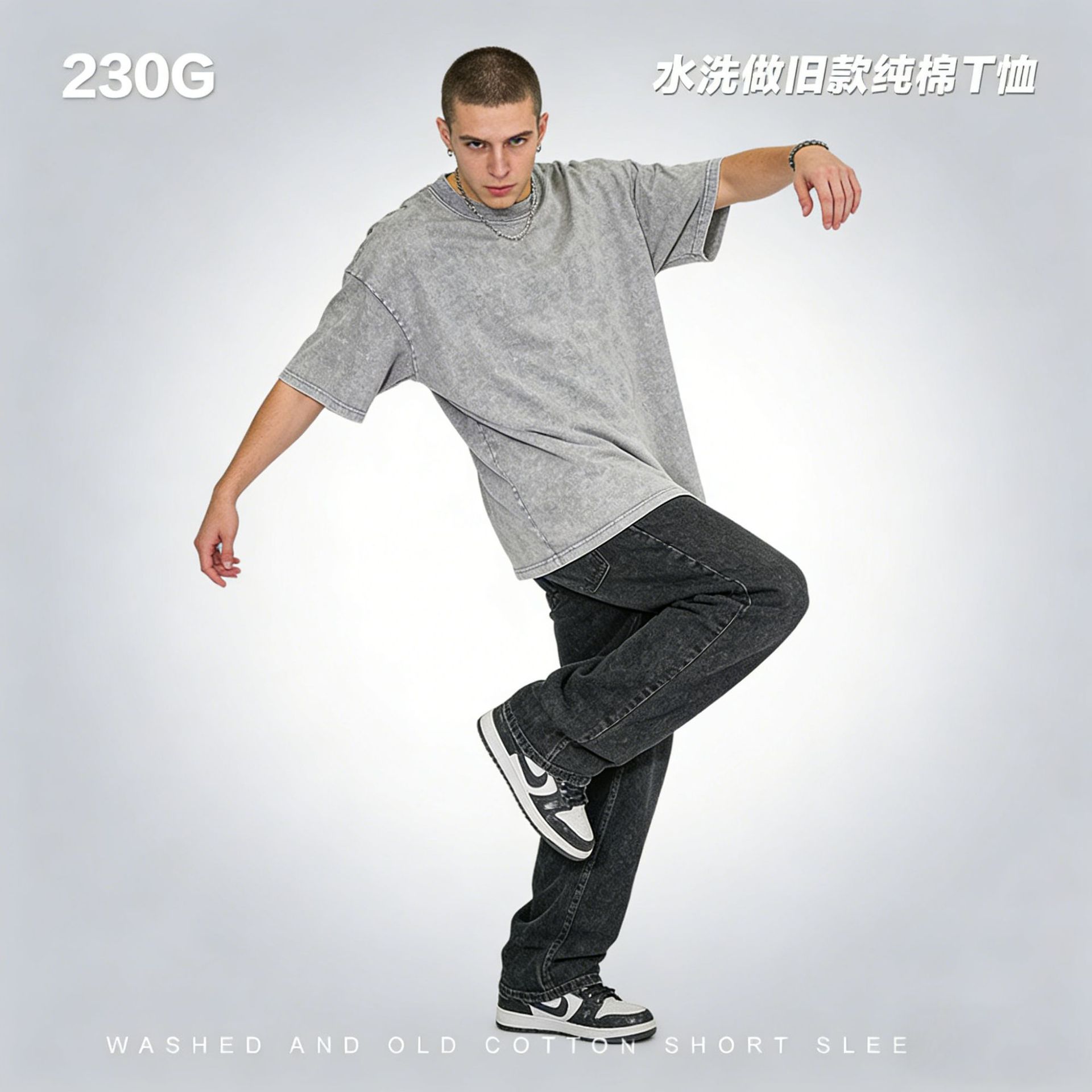 남성용 티셔츠 230g 산성 워싱 눌어붙은 눈송이 루즈한 디스트레스드 레트로 긴팔 워싱 반팔 퓨어 코튼 티셔츠 유럽 사이즈스토어 가기