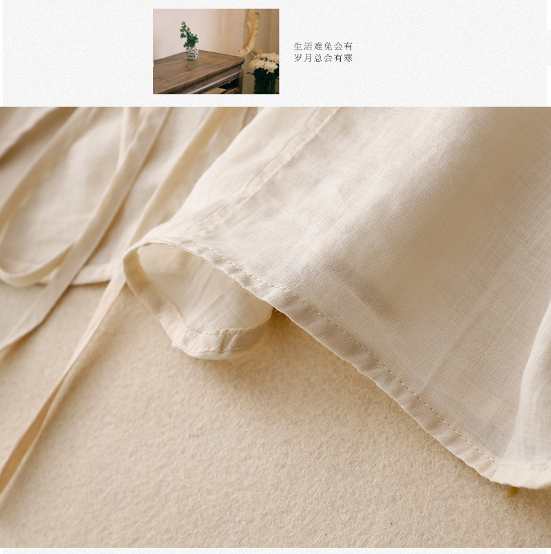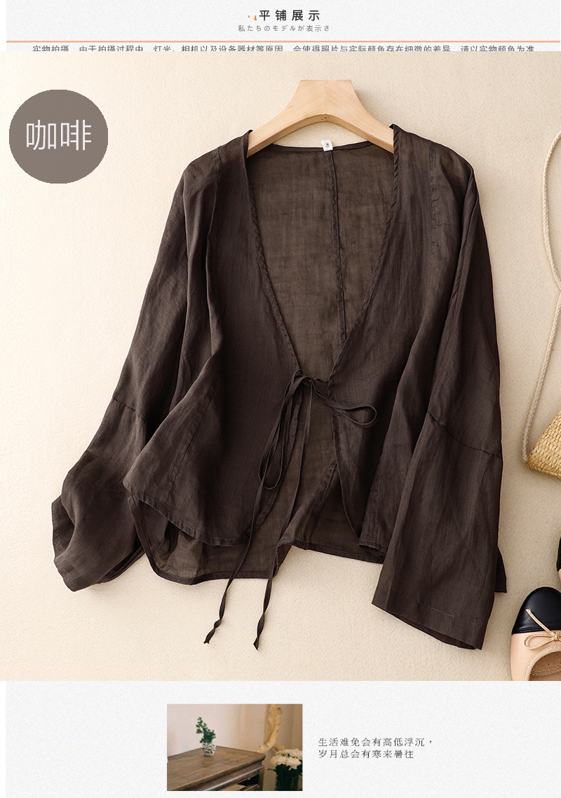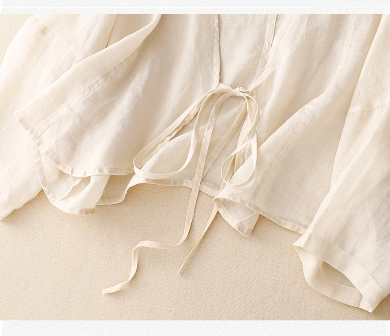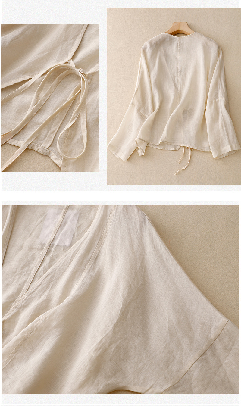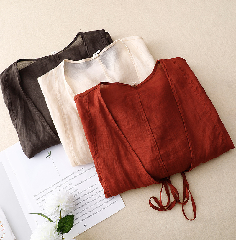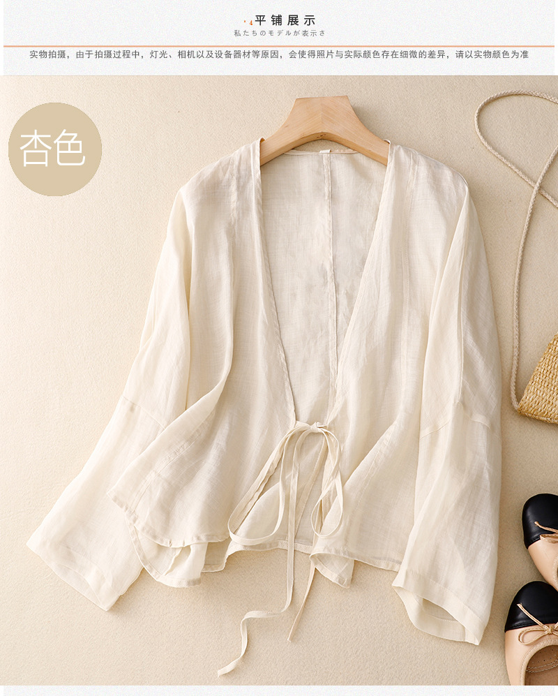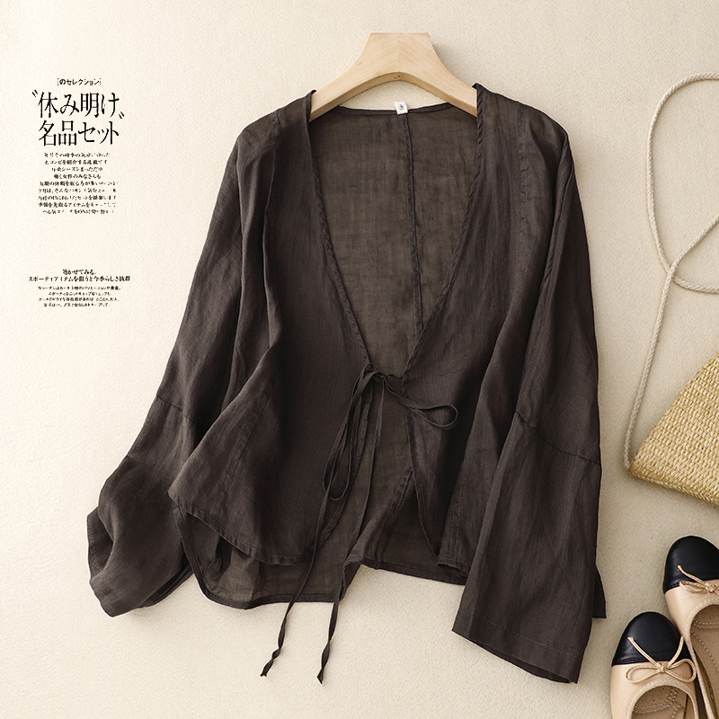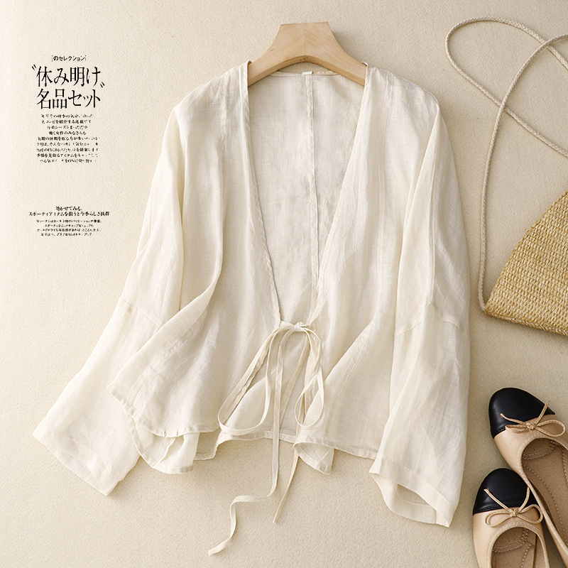 여름 일본과 한국의 새로운 도착 빈티지 예술적 V-Neck 코튼 및 리넨 레이스 업 카디건 태양 보호 의류 느슨한 올 매치 셔츠 여성용 아우터웨어스토어 가기