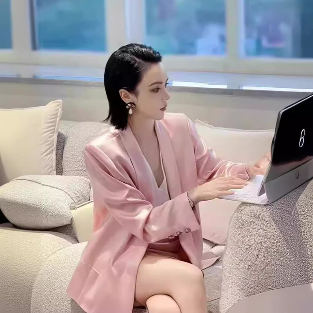 한국 틈새 디자인 센스 여성 핑크 세트 재킷 아세트산 사교계 고급 느슨한 기질 탑