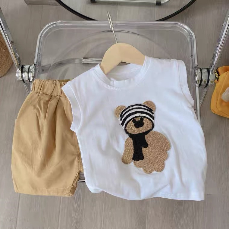 새로운 면 여름 유아용 민소매 조끼 티셔츠 민소매 반바지 세트 남아용 만화 캐릭터 아기 투피스 세트스토어 가기
