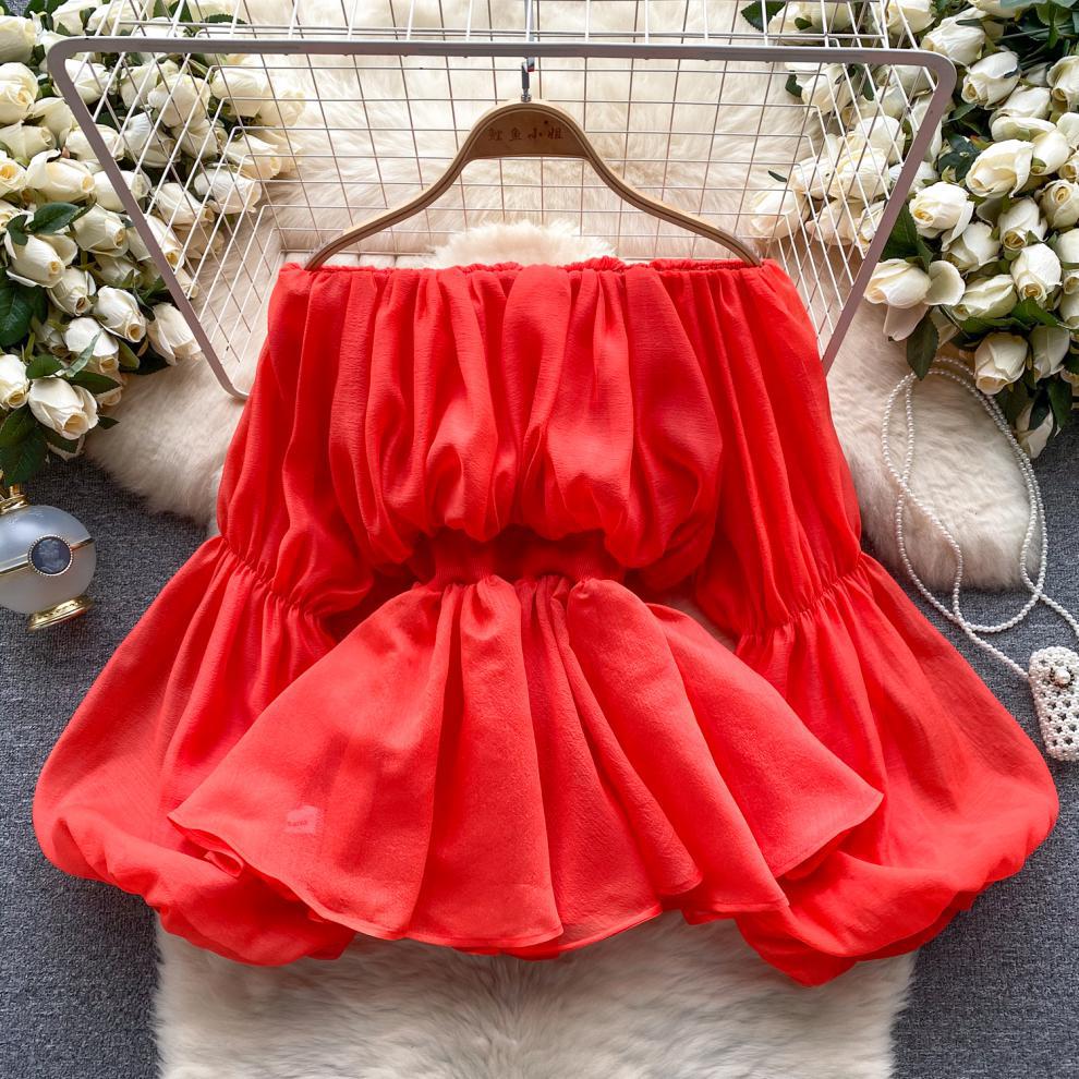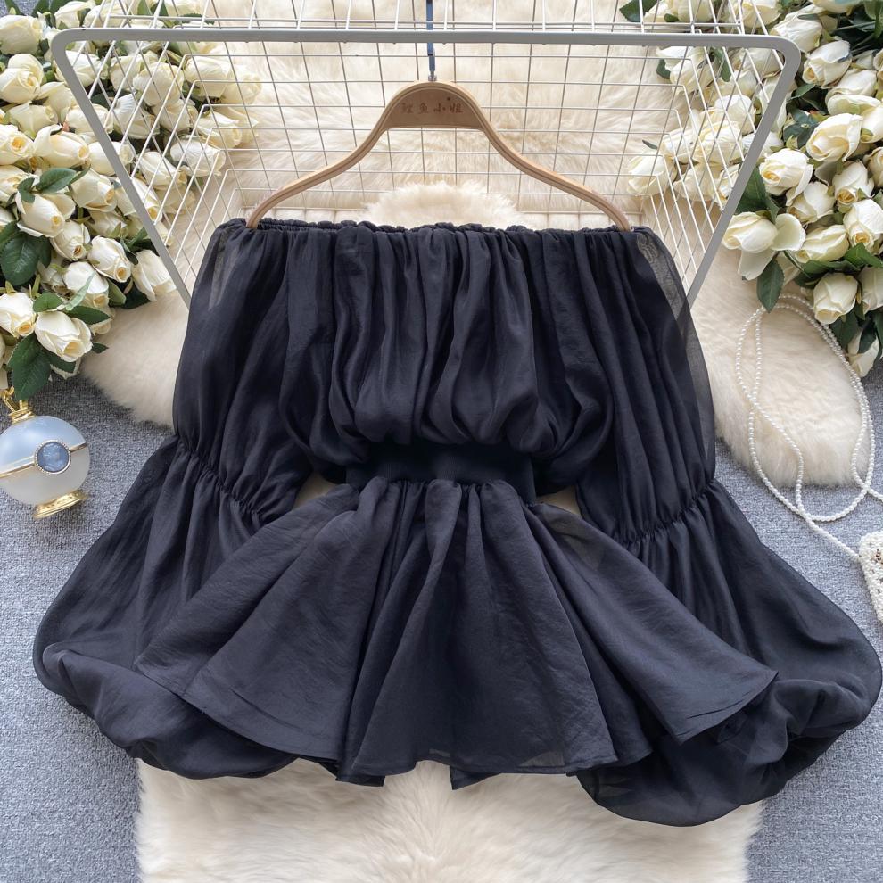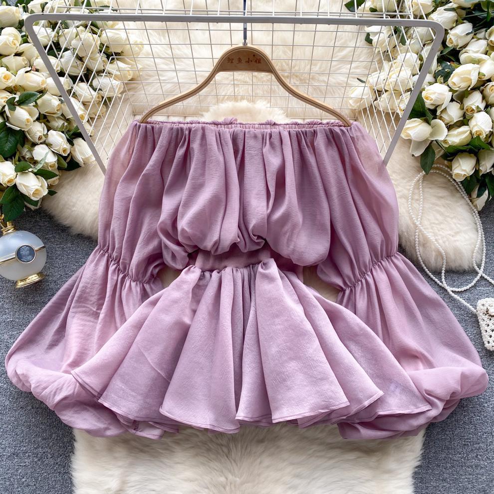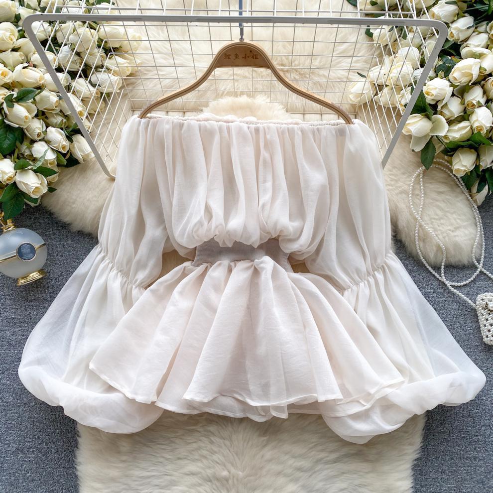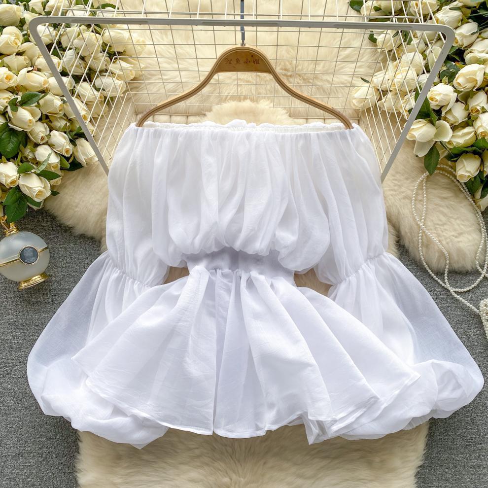프랑스 스타일 셔츠 여성의 새로운 순수한 욕망 스타일 오프 숄더 버블 슬리브 허리 주름진 쉬폰 셔츠 탑