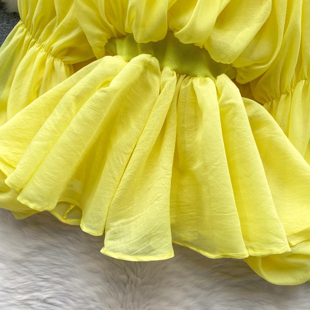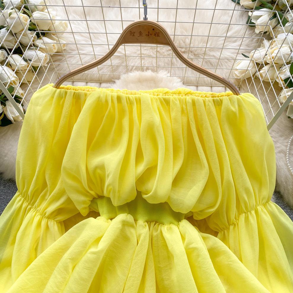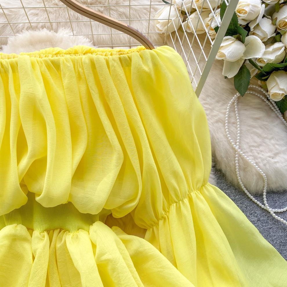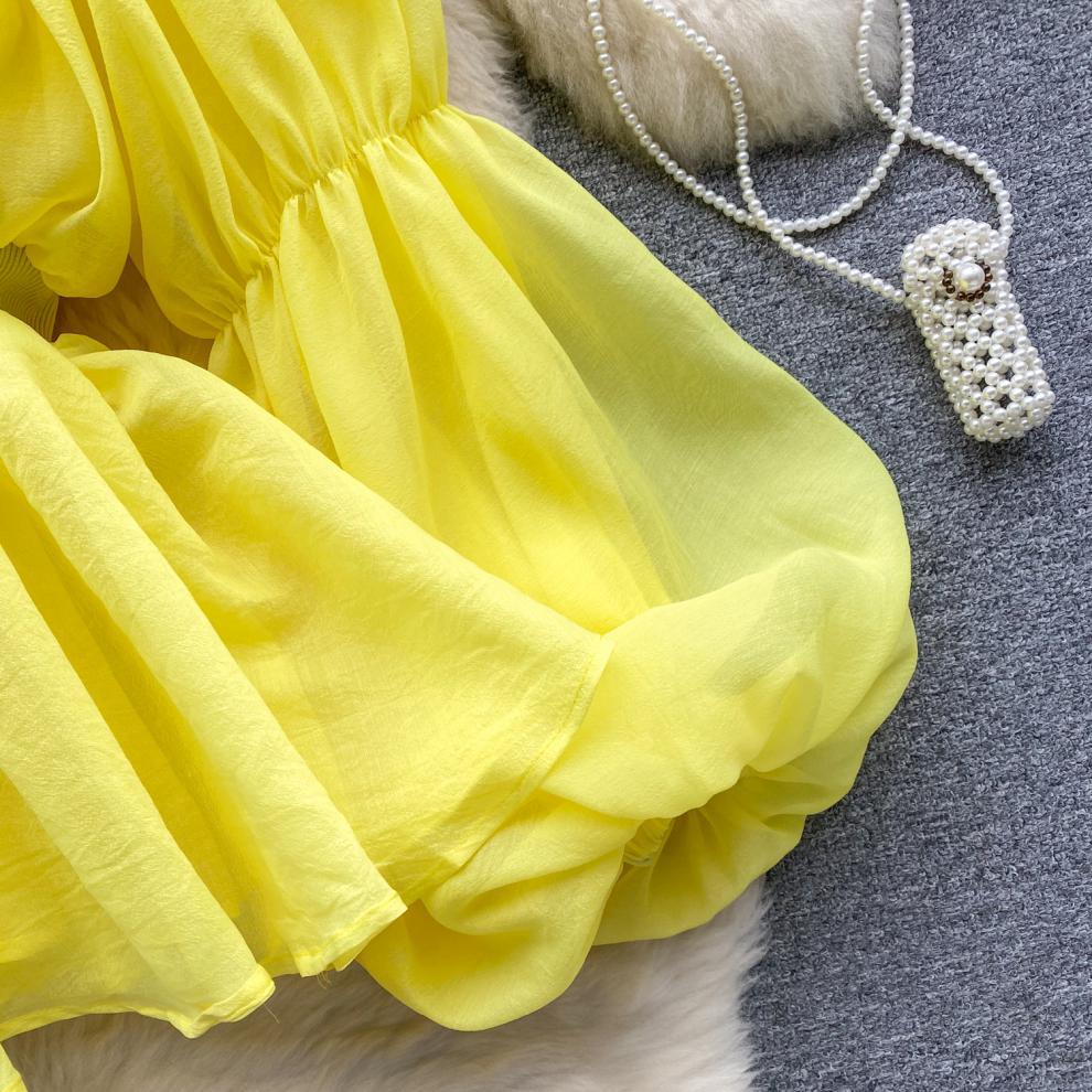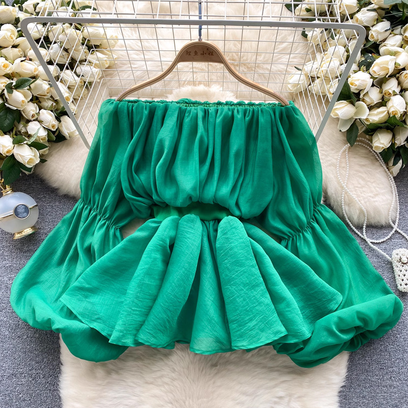 프랑스 스타일 셔츠 여성의 새로운 순수한 욕망 스타일 오프 숄더 버블 슬리브 허리 주름진 쉬폰 셔츠 탑