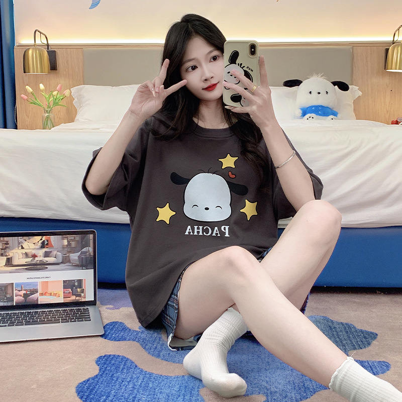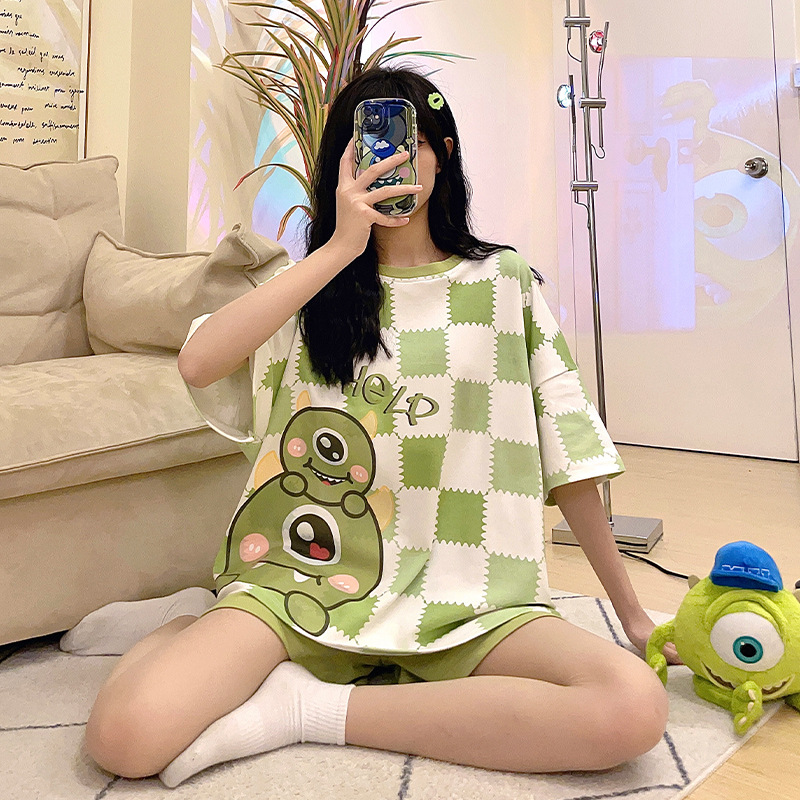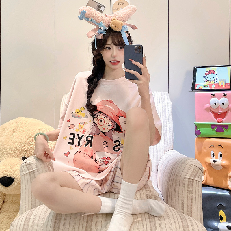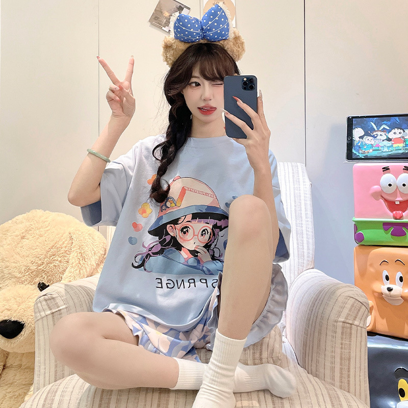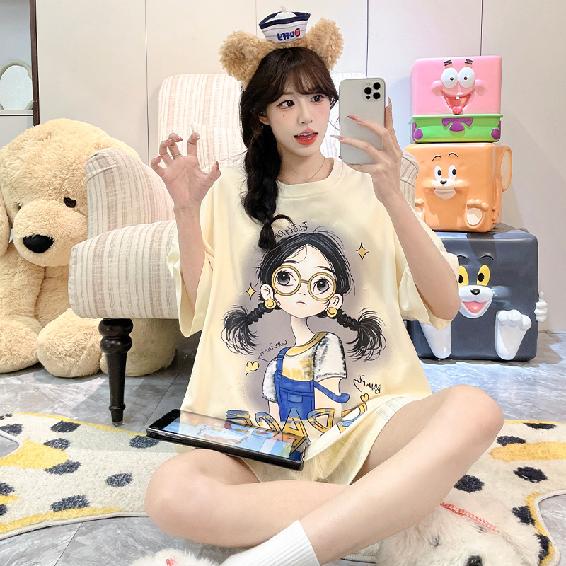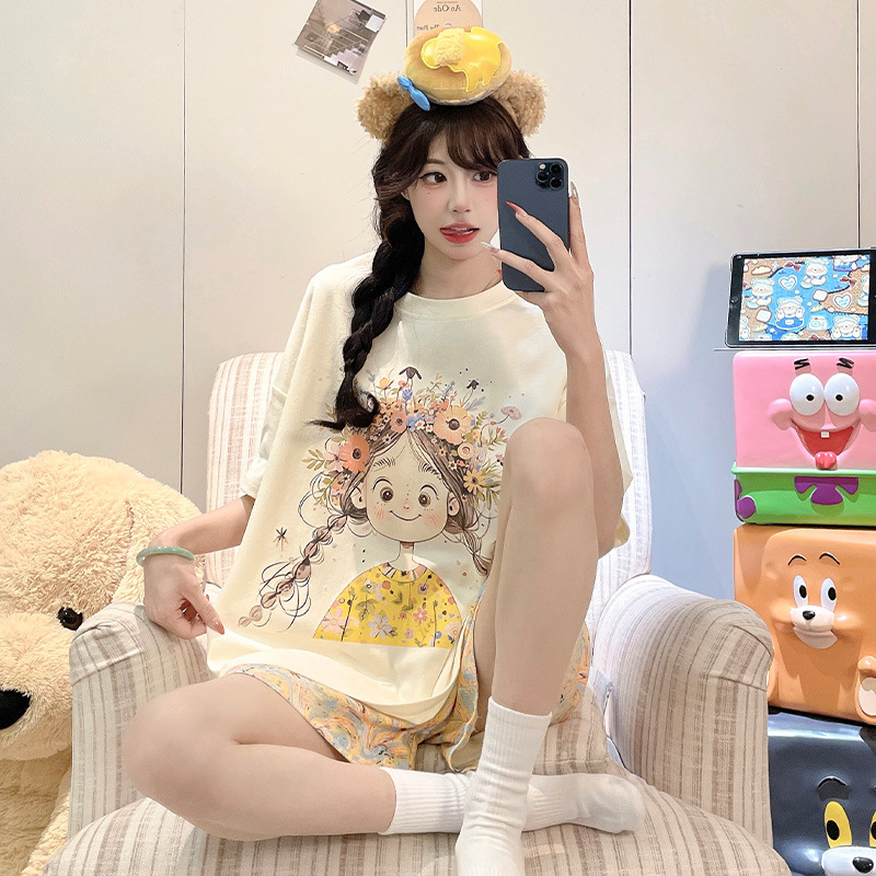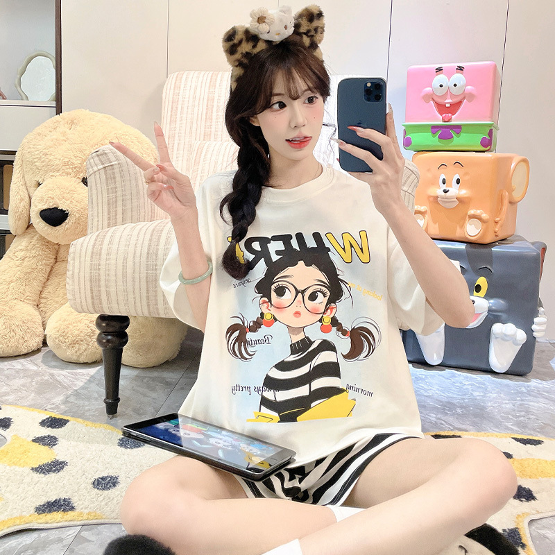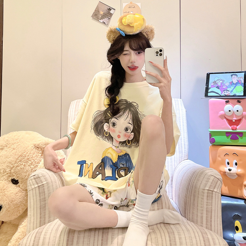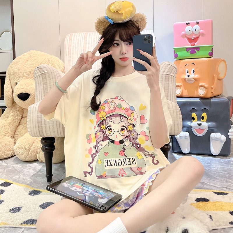 2026 여성용 반팔 잠옷 여름용 얇은 만화 캐릭터 소녀 학생용 라운드넥 여름용 홈웨어 세트(외부에서 착용 가능)스토어 가기