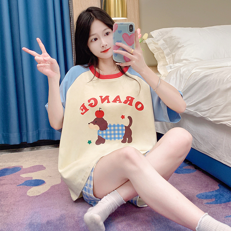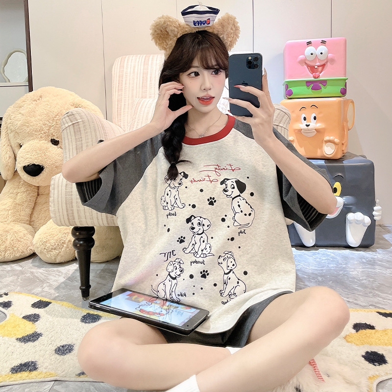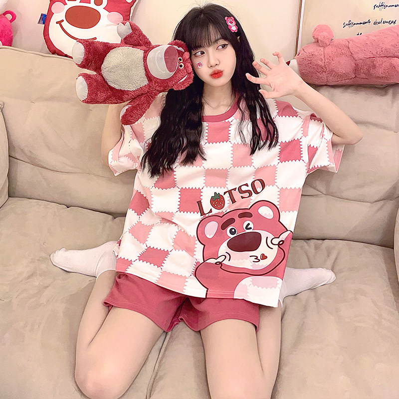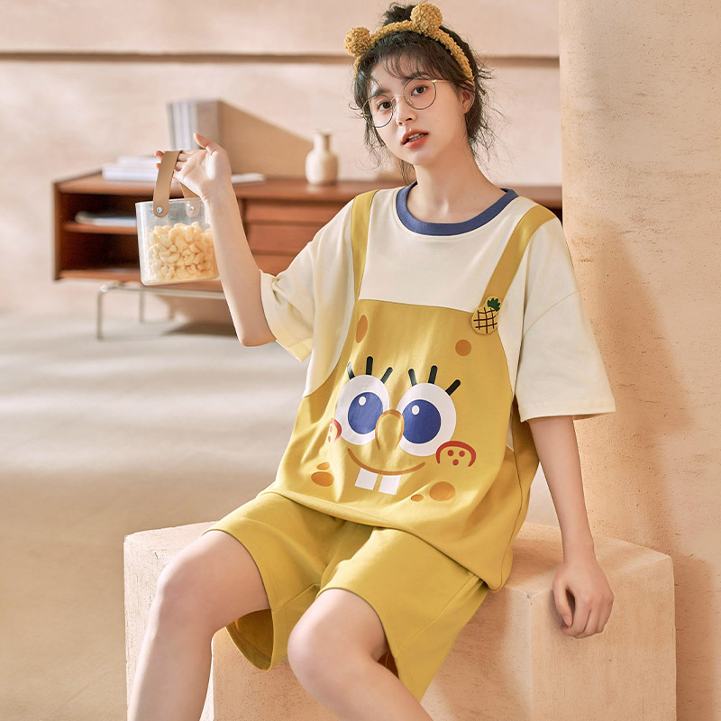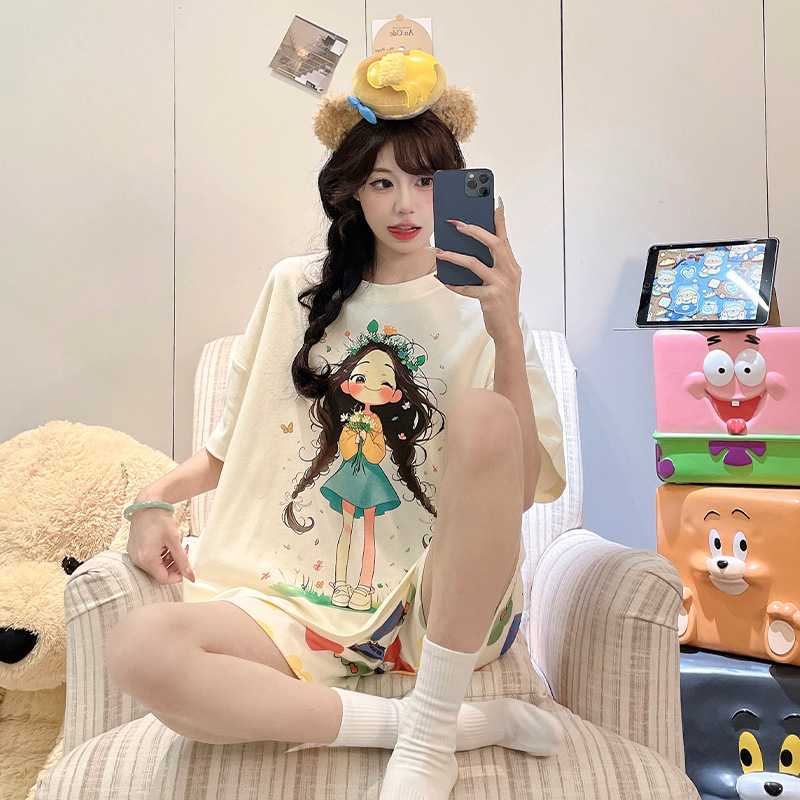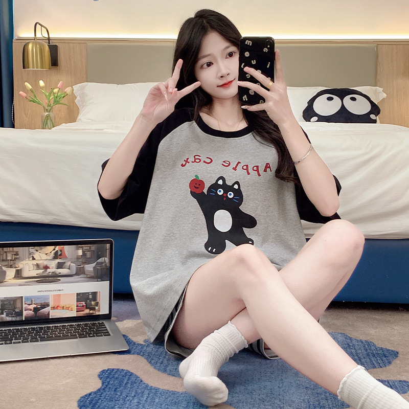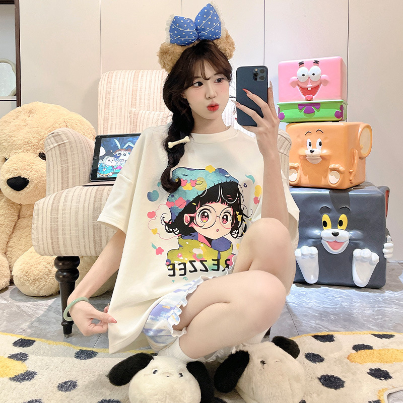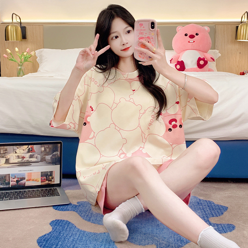 2026 여성용 반팔 잠옷 여름용 얇은 만화 캐릭터 소녀 학생용 라운드넥 여름용 홈웨어 세트(외부에서 착용 가능)스토어 가기
