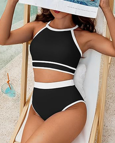 2024 새로운 유럽과 미국의 여성 수영복 높은 허리 비키니 세트 솔리드 컬러 스포츠 수영복 투피스 수영복