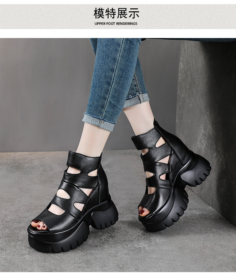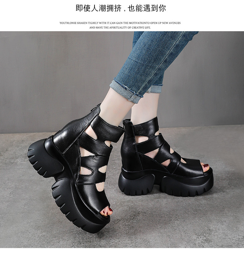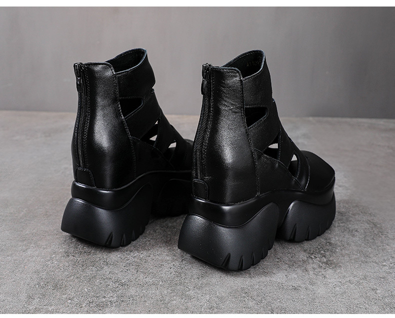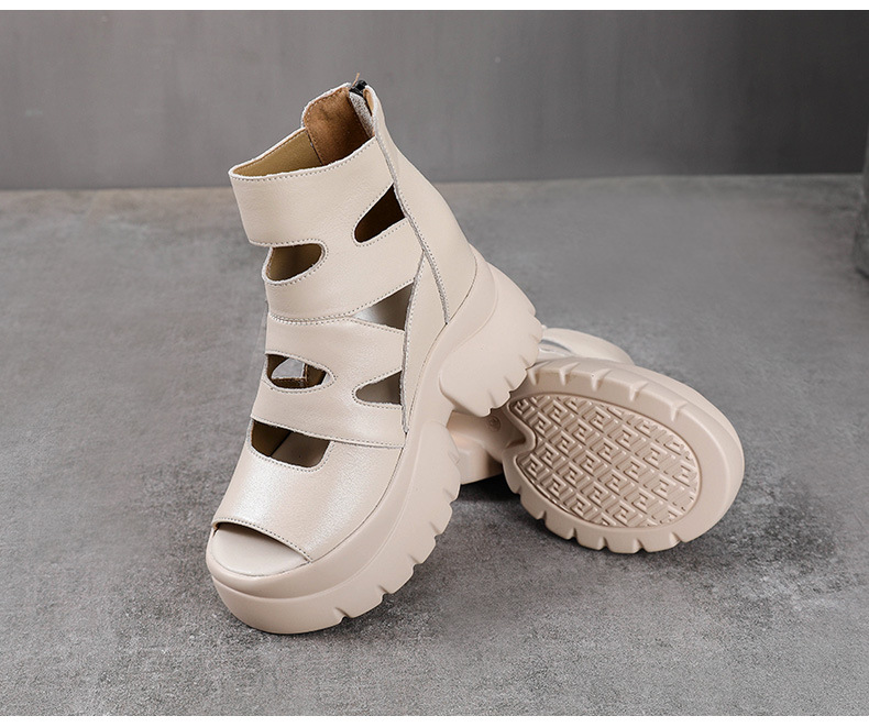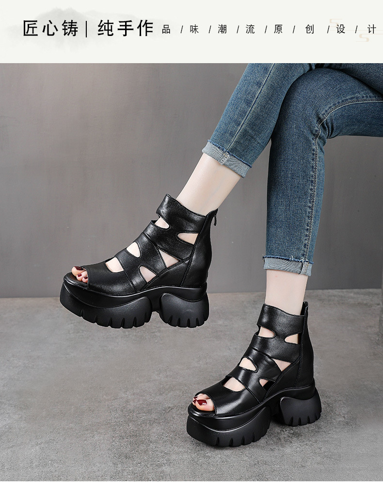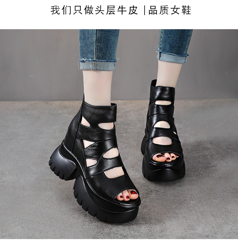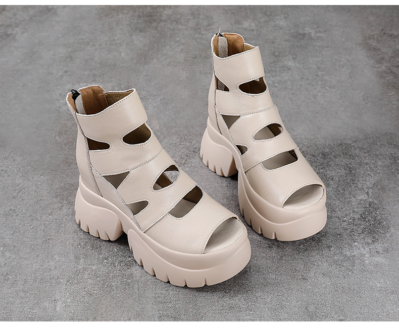 탑 레이어 소 가죽 여름 복고풍 플랫폼 샌들이 속이 빈 홀 짧은 부츠 가죽 여성 샌들 청키 힐 샌들을 높입니다.