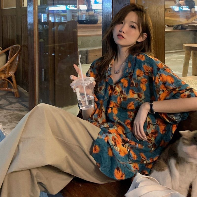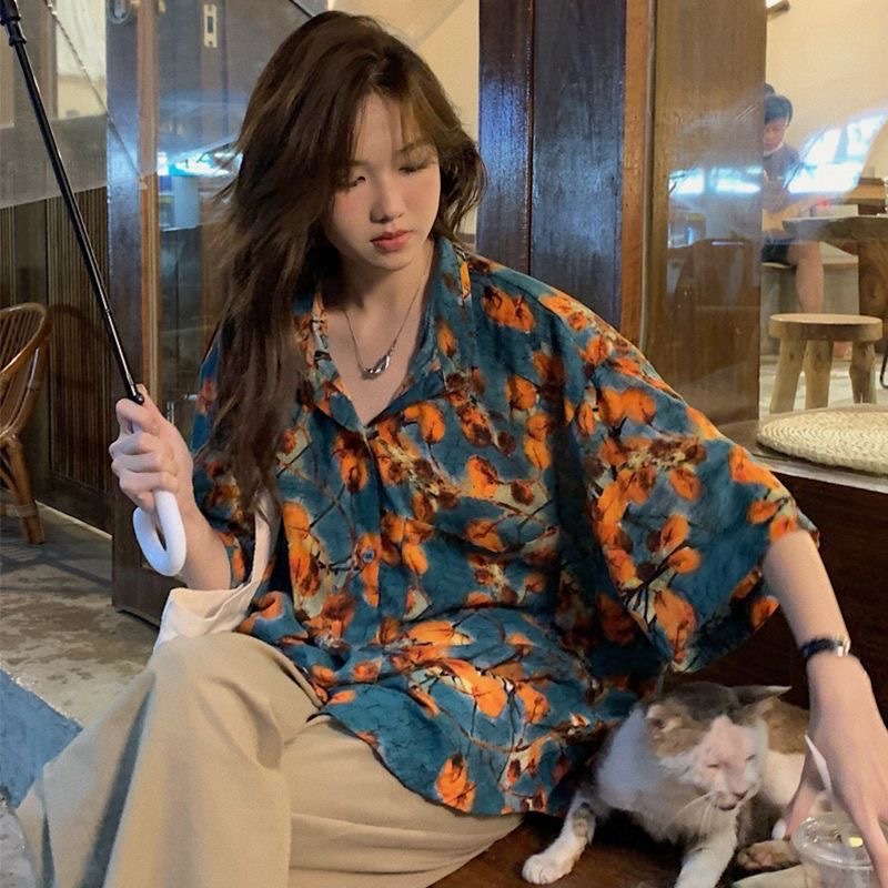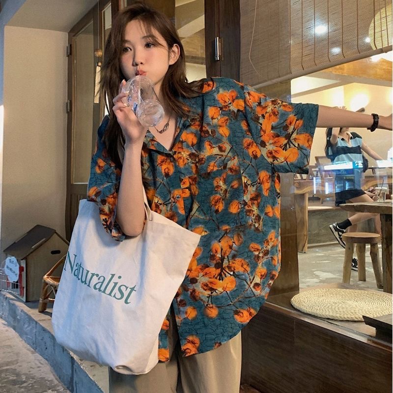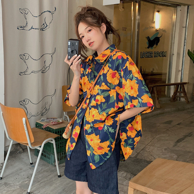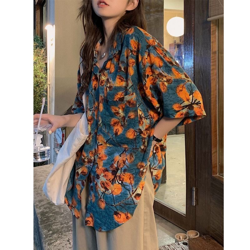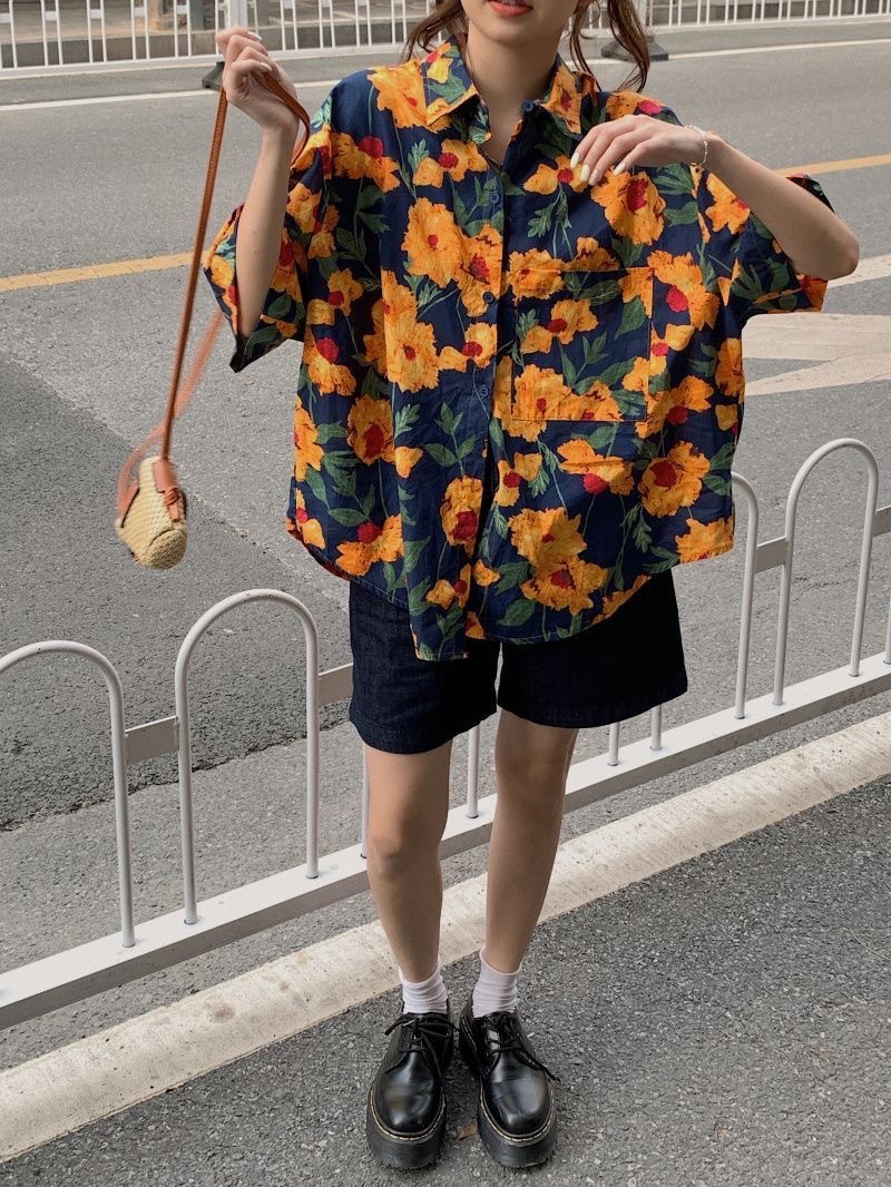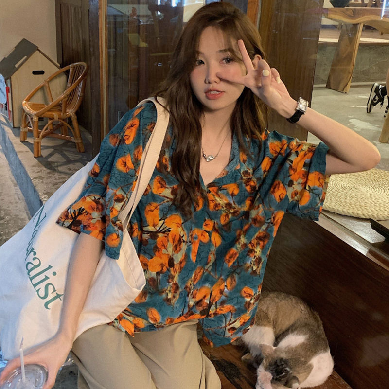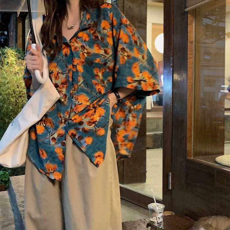 하와이안 포트 스타일 빈티지 꽃 셔츠 탑 여름 세련된 작은 셔츠 프랑스 느슨한 반팔 셔츠스토어 가기