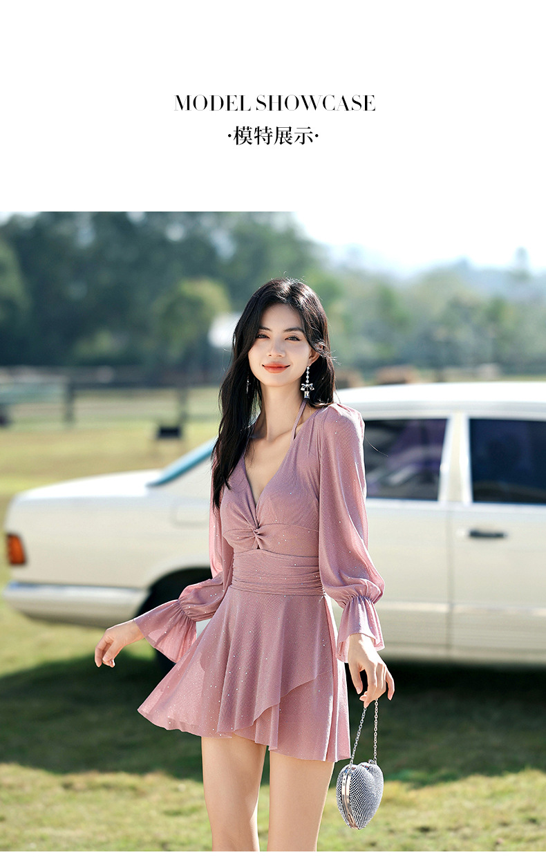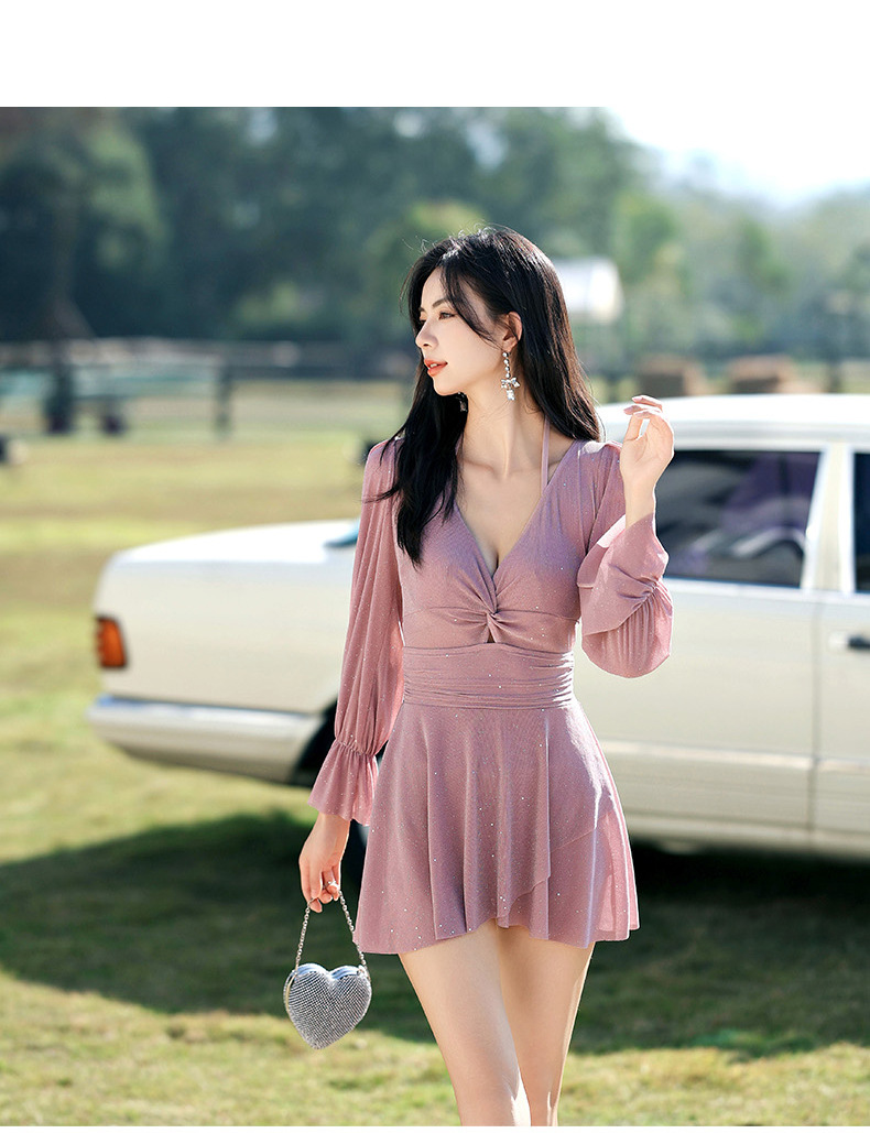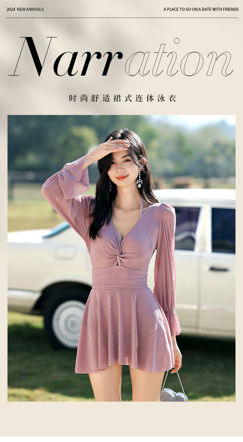 긴팔 원피스 수영복 여성 2024 년 가을 · 겨울 신형 한국식 스커트 스타일 보수적인 배꼽을 덮는 높은 허리 슬리밍 온천 수영복스토어 가기