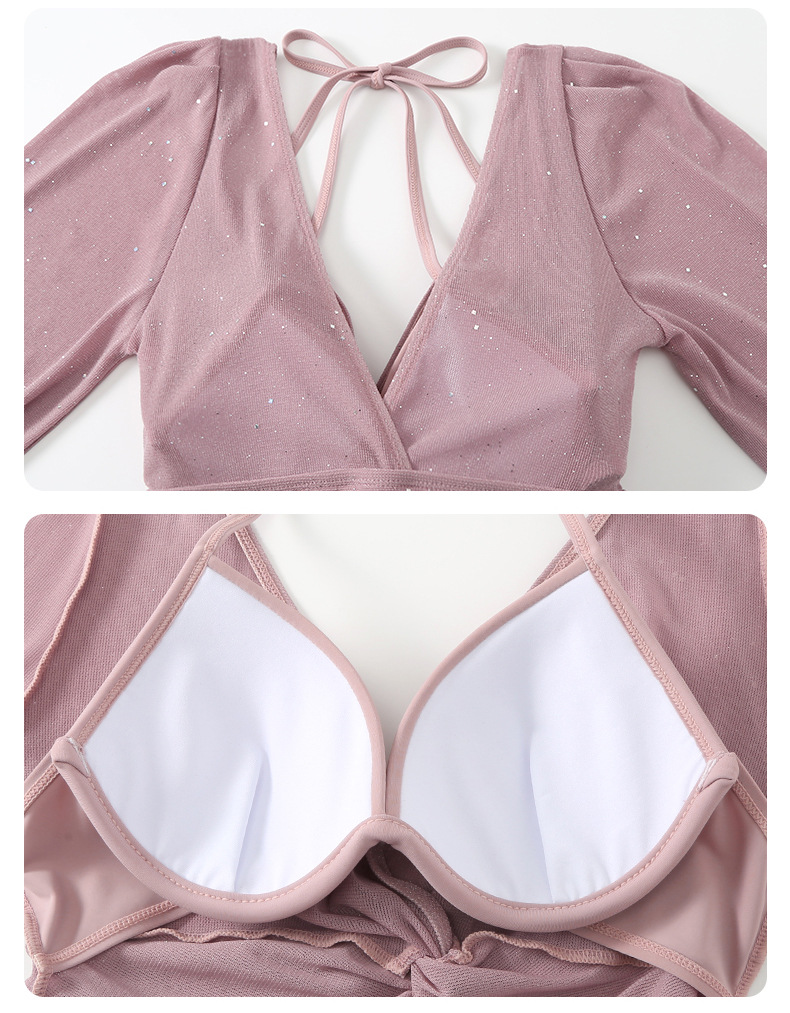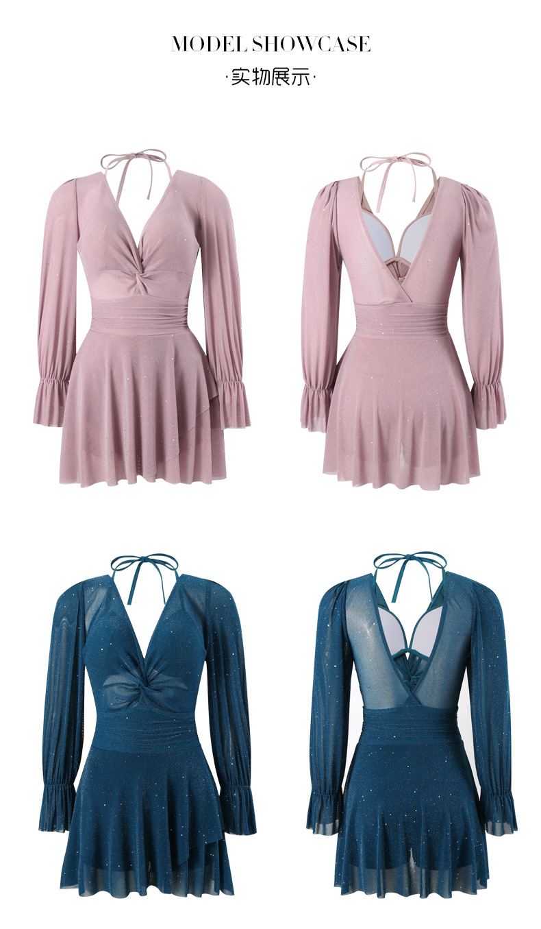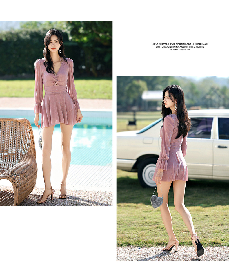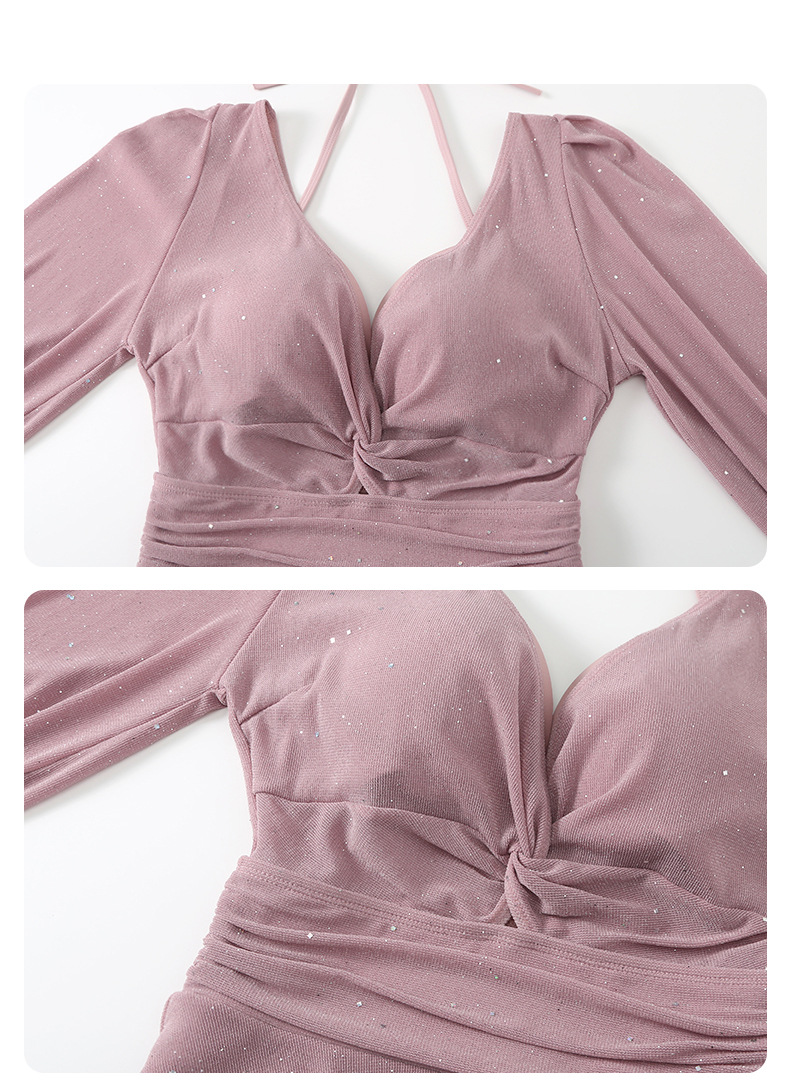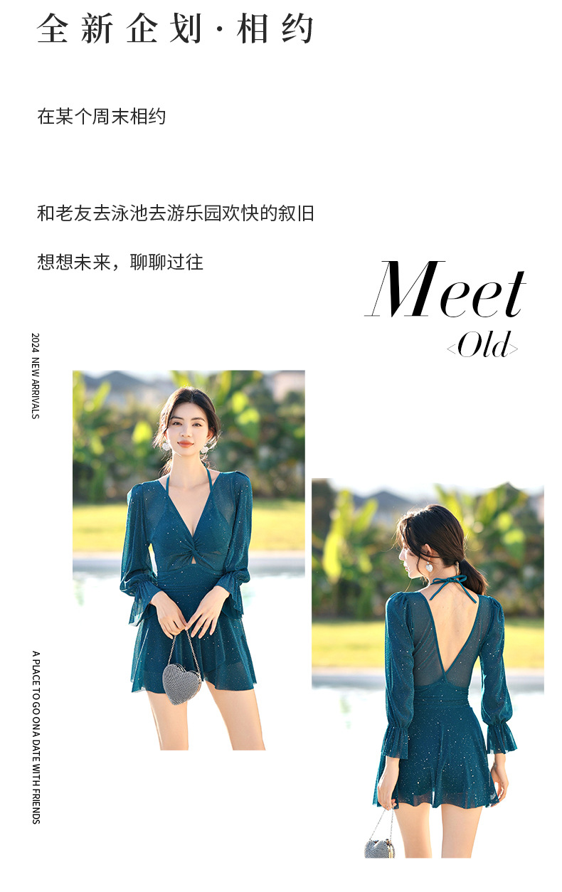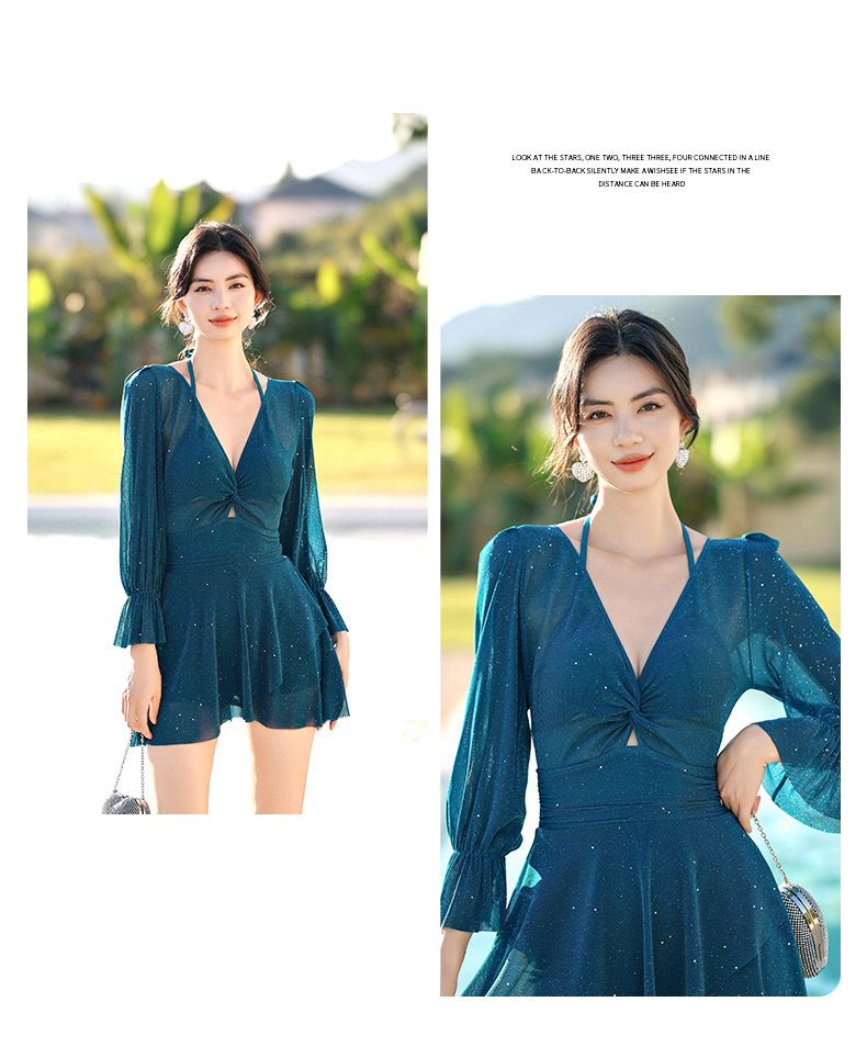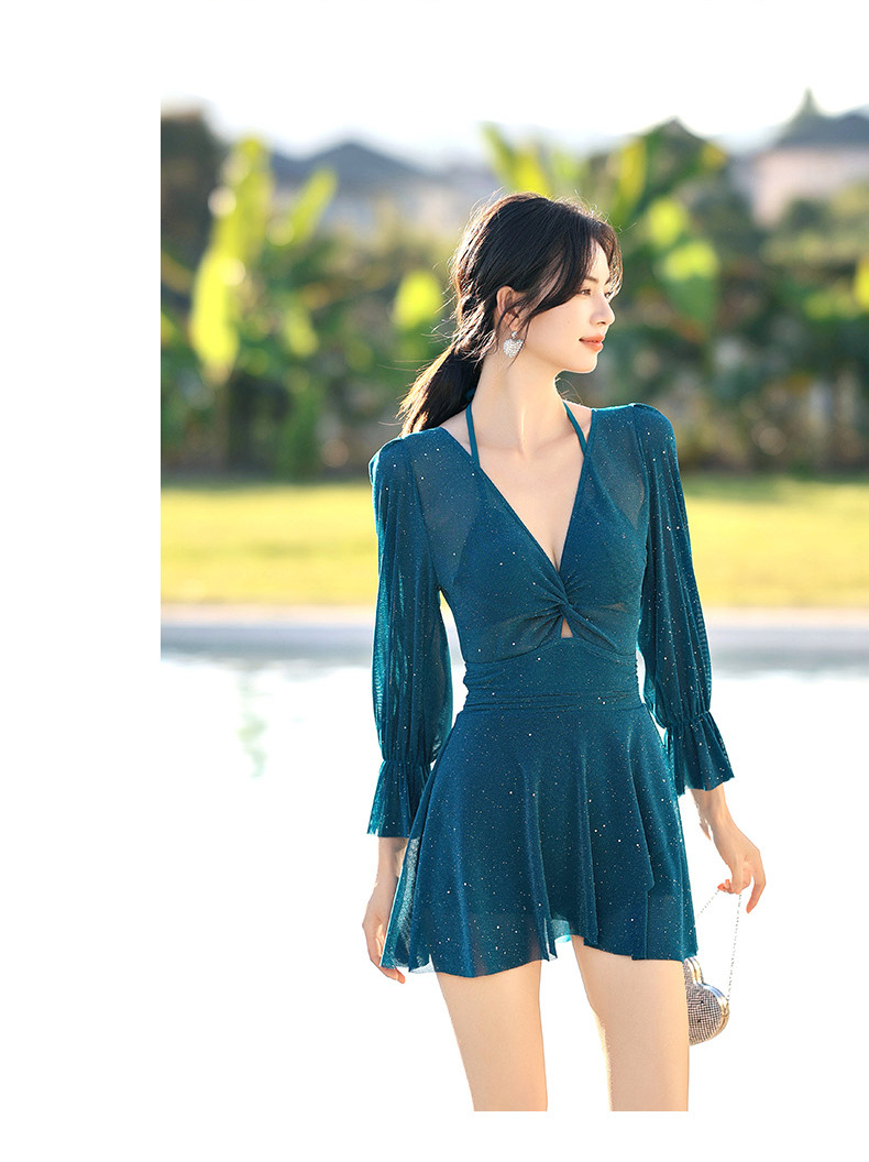 긴팔 원피스 수영복 여성 2024 년 가을 · 겨울 신형 한국식 스커트 스타일 보수적인 배꼽을 덮는 높은 허리 슬리밍 온천 수영복