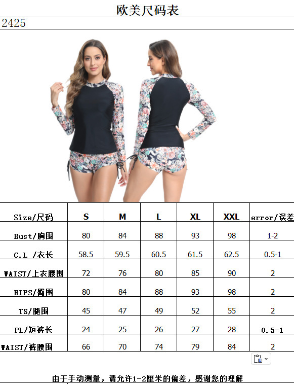 跨境分体印花泳装亚马逊显瘦保守两件式长袖游泳衣欧美女士冲浪服