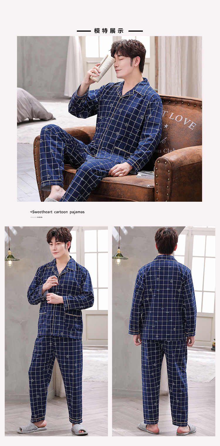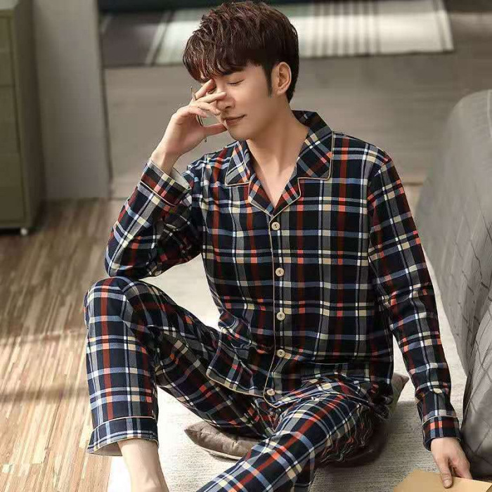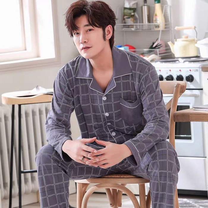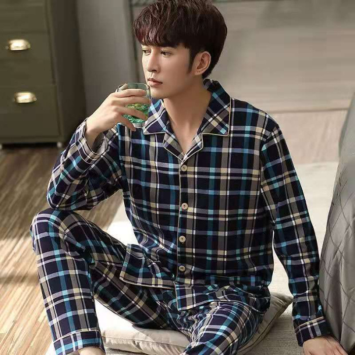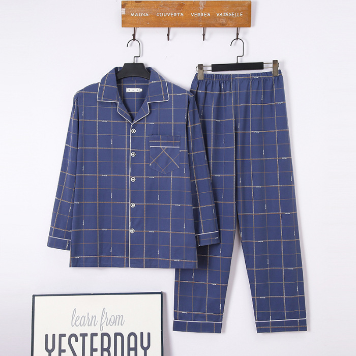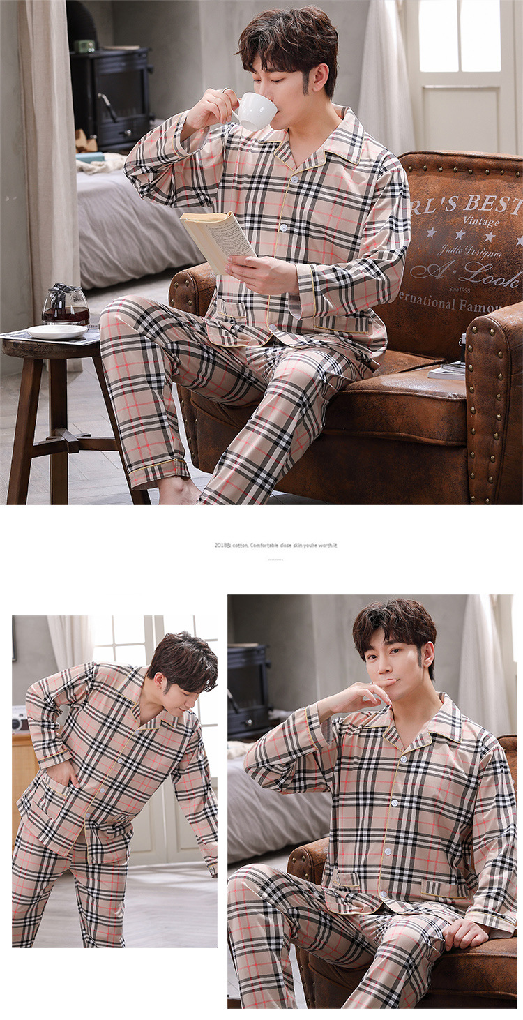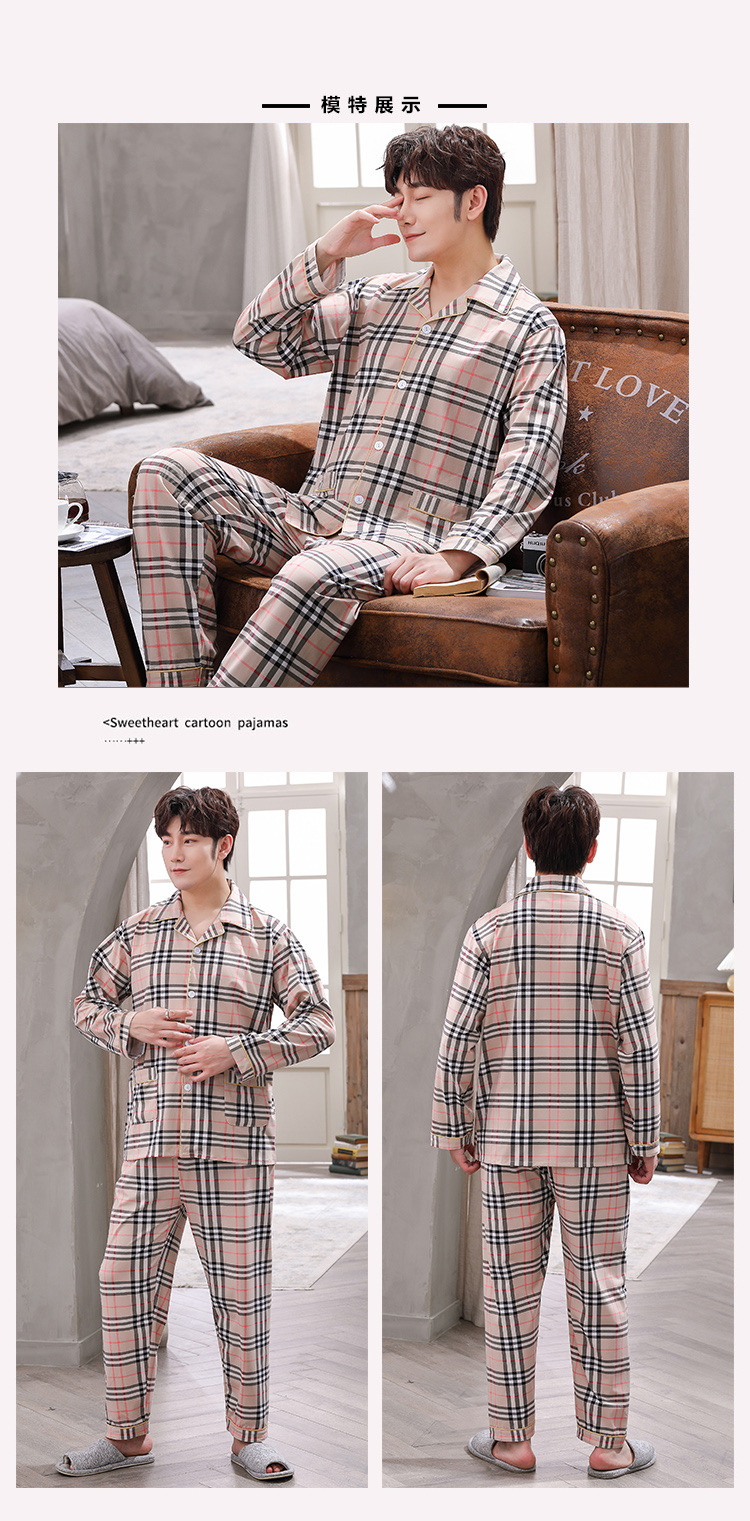 2024 년 새로운 격자 무늬 잠옷 남자의 봄과 가을 긴 소매 면화 플러스 사이즈 가을과 겨울 남자 겉옷 홈 옷스토어 가기