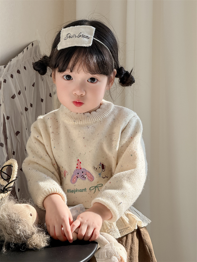 가을 겨울 여아 공주풍 한국 스타일 피부 친화적인 니트 스웨터 여아 레이스 칼라 긴팔 상의 아동복스토어 가기