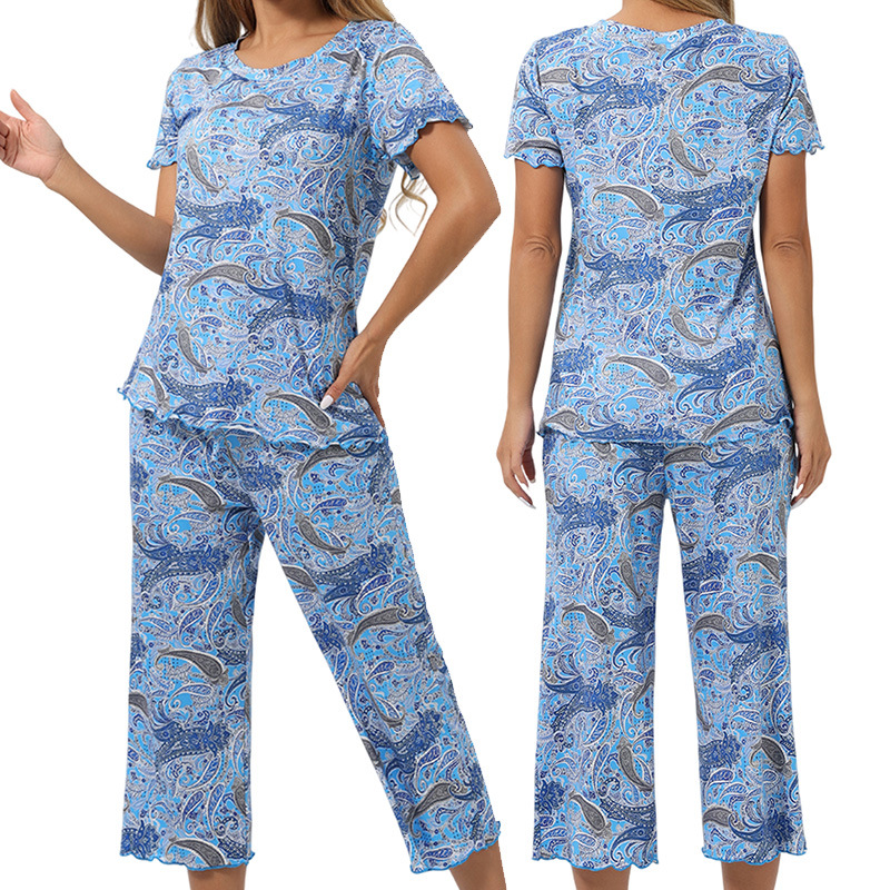 국경을 넘는 인기 여성 프린트 파자마 세트 반팔 칠부 바지 러플 홈웨어 빅사이즈 캐주얼 여성복스토어 가기