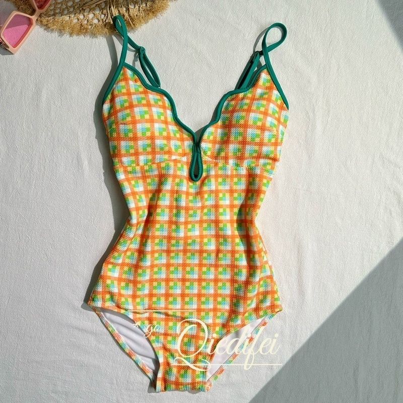 새로운 도파민 해변 수영복 원피스 슬림 핏 슬리밍 일본식 격자 귀여운 소녀의 작은 가슴 온천스토어 가기