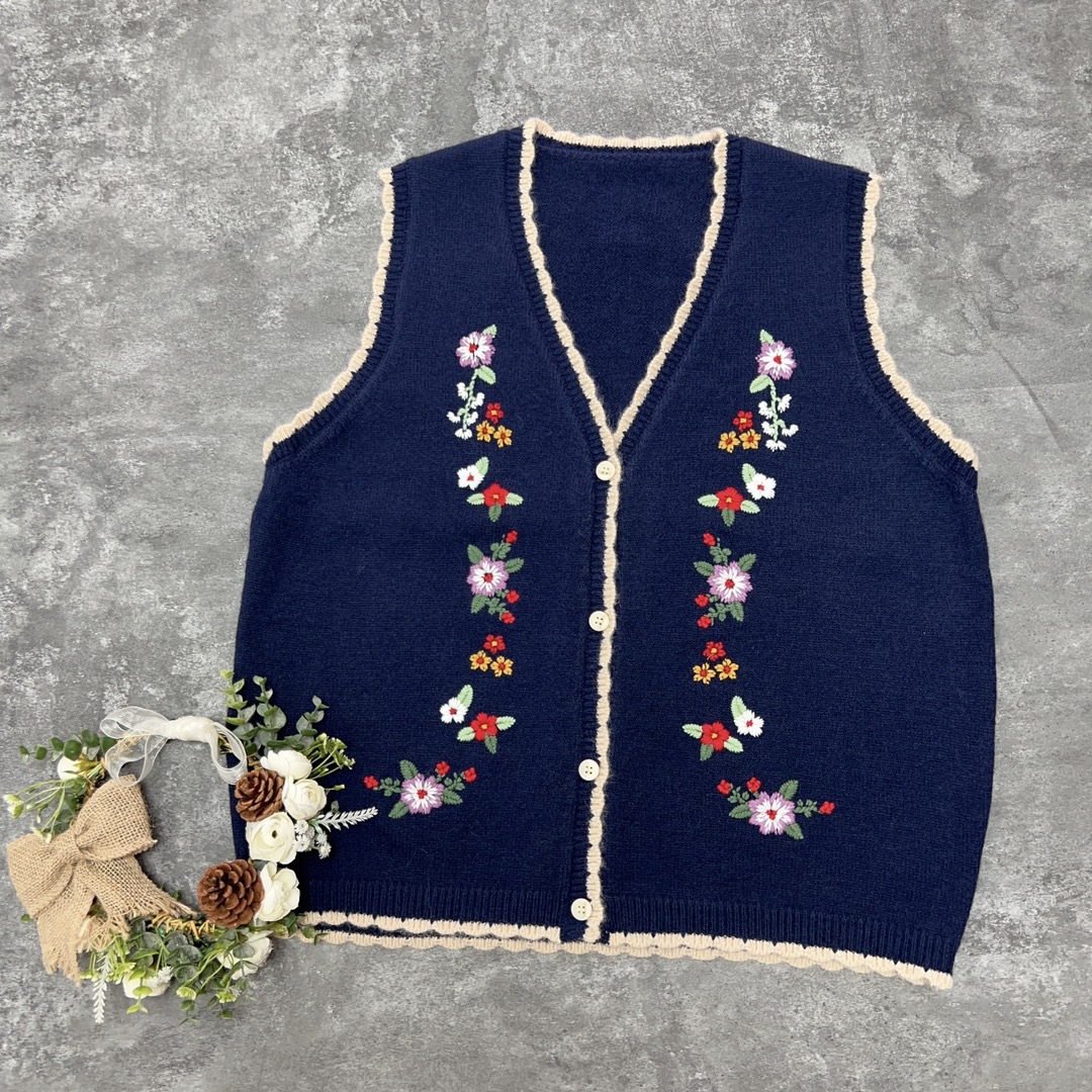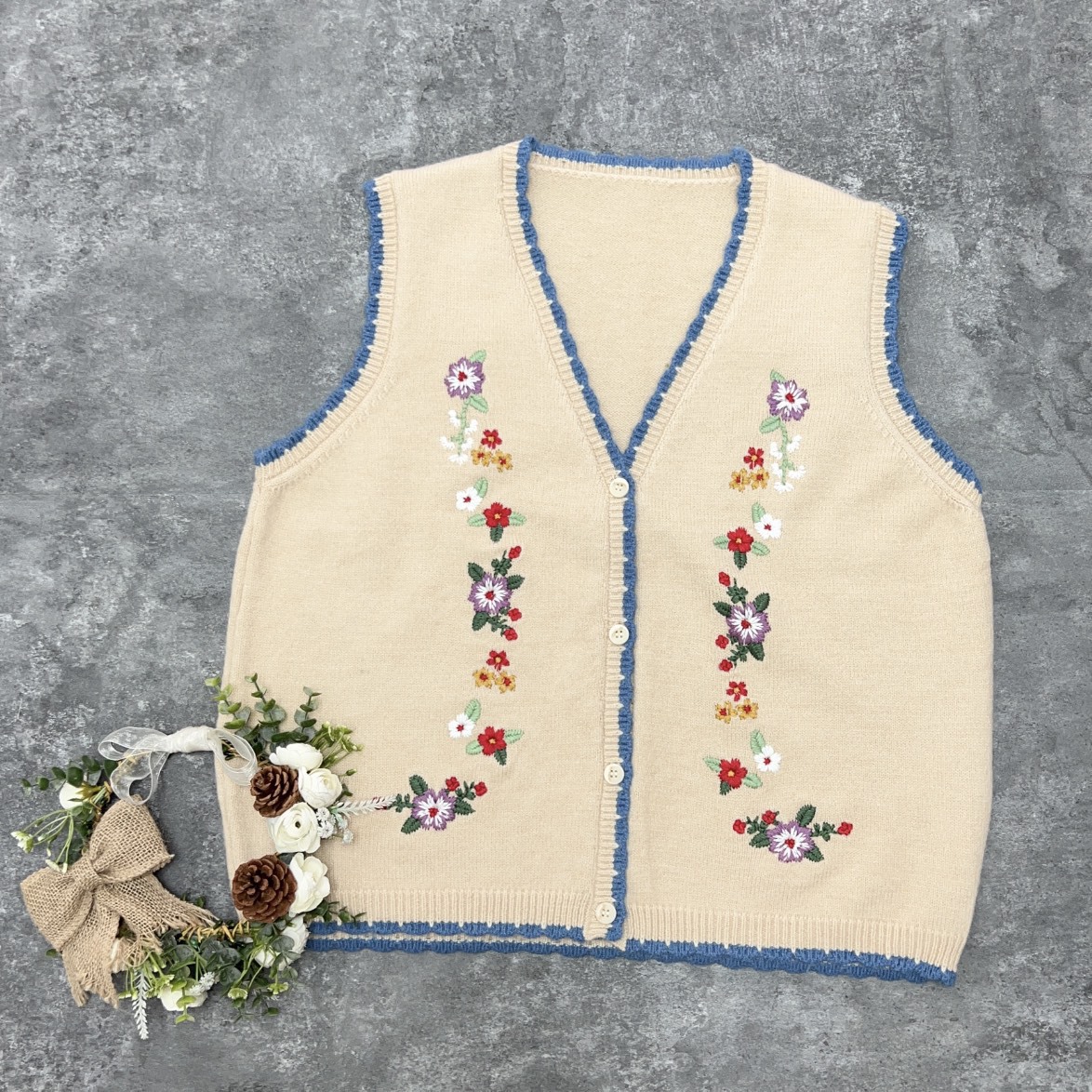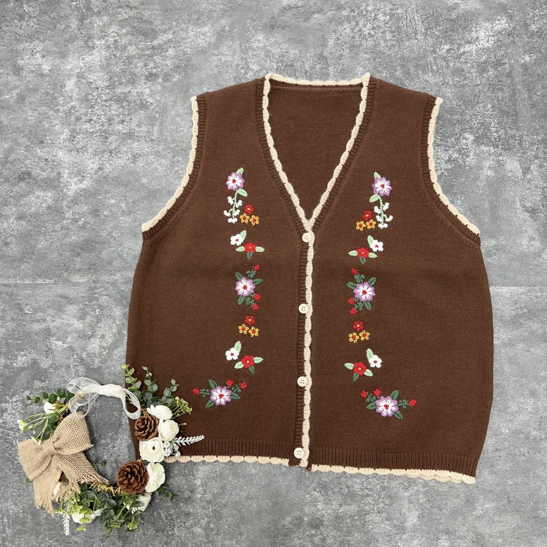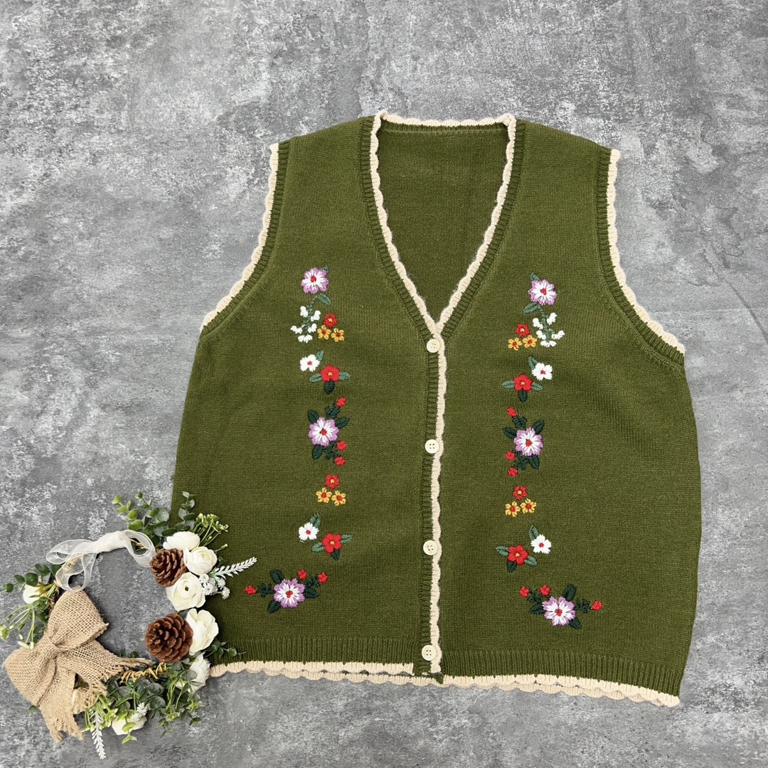 森系绣花v领四色毛线马甲