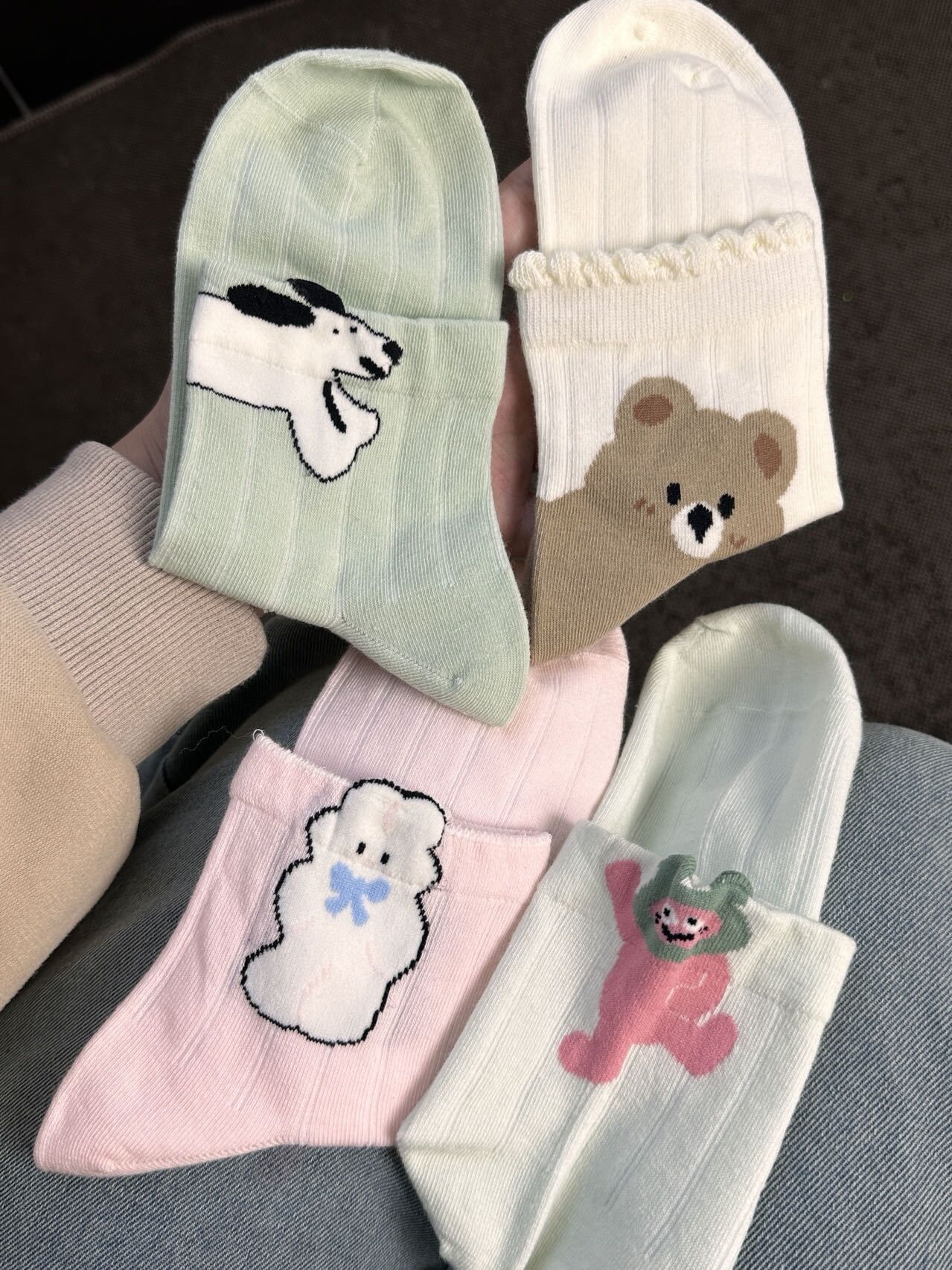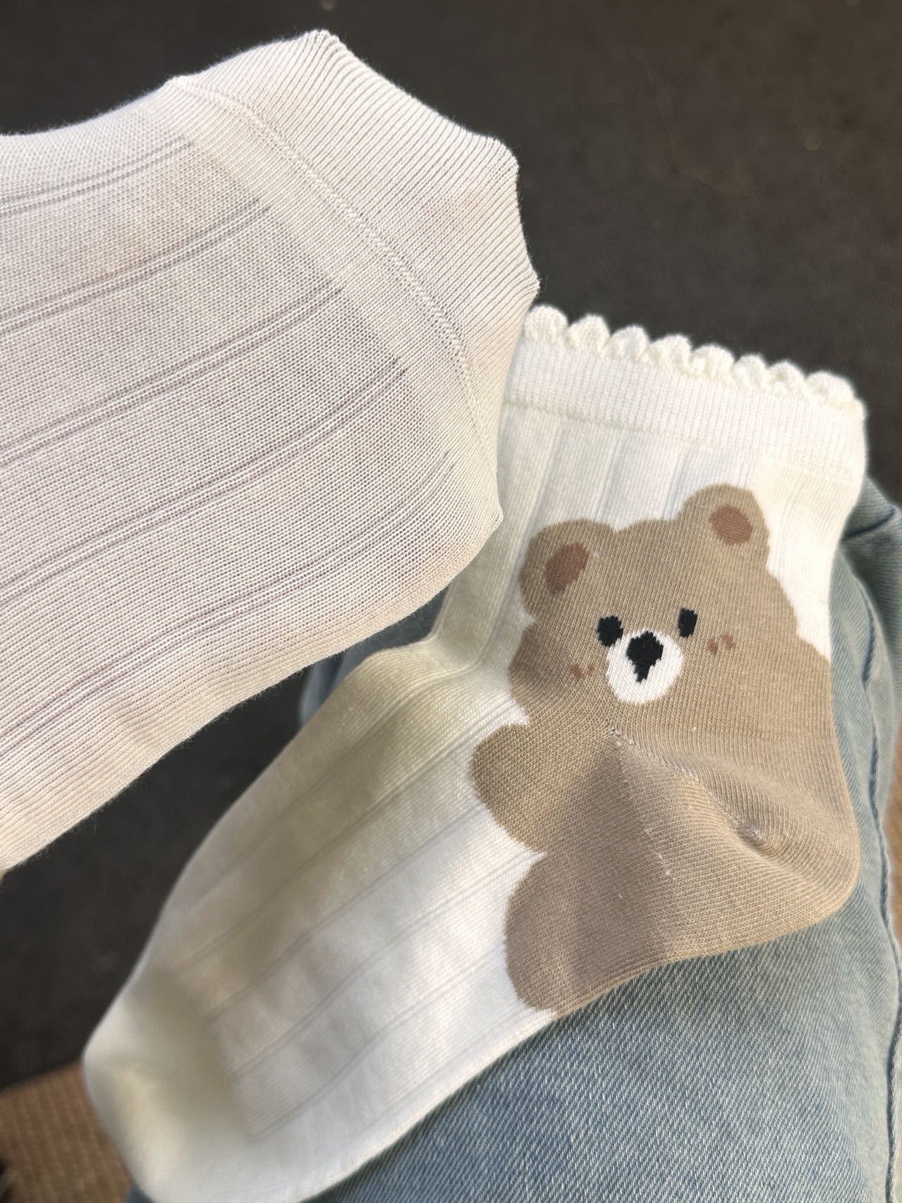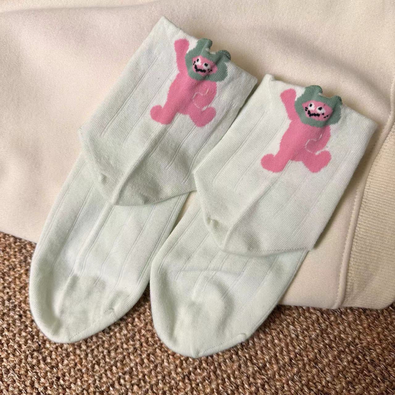 Yuanrun 가족 새로운 봄과 여름 얇은 곰 만화 양말 디자이너 마카롱 컬러 올 매치 코튼 양말 일본 스타일스토어 가기
