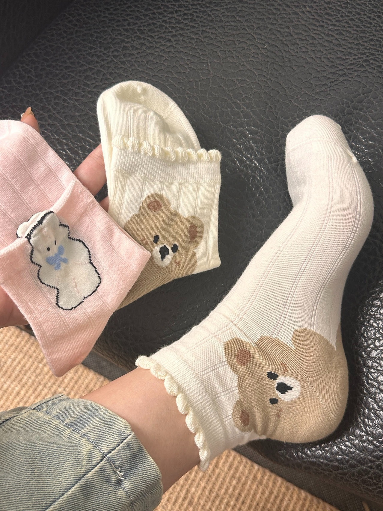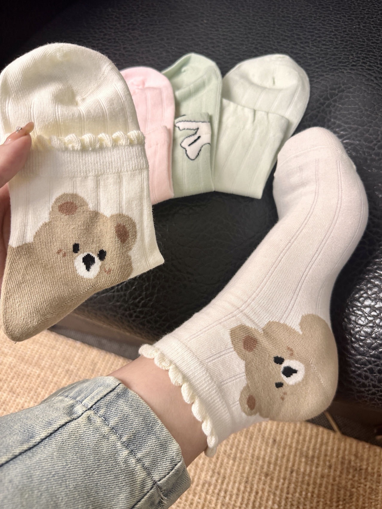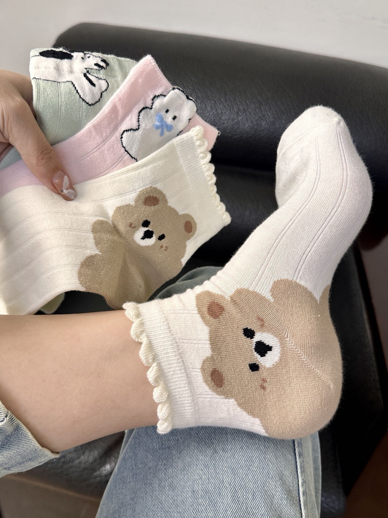 Yuanrun 가족 새로운 봄과 여름 얇은 곰 만화 양말 디자이너 마카롱 컬러 올 매치 코튼 양말 일본 스타일