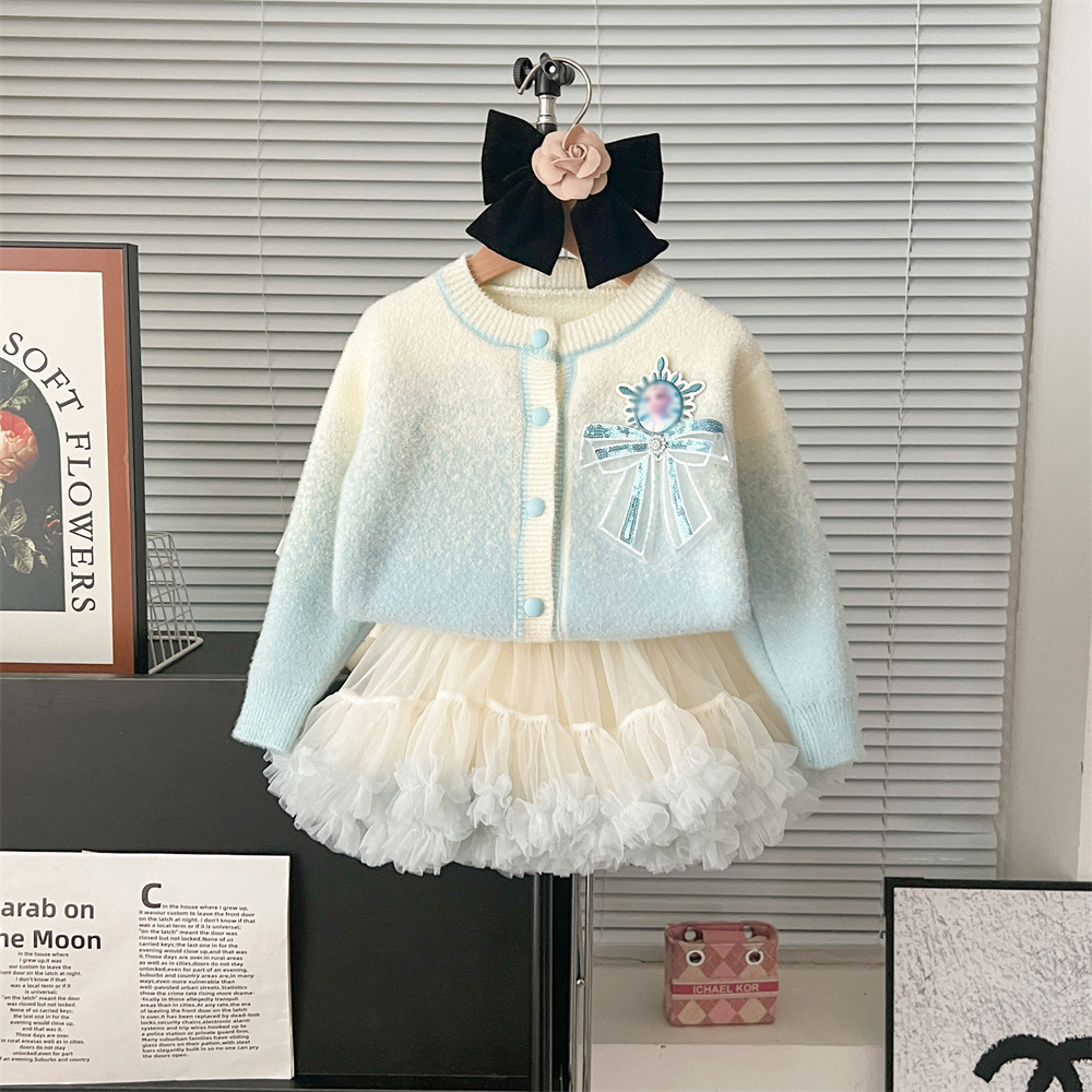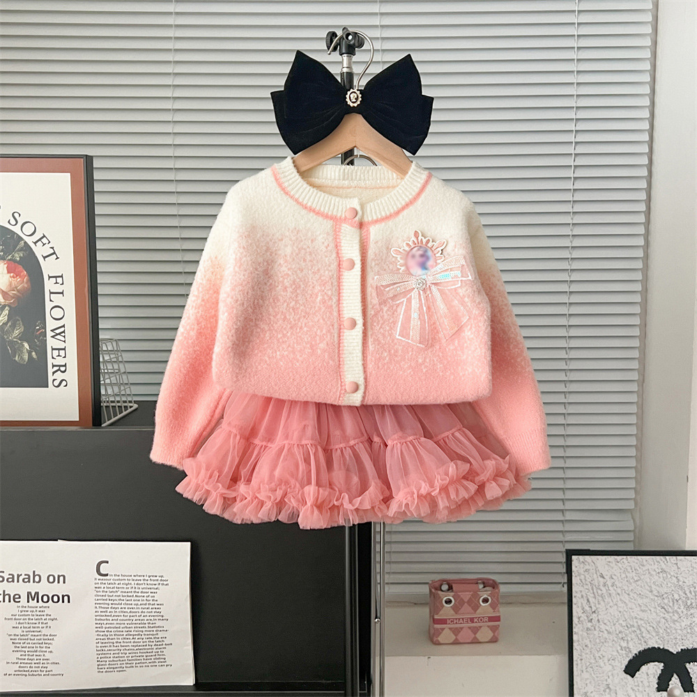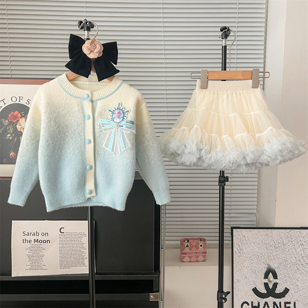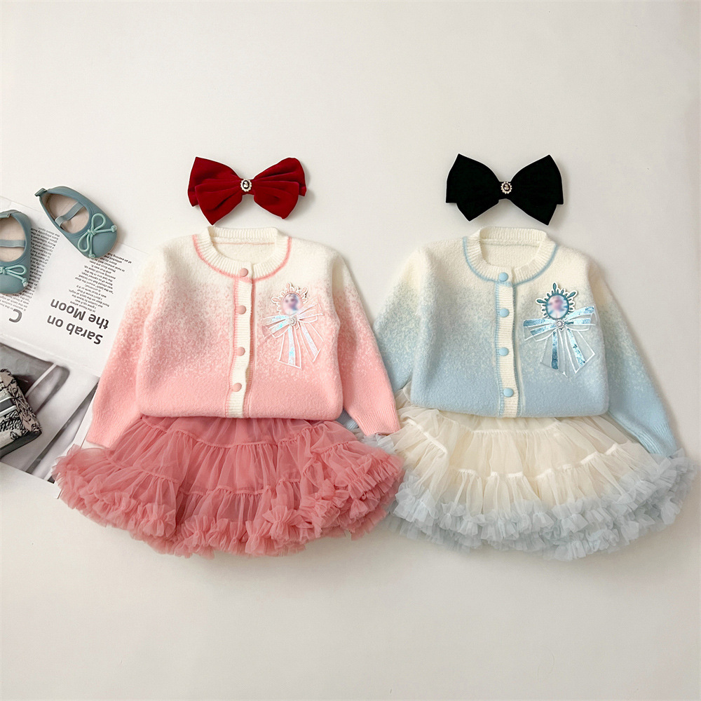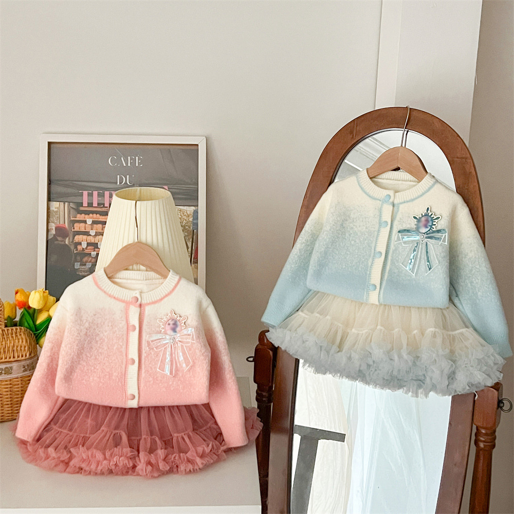 2024 가을과 겨울 새로운 교수형 염색 스웨터 코트 투투 스커트 세트 중소 어린이 그라디언트 공주 아이샤 스웨터 세트