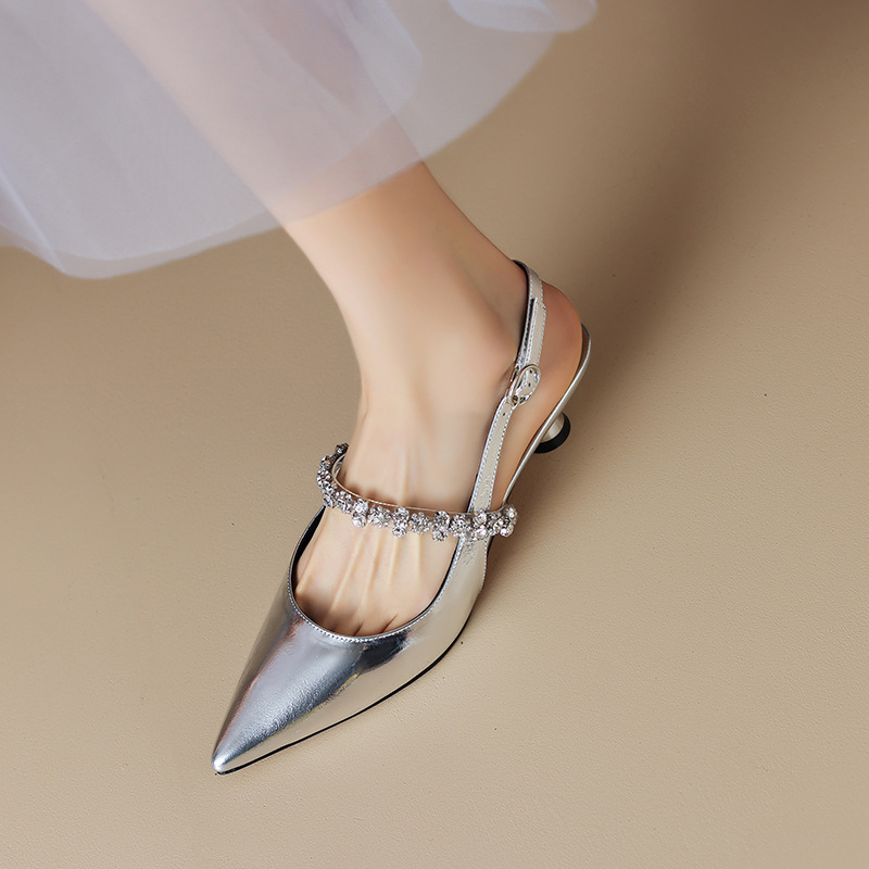봄과 여름 2024 새로운 프랑스 스타일의 모조 다이아몬드 부드러운 가죽 실버 빈 메리 제인 신발 작은 발 뒤꿈치로 덮인 발가락 샌들