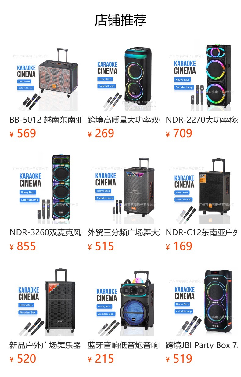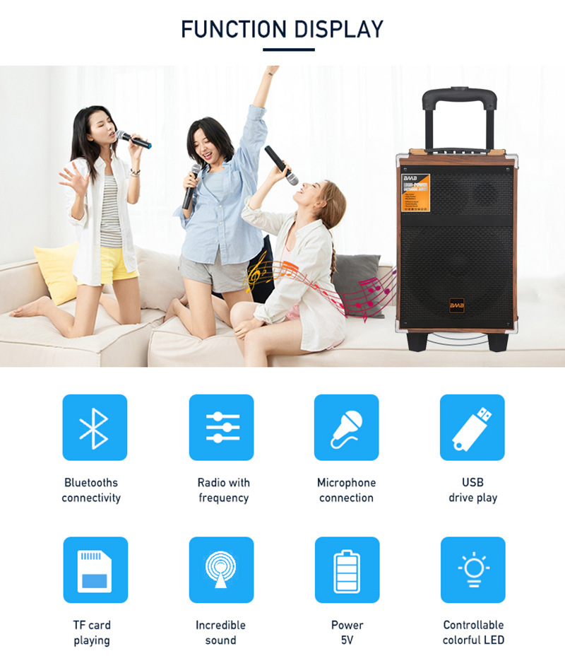 功能:蓝牙,收音,U盘,TF卡,AUX音频,MIC,MIC.PRI,LED显示屏,TREBLE,BASS,ECHO,AUDIO,无线双麦克风,遥控器,拉杆(带轮子)