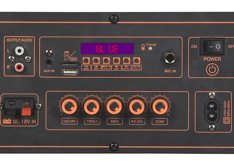 Function: Bluetooth, radio, USB flash drive, TF card, AUX audio, MIC, MIC.PRI, LED display screen, TREBLE,BASS,ECHO,AUDIO, Wireless dual microphone, remote control, lever (with wheels)