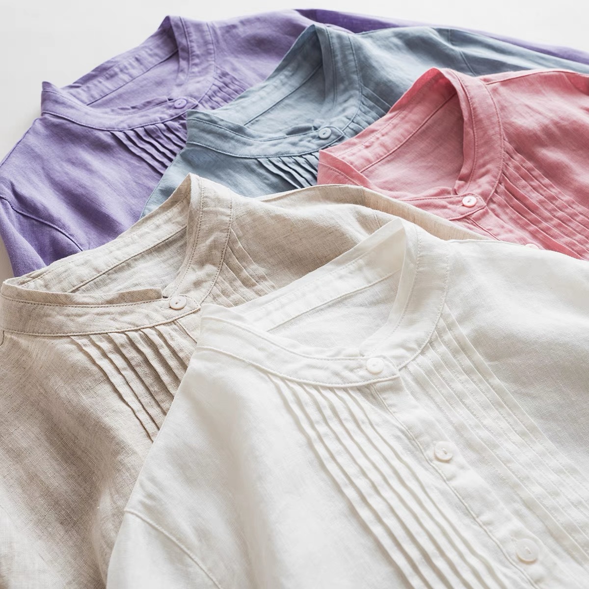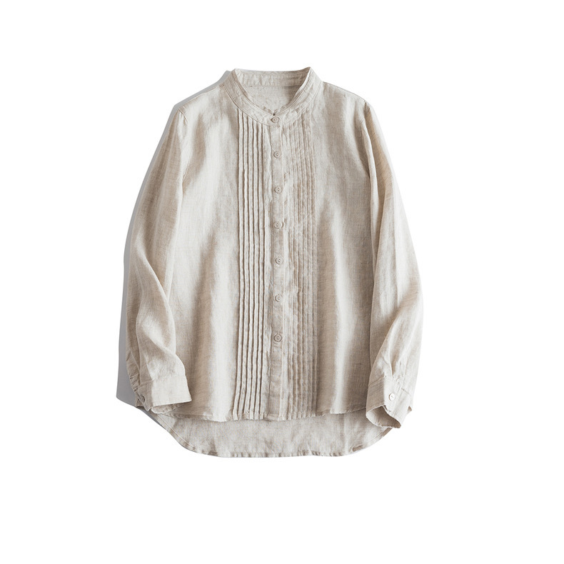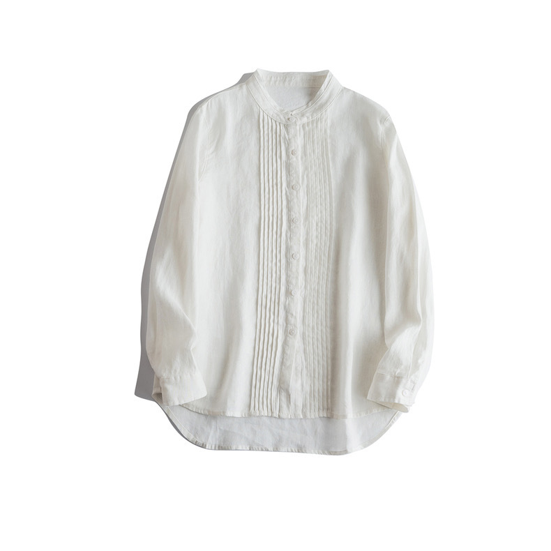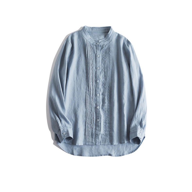 여성을위한 주름 전선과 미들 리넨 칼라 긴팔 캐주얼 예술적 셔츠로 하루 동안 간단한 통근